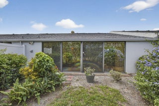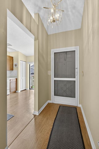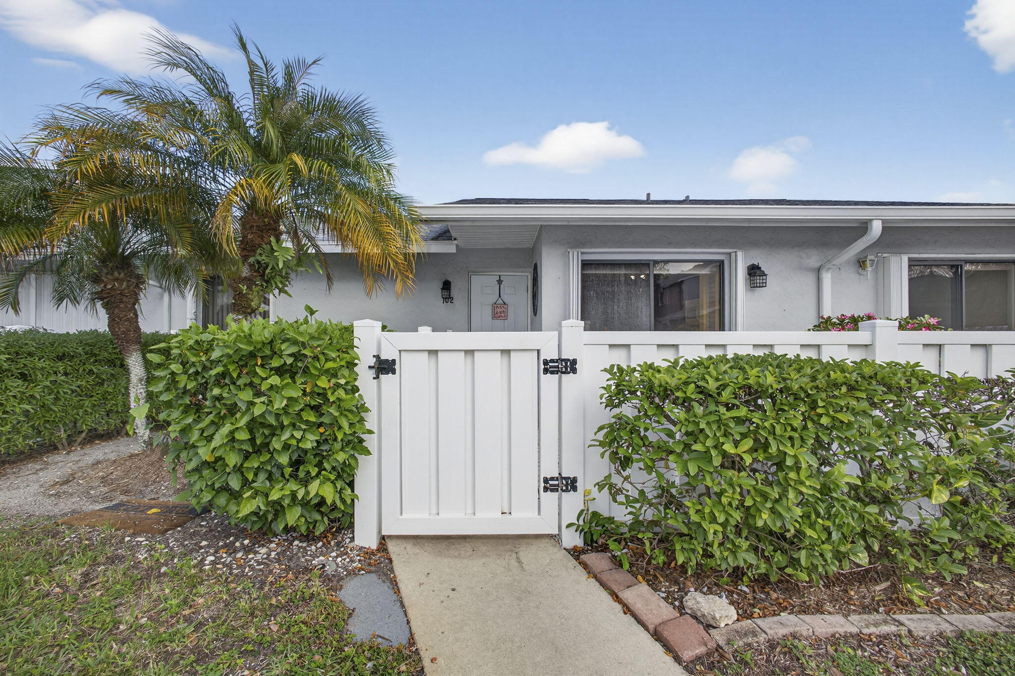 Welcome to The Arbours, a 55+ community that includes a clubhouse, pool, & tennis. This charming 2-bed, 2-bath single story villa features a split floor plan designed for comfort and privacy. Enjoy your morning coffee/evening sunsets on the front porch. The kitchen offers space for a cozy table, along with an updated dishwasher and fridge 1 years old. Vaulted ceilings w/ solar light flow through the, dining/living areas, creating an open and airy feel. The home features laminate wood flooring throughout, complemented by a tiled and enclosed patio with sliding glass doors, w/ A/C vent, utility closet with washer/dryer included. The tall hedges behind the home provide excellent privacy. The primary bedroom has a walk-in closet, & private en-suite bathroom.