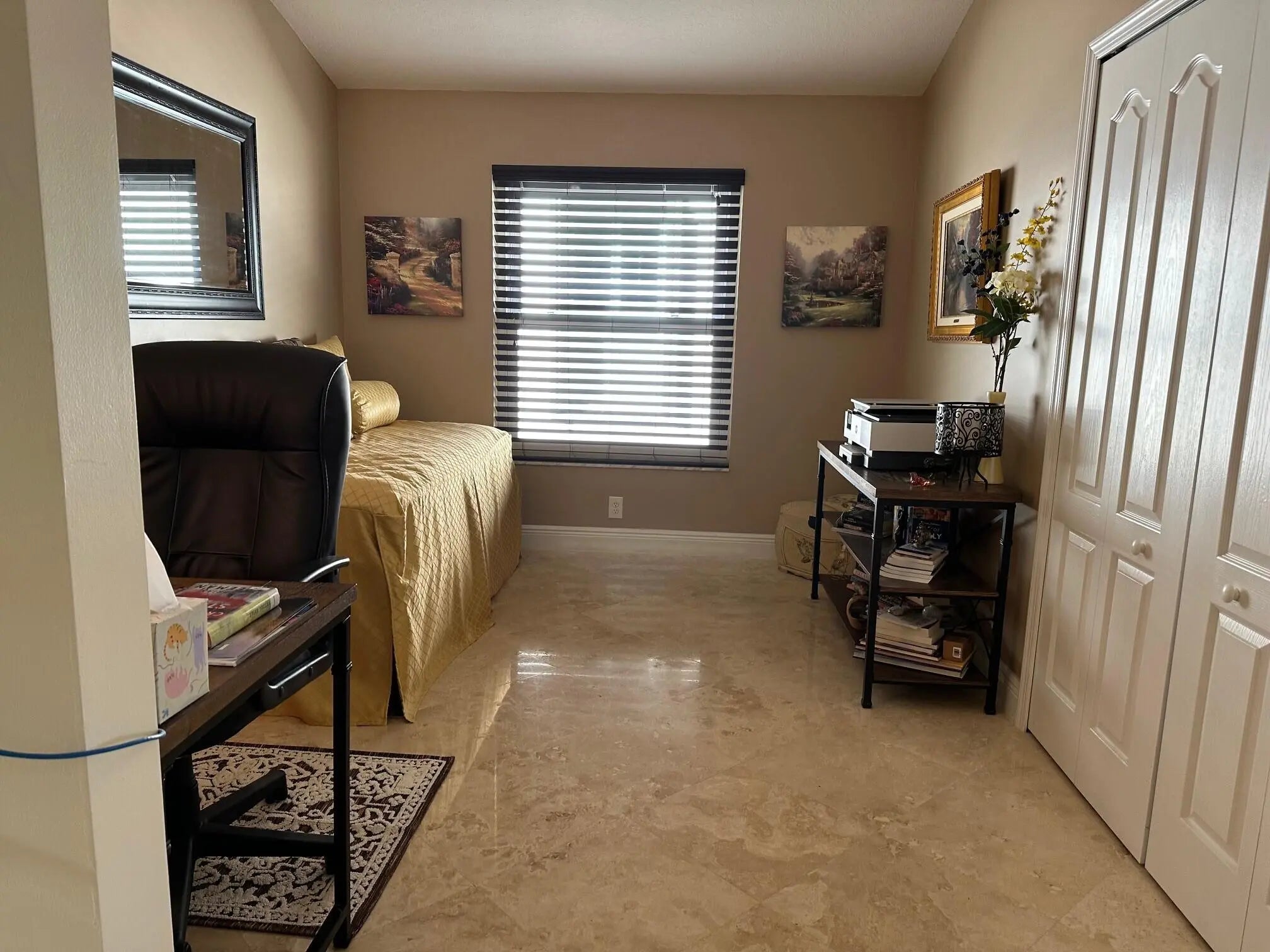 Price Reduced to Sell! Beautifully updated 3-bedroom, 2-bath split-bedroom home with 2 car garage, featuring an open floor plan with high vaulted ceilings. Located in a desirable small, quiet, gated community.Home offers full hurricane protection with impact glass windows and doors. The kitchen includes a large island, farmhouse sink, marble countertops, and stainless steel appliances, including a gas stove! Home also has a gas water heater.Continuous Travertine flooring extends throughout the home. Enjoy outdoor living with a screened-in patio and fenced backyard--perfect for relaxing, entertaining, or playtime with children or pets.