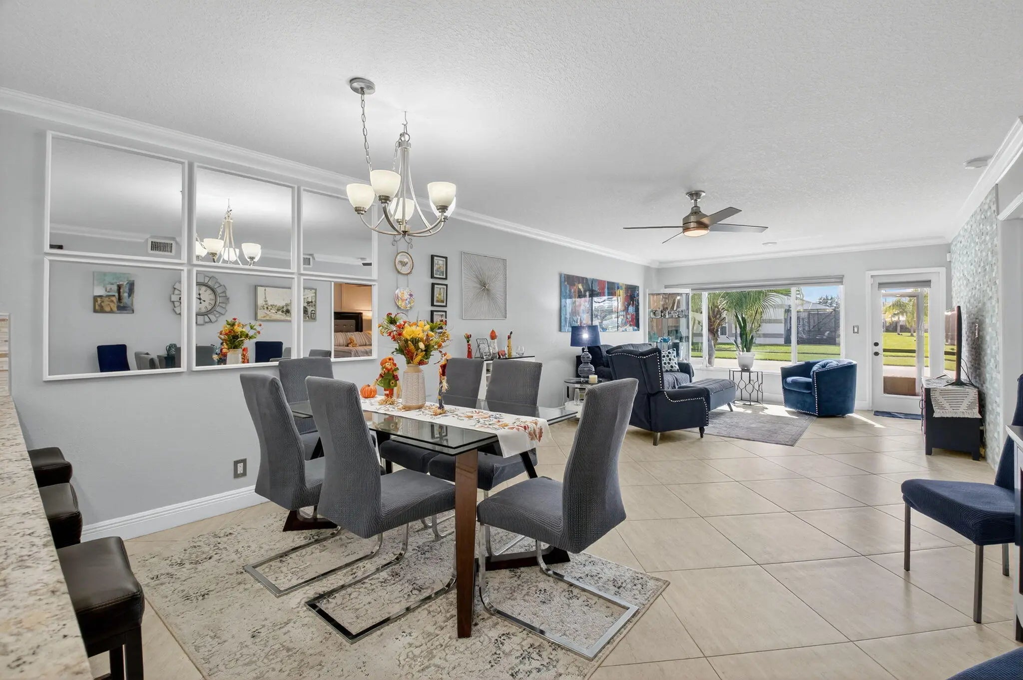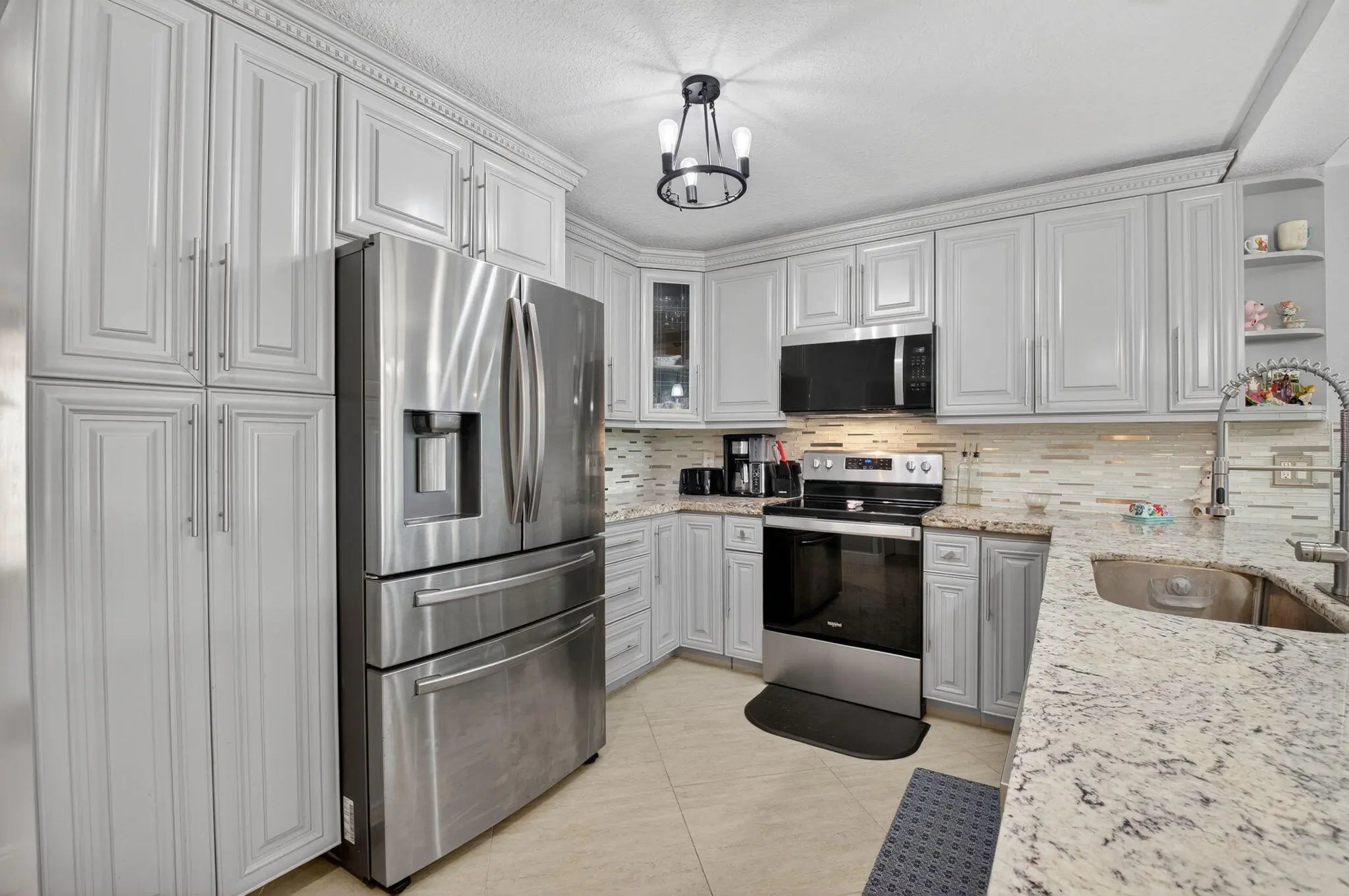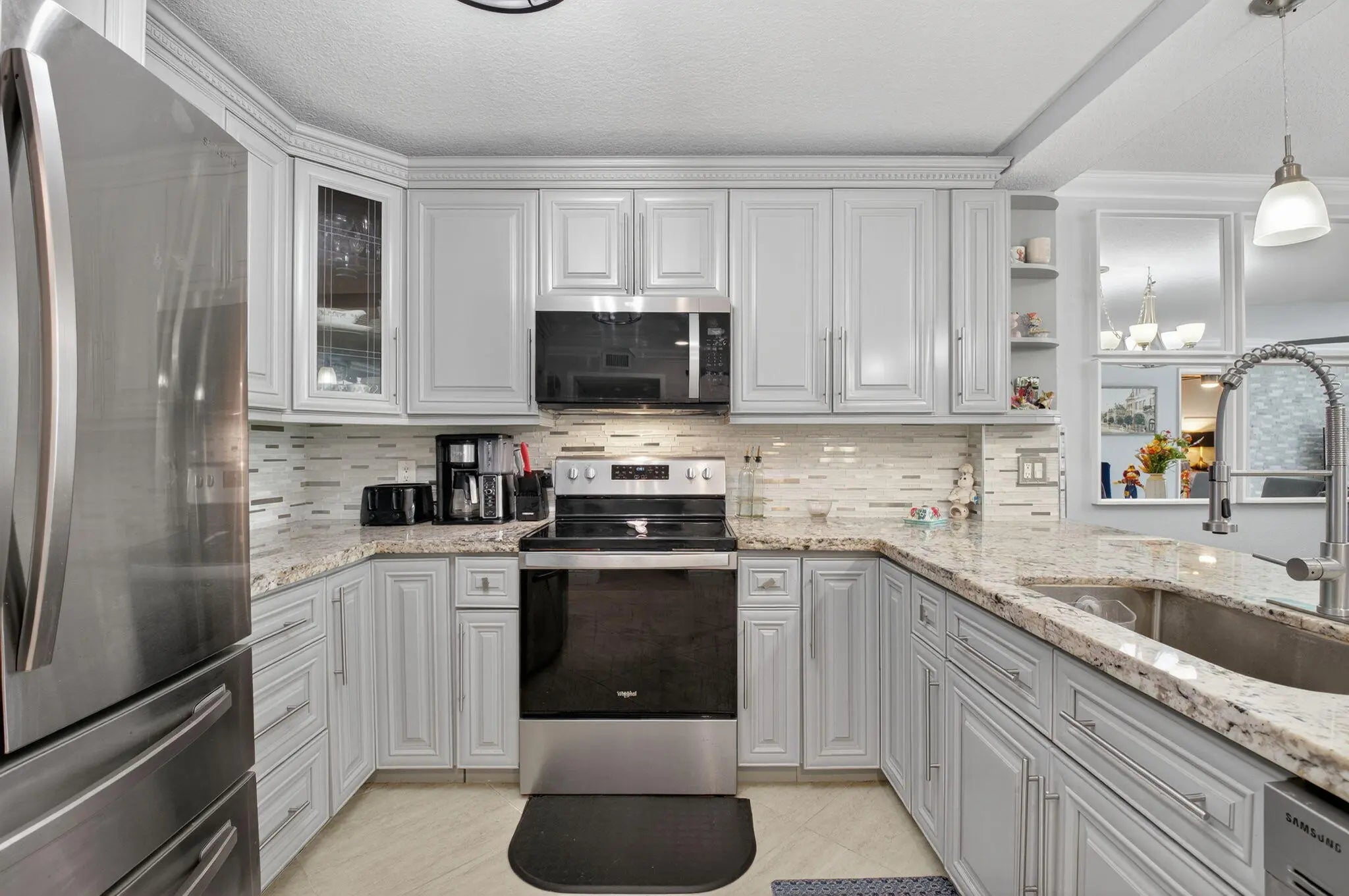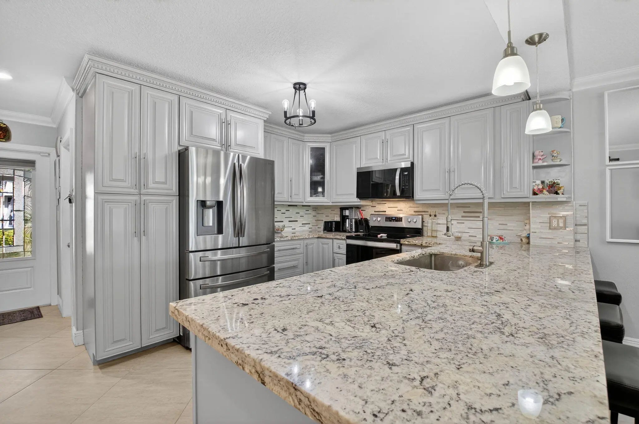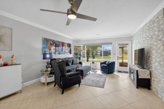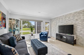 Discover your own tranquil retreat in this beautifully updated 2-bedroom, 2-bath villa with a magnificent lake view. Imagine enjoying your morning coffee or evening cocktail from the covered back patio while taking in the breathtaking scenery. Inside, the open-concept kitchen features sleek granite countertops and stainless steel appliances, with the sink and faucet recently upgraded just six months ago. The living area boasts elegant tile flooring and is centered around a stunning real brick accent wall, adding character and warmth. Both bedrooms offer modern wood-look flooring for a clean and cohesive look. Updated bathrooms, a barn door that provides a private hallway to the laundry area create a seamless living experience. With high-impact windows and doors and a