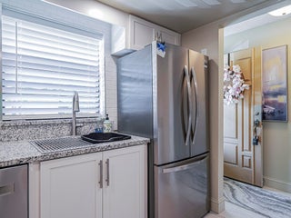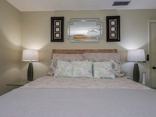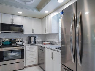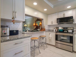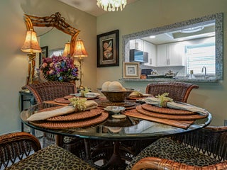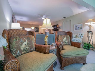 Being sold furnished, this completely remodeled split BR plan 2/2 has nearly 1150 sq ft. Gorgeous kitchen with stone counters and stainless steel --all newer appliances and fixtures. Stone tile flooring throughout. Spacious living-dining area expands to enclosed glassed in porch with view or garden area. Large primary BR with updated bath - 2nd BR with queen bed and full bath in hall. Designer touches throughout! Oak Park Terrace is just 2 miles to beaches and closer to shops and stores. Complex has heated pool and tennis. 55+ with no pets allowed -- coin op laundry.