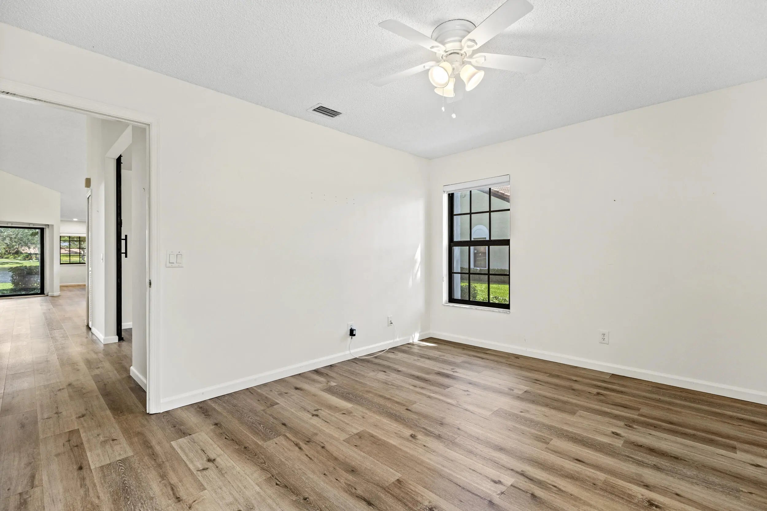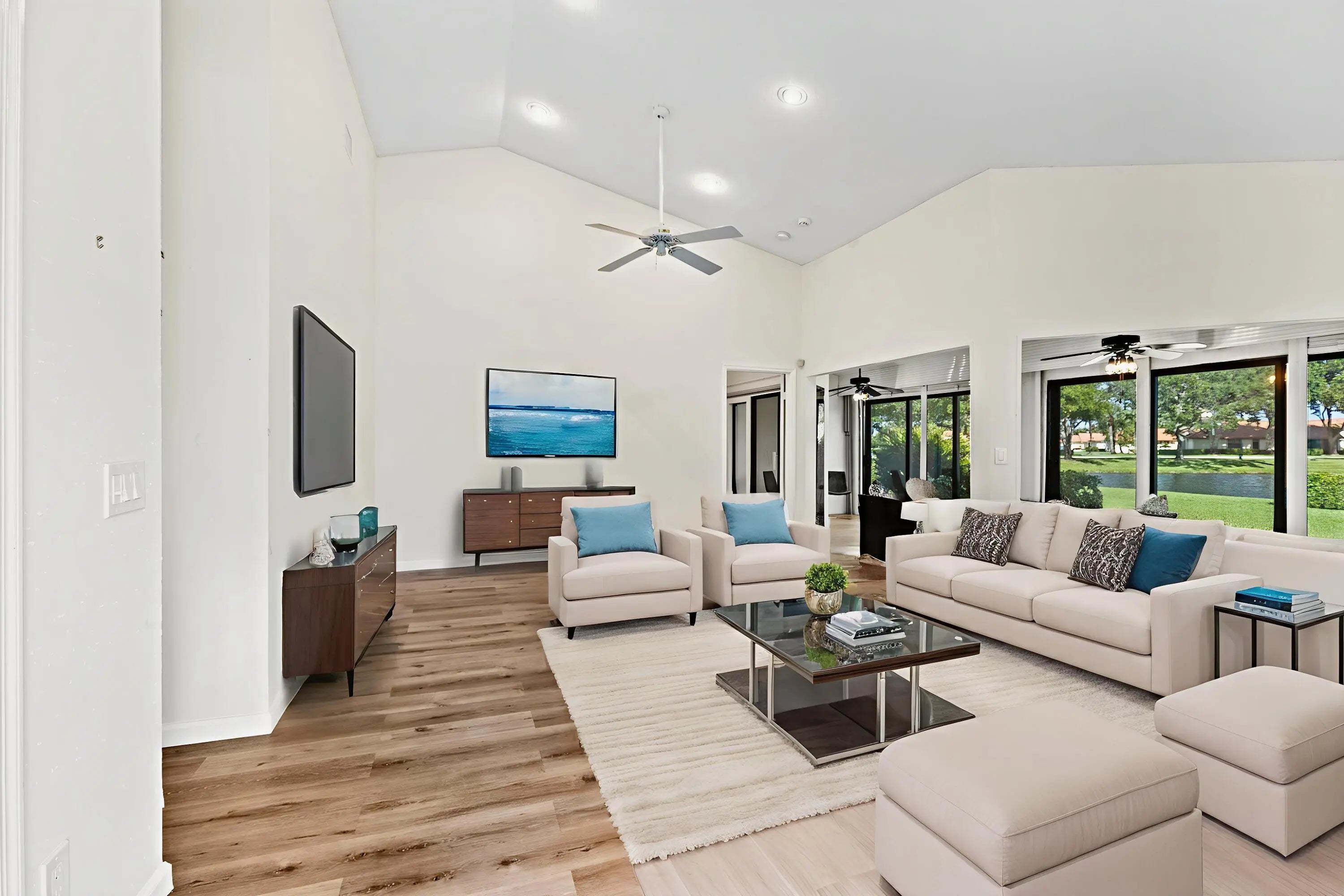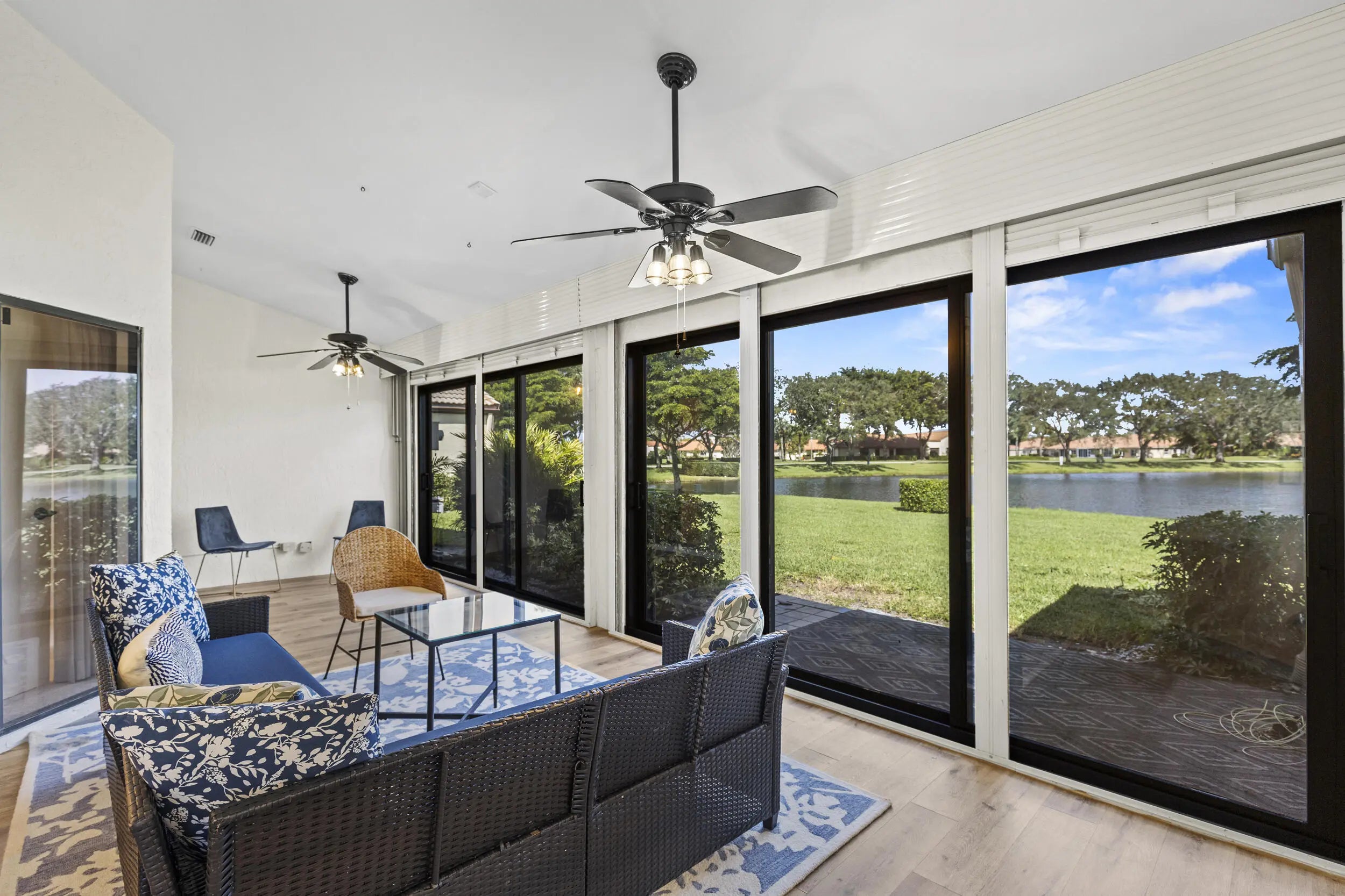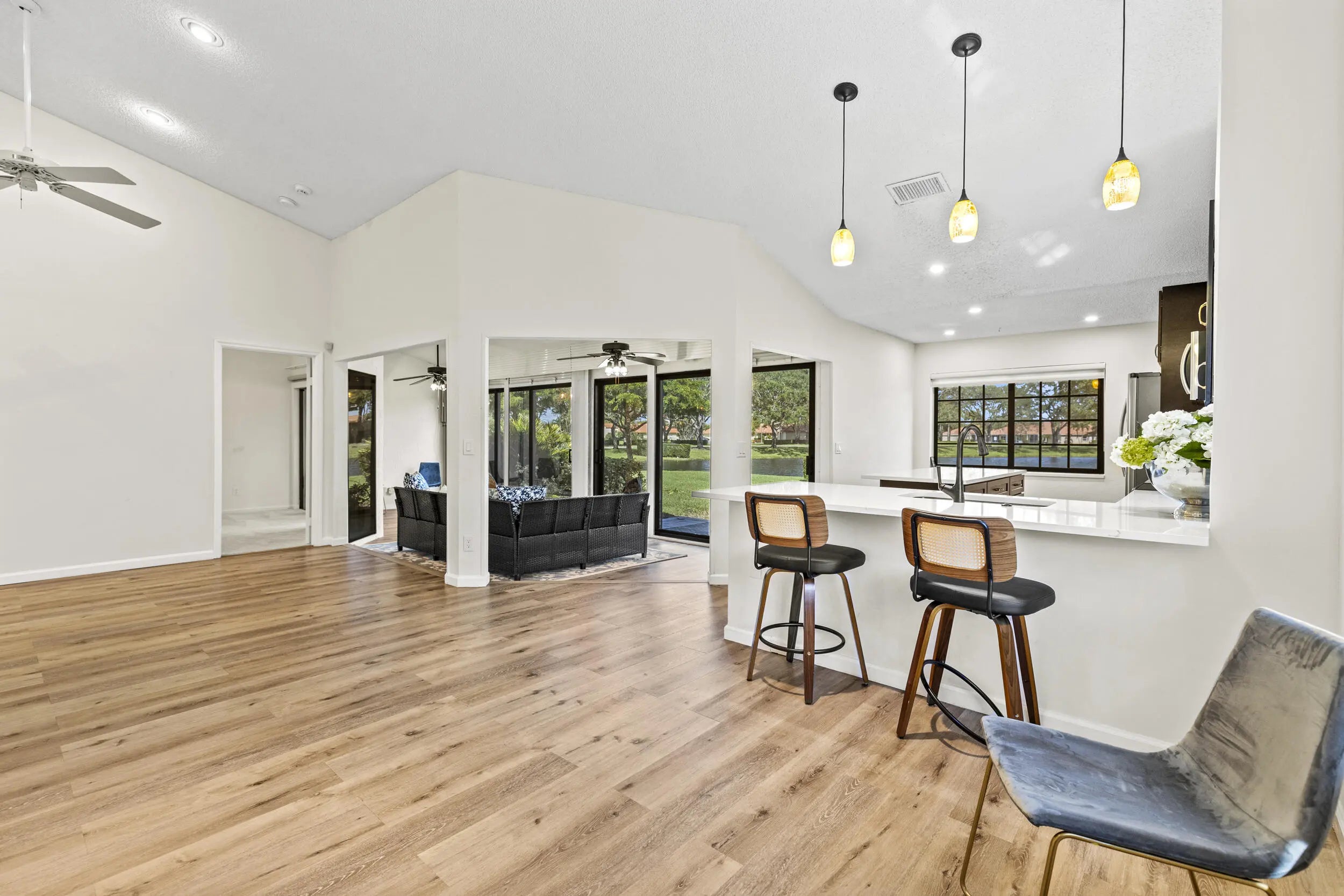 Welcome to this beautifully maintained 3-bedroom, 2-bath villa with stunning long lake views in a desirable 55+ community! Enjoy peace of mind with all-new impact windows, elegant Hunter Douglas blinds, and a recently renovated kitchen that perfectly blends style and functionality. New flooring throughout adds a fresh, modern touch. The community offers a resort-style lifestyle with all the amenities you could want or need--move in and start enjoying the good life! NO MANDATORY MEMBERSHIP