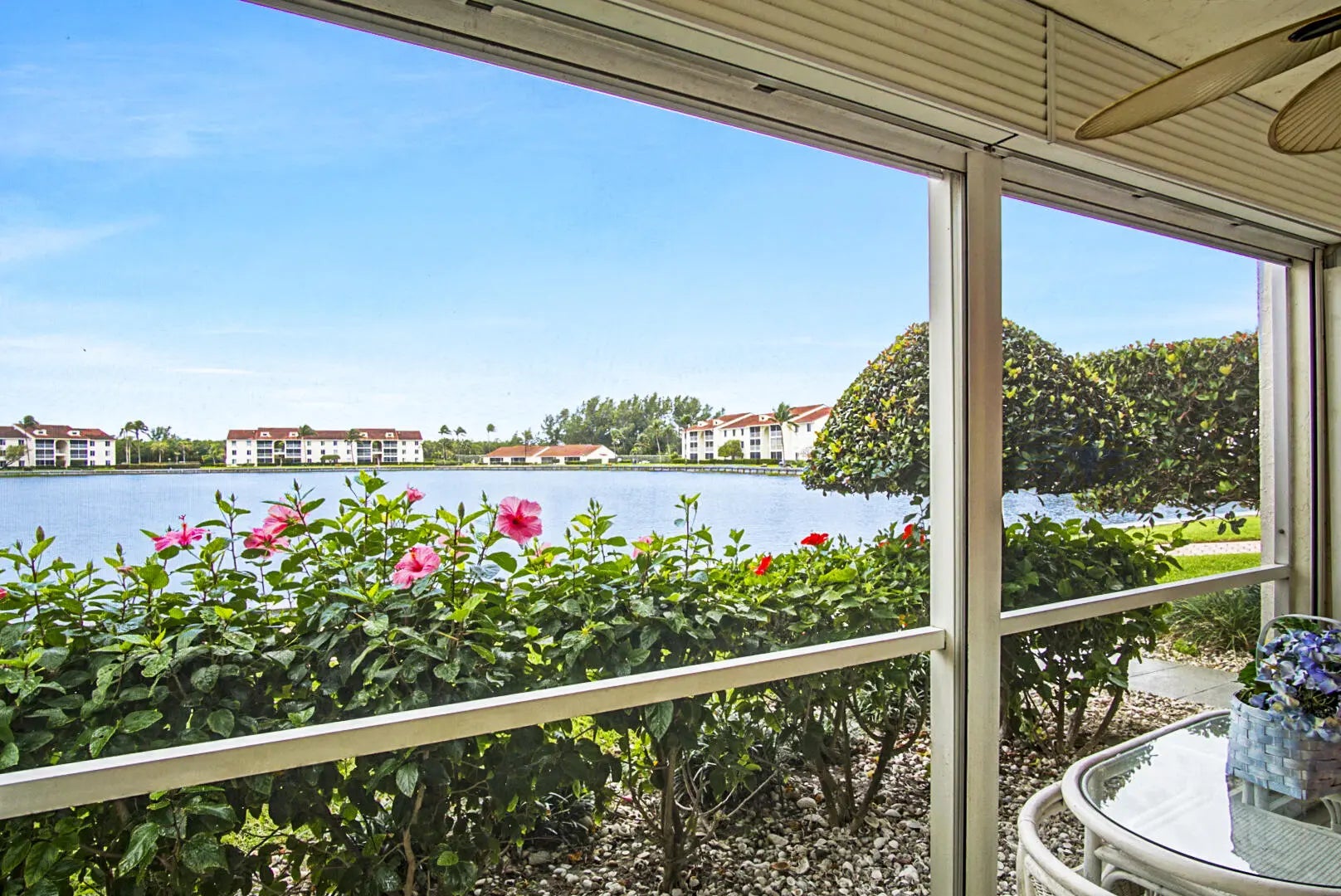 Location, location, location! This 2 Bed -2 bath condo is available seasonally or annually and offers the perfect blend of convenience and comfort. Located right next to the pool and clubhouse, this first-floor unit boasts amazing lake views and stunning sunsets. As you step inside, you'll be greeted by tile floors throughout, crown moulding, and plantation shutters in the bedrooms. The open floor plan flows from the living room to the dining area and kitchen, creating an ideal space for entertaining. The master bedroom features its own en-suite bathroom and faces the beautiful waterfront. The second bedroom is spacious and bright, with a full bath just steps away. This condo also features a new A/C unit from 2023 ensuring your comfort. (more)