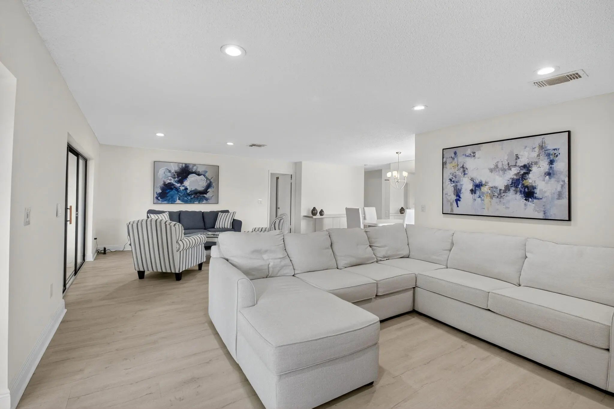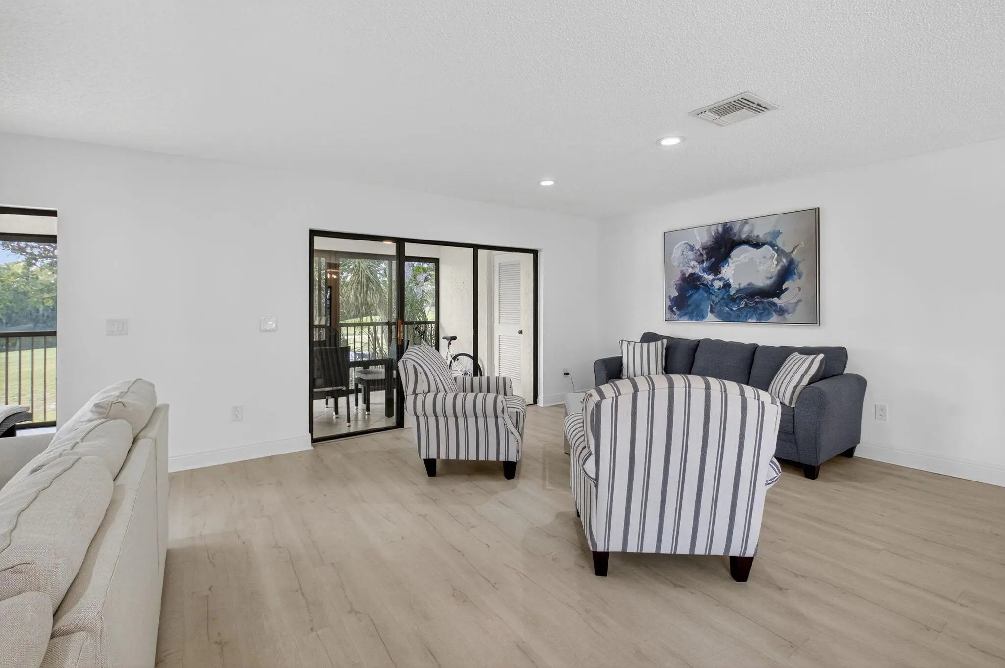 Experience resort-style living at the highly sought-after Hunters Run Country Club in this spacious 3-bedroom, 2-bath condo offering approximately 1900sq ft of total enjoyment. Convertible 3rd Bedroom currently set up as Den. The open floor plan features an eat-in kitchen, generous living/dining room and a screened-in lanai( w/plexiglass Sliders for flexible living) overlooking the golf course -- perfect for relaxation or entertaining. Updates include luxury vinyl flooring in the living areas. Panoramic Golf Course Views of the Championship South Course. As part of this premier country club community you'll enjoy three championship golf courses, tennis & pickleball courts, multiple dining venues, fitness center & spa, and more. Just minutes from Delray Beach and the Atlantic Ocean