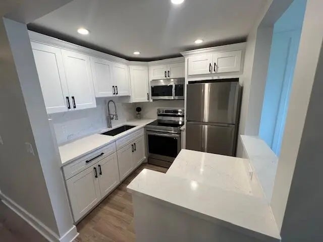 MUST SEE! Gorgeous FULLY RENOVATED first floor unit. The kitchen boasts beautiful quartz countertops and backsplashes with full plywood shaker style cabinets, new appliances. New exterior front impact resistant door and two panel interior doors. New wood flooring w/ large base moldings that match crown moldings. Artistic ''board and batten'' in the living room and master bedroom. California style closets in master and hall closet. Accordion Shutters on back patio. Assigned parking space. Cable included in HOA dues. Multiple pools, theatre on property. Important: Roof was replaced recently with metal roof, old concrete hand and stair rails already replaced with metal railings, patio is being replaced in January '26. So no future assessments. Unit is rentable w/ restrictions.