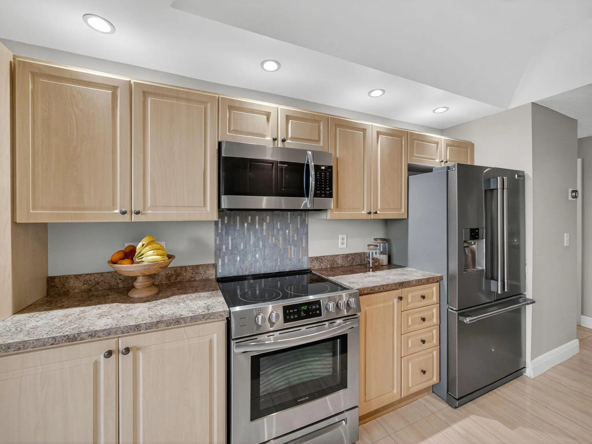 Immaculate 2BD/2BA in sought-after La Paz at Boca Pointe, an all-ages, guard-gated community with optional club membership. This beautifully updated home features designer finishes, panoramic golf views, tile flooring, and an open, light-filled layout. Modern kitchen with sleek cabinetry and newer stainless steel appliances. Spacious primary suite with custom walk-in closet and renovated bath with soaking tub and separate shower. The guest bedroom offers easy access to an elegant updated full bath with a walk-in shower.Enjoy sunsets from your screened porch overlooking the greens. Full-size washer/dryer. Across from the pool! Community offers two pools, tennis courts, and clubhouse. Minutes to shopping, dining & Boca beaches!