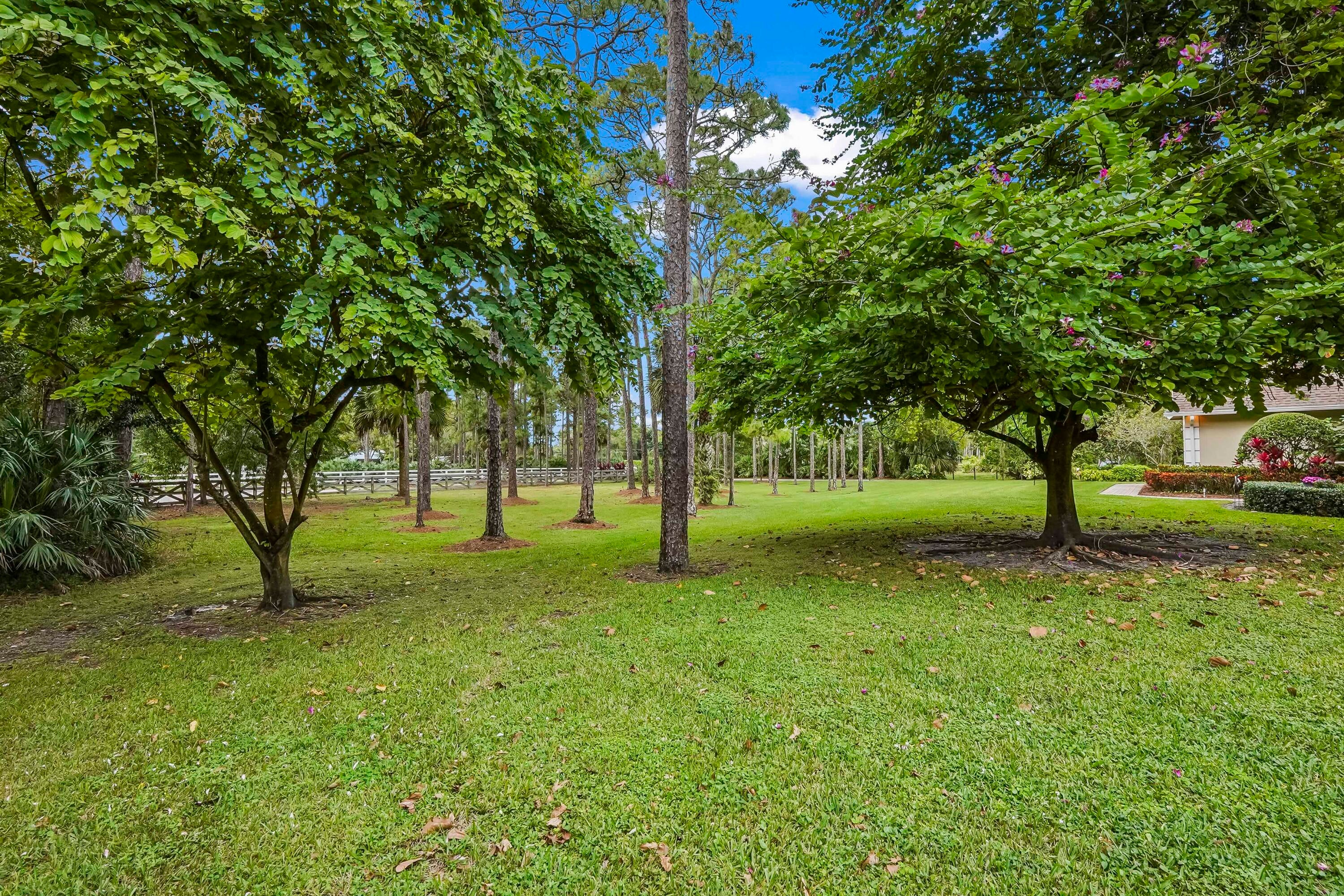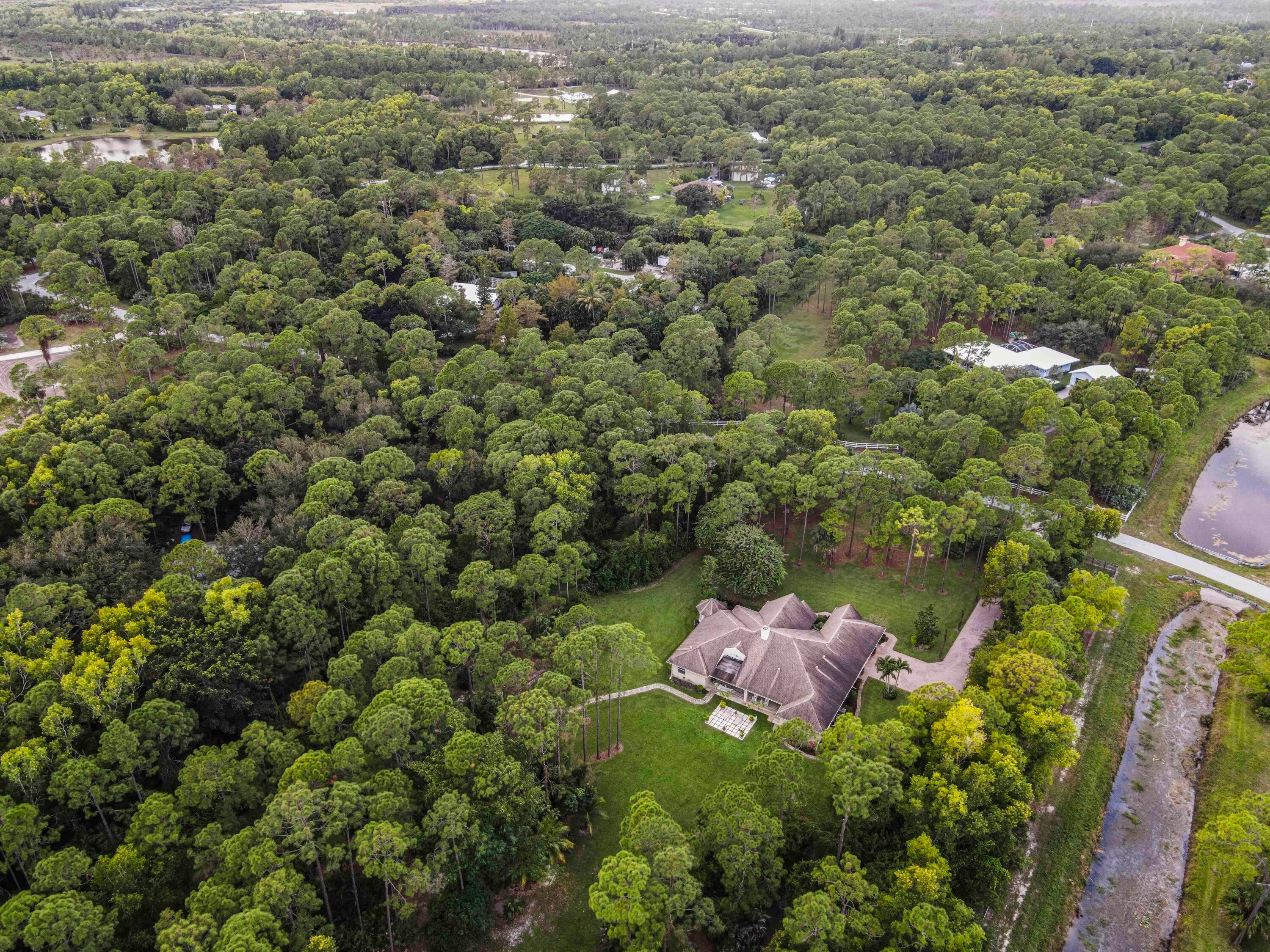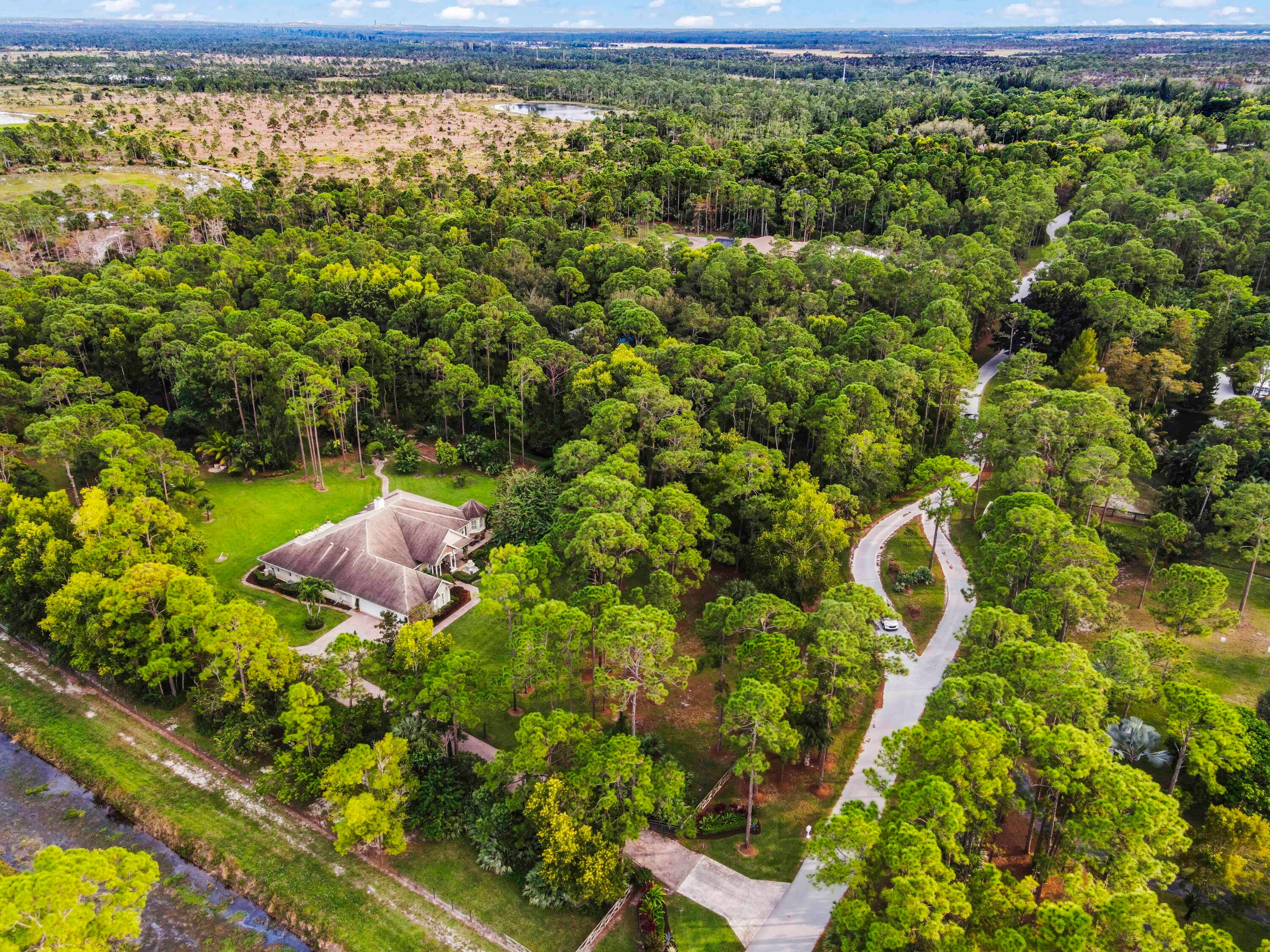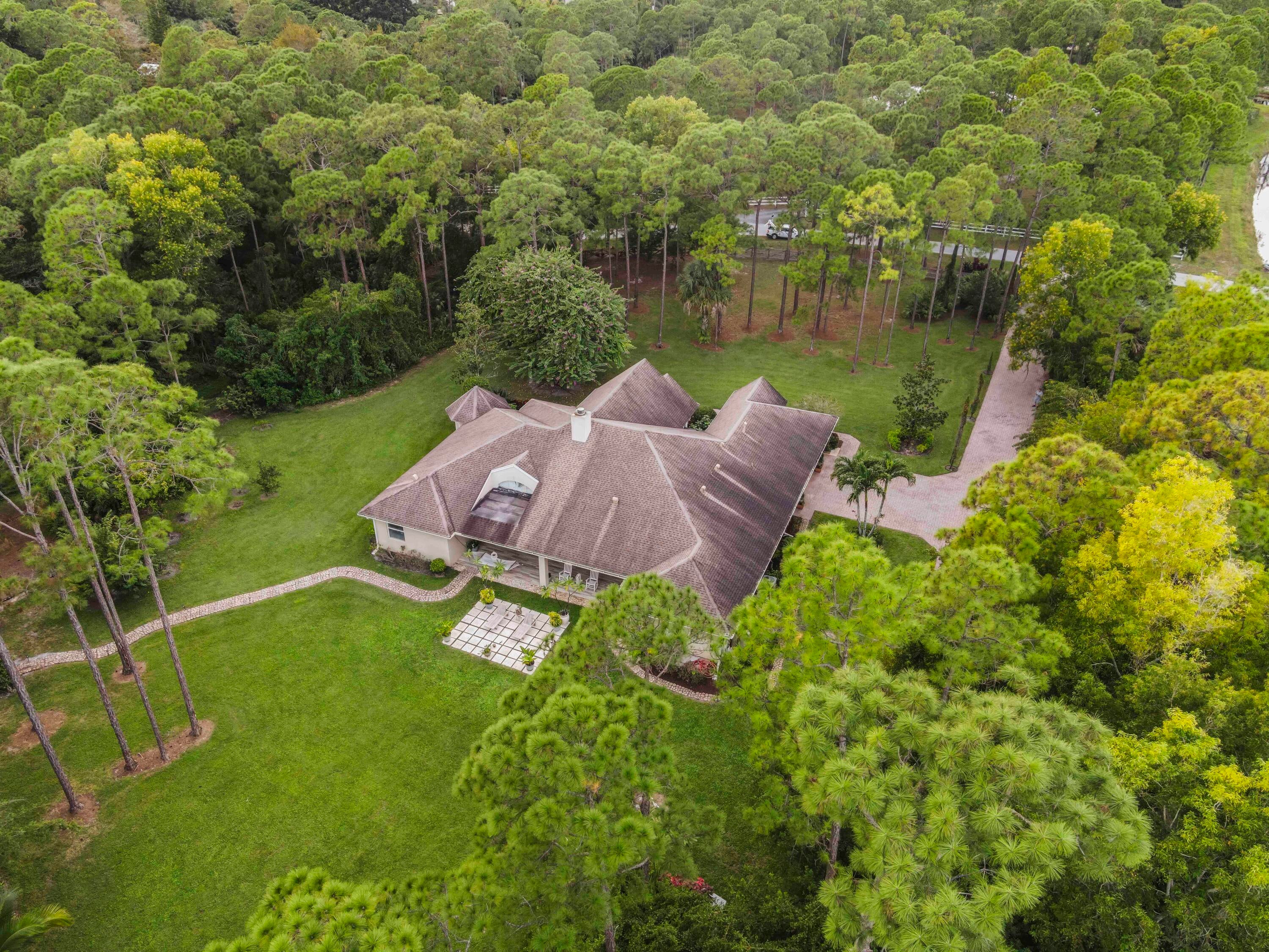 Prepare to be captivated by this custom-built retreat, a stunning estate home situated on 5.19 luscious tropical acres in Caloosa, one of Palm Beach County's most desirable equestrian communities. Offering an unmatched blend of privacy and luxury, the grounds are fully fenced and gated, with a long paver driveway leading to the expansive 5,520 square foot home.Step inside and be greeted by sophisticated design and functional elegance. The spacious floor plan features 4 bedrooms plus a den/office, 3 full bathrooms & 1 half bathroom. Architectural elegance abounds with crown molding and dramatic beamed ceilings extending through the family room, living room, kitchen, laundry room, and halls. The recently updated, spacious kitchen is a chef's delight, boasting a center island and a casual dining area, seamlessly connected to the family room by a unique two-sided stone fireplace. The Master Suite is a true sanctuary, complete with luxurious finishes and a private seating area. This home offers true peace of mind and modern convenience. It is secured with impact glass, and both A/C units were recently replaced in 2023. The laundry room was recently remodeled with washer and dryer units, and the home features an oversized three-car garage. Living in Caloosa means embracing a premier equestrian and nature-focused lifestyle. The community offers 30 miles of winding bridle paths and waterways, along with an official riding pen, arena, obstacle and jumper courses, tennis, pickleball, basketball courts, and a picnic area.