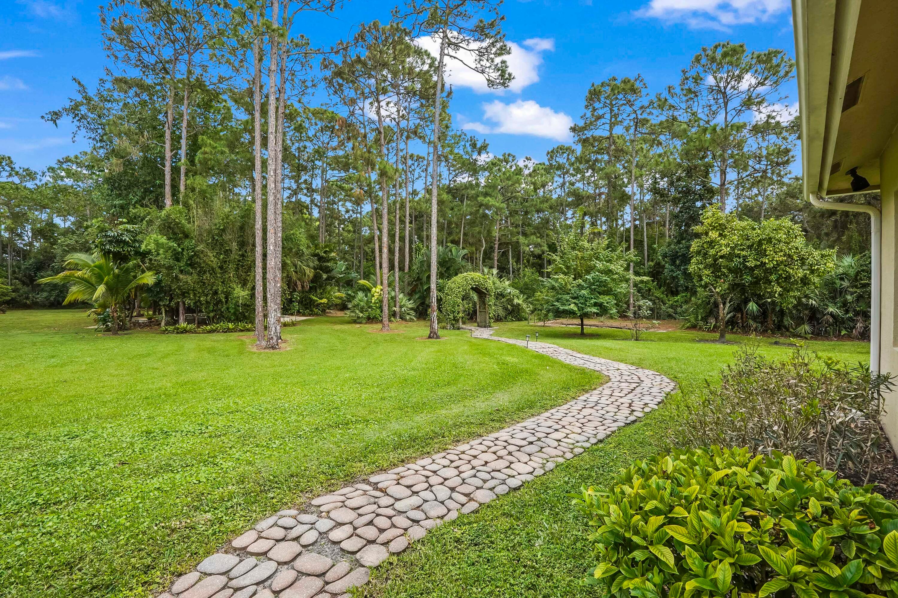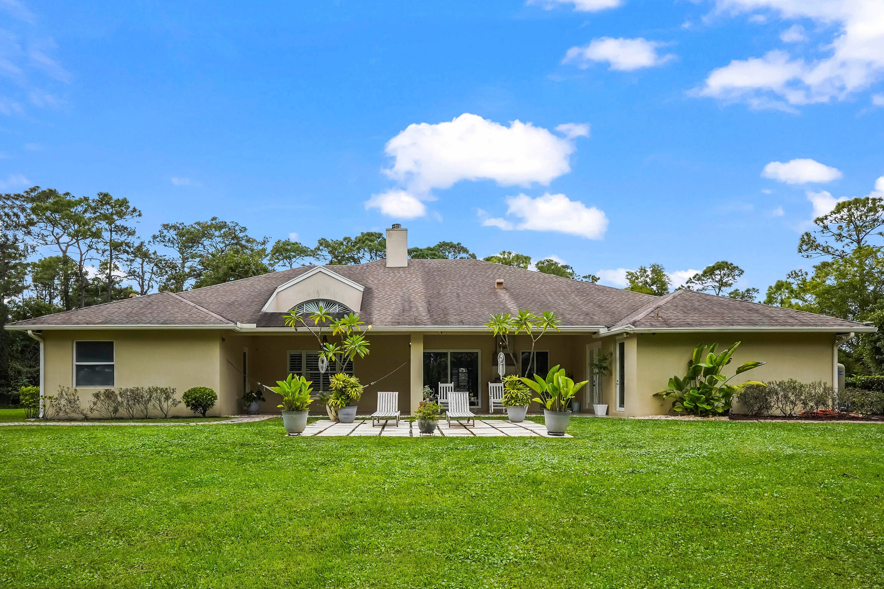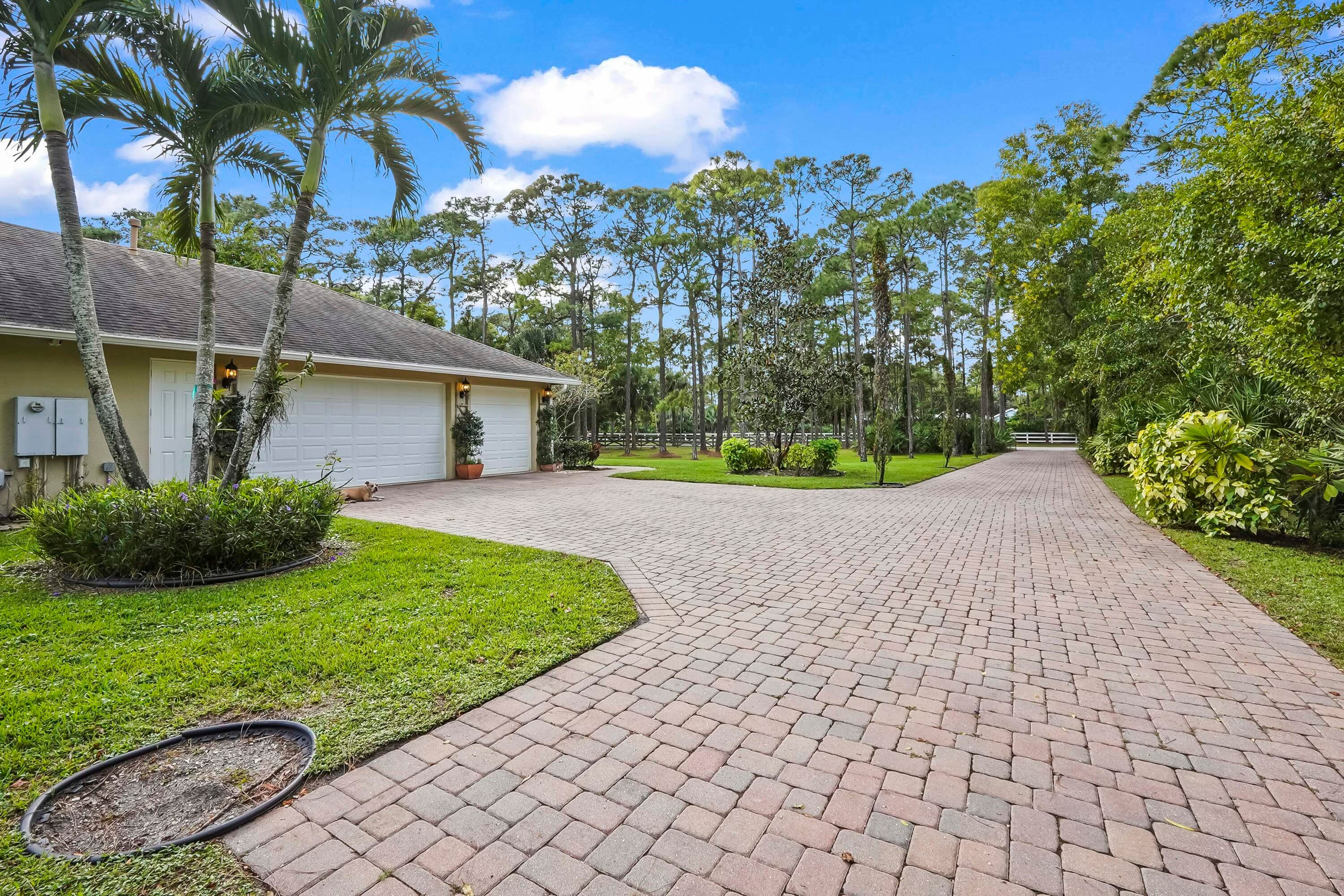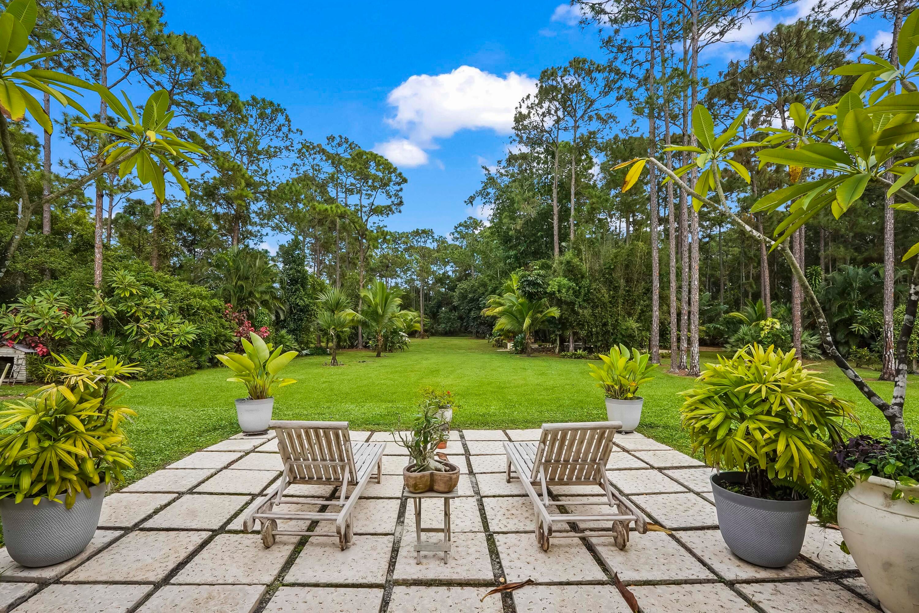 Prepare to be captivated by this custom-built retreat, a stunning estate home situated on 5.19 luscious tropical acres in Caloosa, one of Palm Beach County's most desirable equestrian communities. Offering an unmatched blend of privacy and luxury, the grounds are fully fenced and gated, with a long paver driveway leading to the expansive 5,520 square foot home.Step inside and be greeted by sophisticated design and functional elegance. The spacious floor plan features 4 bedrooms plus a den/office, 3 full bathrooms & 1 half bathroom. Architectural elegance abounds with crown molding and dramatic beamed ceilings extending through the family room, living room, kitchen, laundry room, and halls. The recently updated, spacious kitchen is a chef's delight, boasting a center island and a casual dining area, seamlessly connected to the family room by a unique two-sided stone fireplace. The Master Suite is a true sanctuary, complete with luxurious finishes and a private seating area. This home offers true peace of mind and modern convenience. It is secured with impact glass, and both A/C units were recently replaced in 2023. The laundry room was recently remodeled with washer and dryer units, and the home features an oversized three-car garage. Living in Caloosa means embracing a premier equestrian and nature-focused lifestyle. The community offers 30 miles of winding bridle paths and waterways, along with an official riding pen, arena, obstacle and jumper courses, tennis, pickleball, basketball courts, and a picnic area.