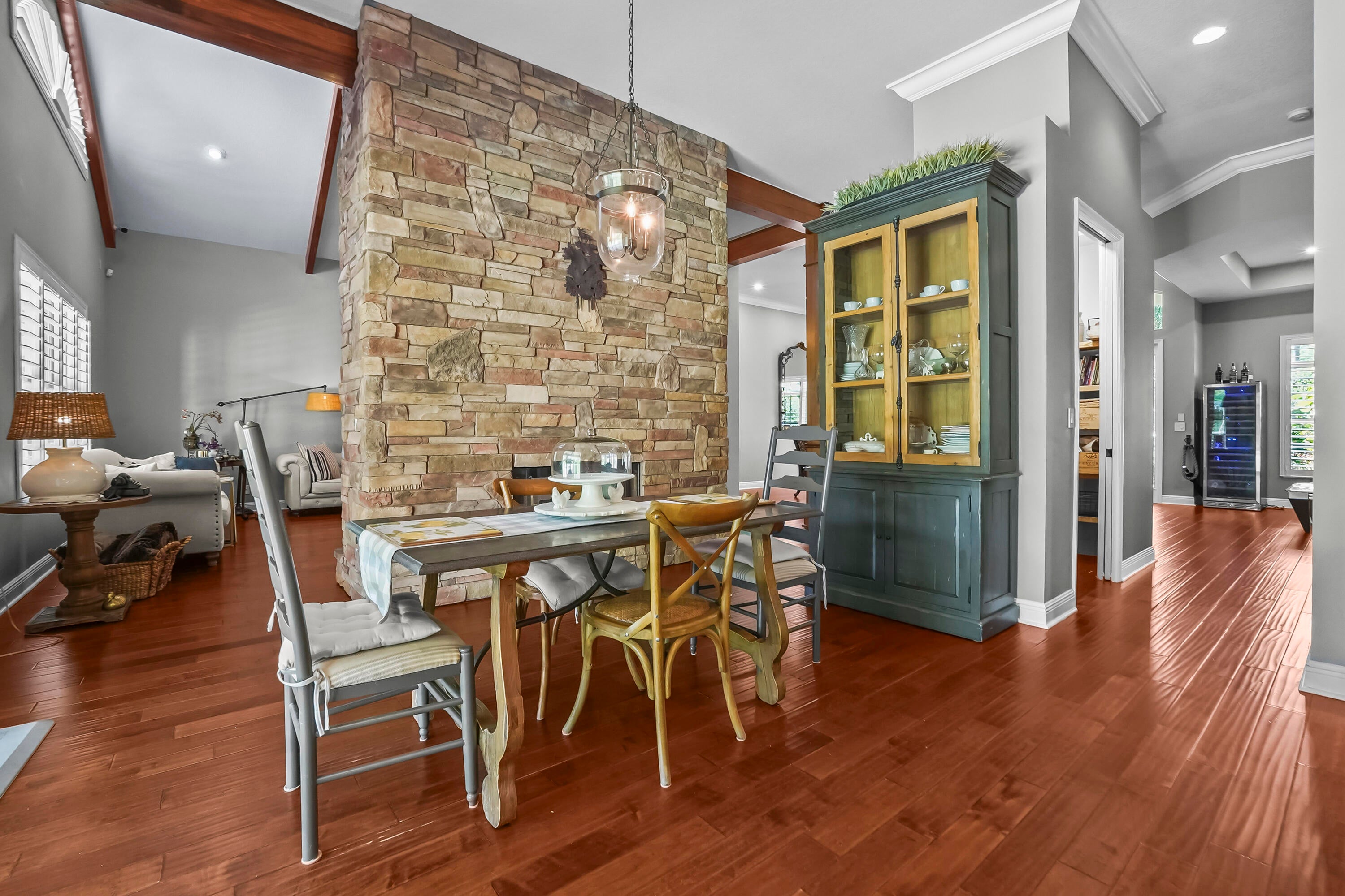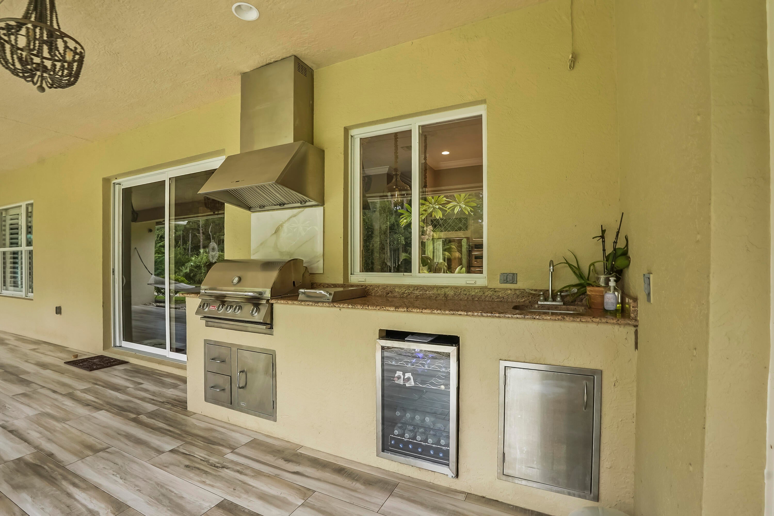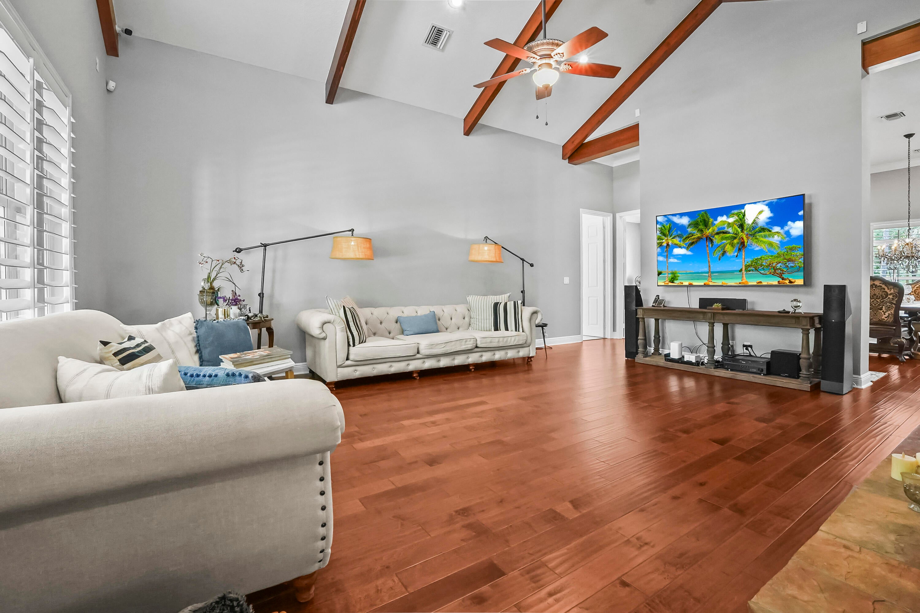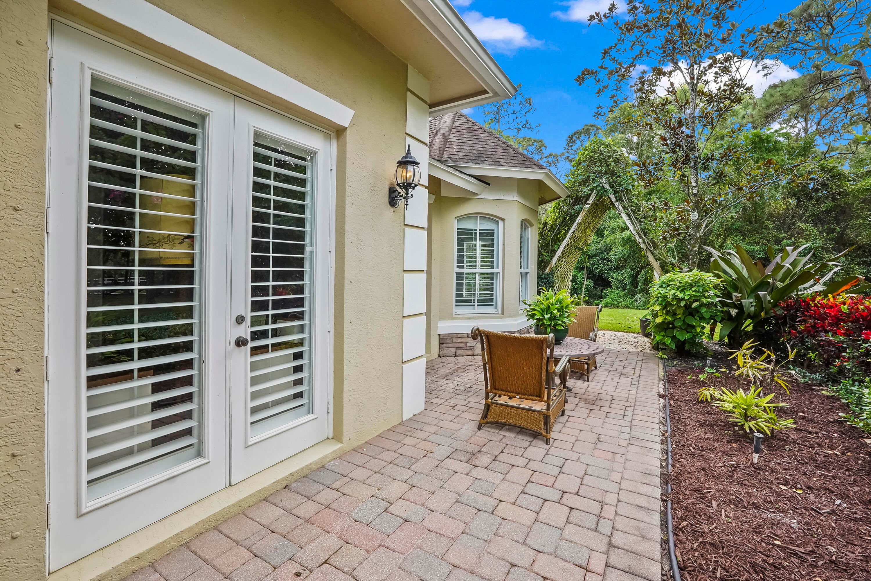 Prepare to be captivated by this custom-built retreat, a stunning estate home situated on 5.19 luscious tropical acres in Caloosa, one of Palm Beach County's most desirable equestrian communities. Offering an unmatched blend of privacy and luxury, the grounds are fully fenced and gated, with a long paver driveway leading to the expansive 5,520 square foot home.Step inside and be greeted by sophisticated design and functional elegance. The spacious floor plan features 4 bedrooms plus a den/office, 3 full bathrooms & 1 half bathroom. Architectural elegance abounds with crown molding and dramatic beamed ceilings extending through the family room, living room, kitchen, laundry room, and halls. The recently updated, spacious kitchen is a chef's delight, boasting a center island and a casual dining area, seamlessly connected to the family room by a unique two-sided stone fireplace. The Master Suite is a true sanctuary, complete with luxurious finishes and a private seating area. This home offers true peace of mind and modern convenience. It is secured with impact glass, and both A/C units were recently replaced in 2023. The laundry room was recently remodeled with washer and dryer units, and the home features an oversized three-car garage. Living in Caloosa means embracing a premier equestrian and nature-focused lifestyle. The community offers 30 miles of winding bridle paths and waterways, along with an official riding pen, arena, obstacle and jumper courses, tennis, pickleball, basketball courts, and a picnic area.