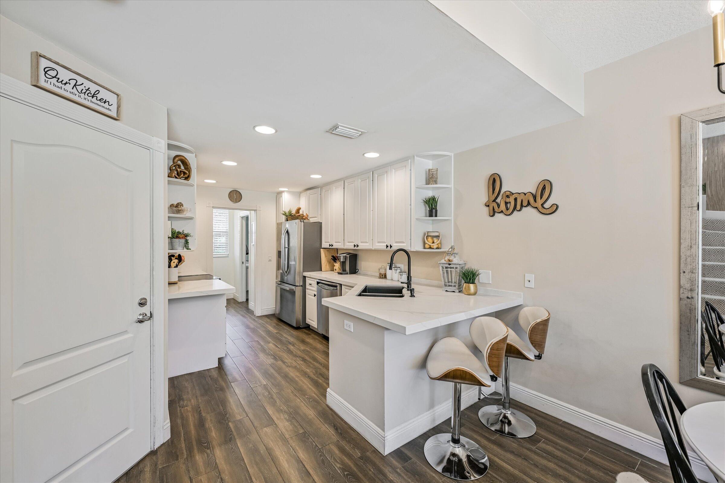 Contemporary, Turn-Key Townhome in the Heart of Palm Beach GardensThis beautifully upgraded contemporary townhome is truly move-in ready, offering modern style and thoughtful updates throughout. The main level features stunning ceramic wood-look flooring and fresh interior paint. The renovated kitchen showcases quartz countertops, new sinks, and updated appliances, including a brand-new washer and dryer in the redesigned laundry area. All bathrooms feature matching upgraded quartz countertops and sinks for a cohesive, elevated look.Upstairs, an elegant staircase with a new carpeted runner leads to two guest bedrooms with brand-new Berber carpet and a spacious primary suite with generous closet space and an updated en suite bath.The private back porch overlooks a quiet greenspace, creating a peaceful spot to relax. A new roof (2023) and freshly painted exterior buildings (2023) add beauty and peace of mind. Perfectly located just five minutes from I-95, five minutes from The Gardens Mall, and fifteen minutes from the beach, this home offers convenience, comfort, and contemporary living in one of Palm Beach Gardens' most desirable areas. Don't miss out on this great opportunity in this incredible sought after community!