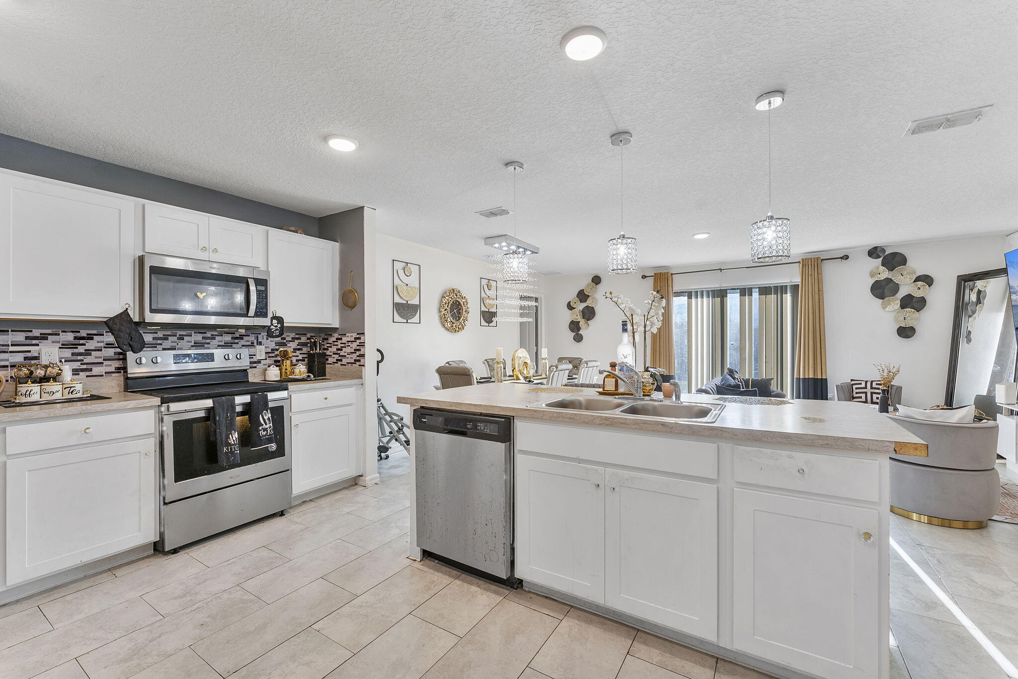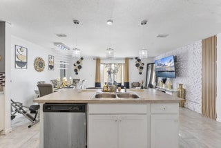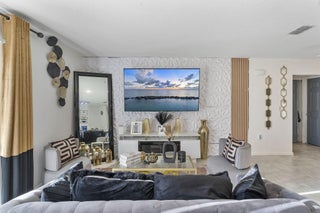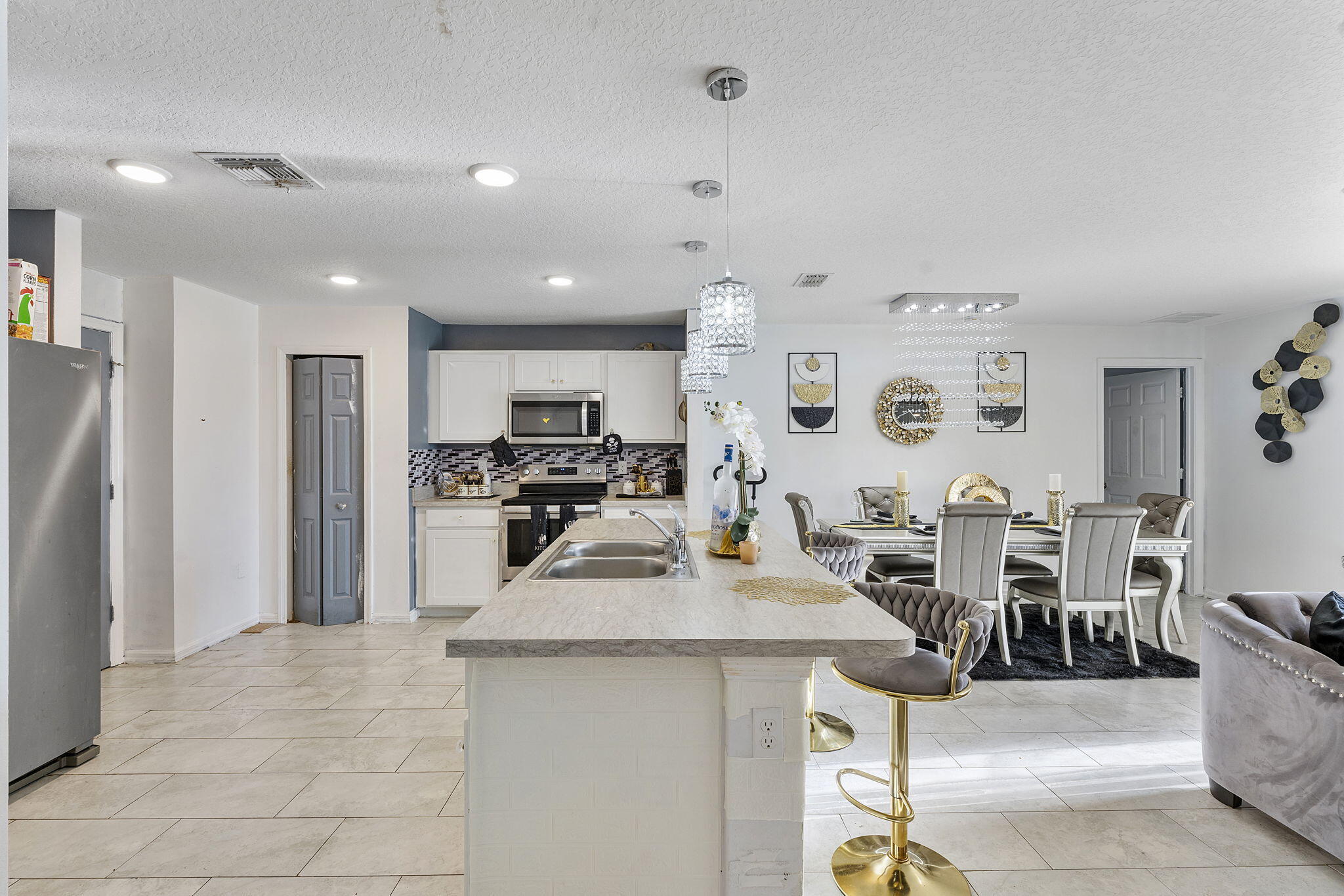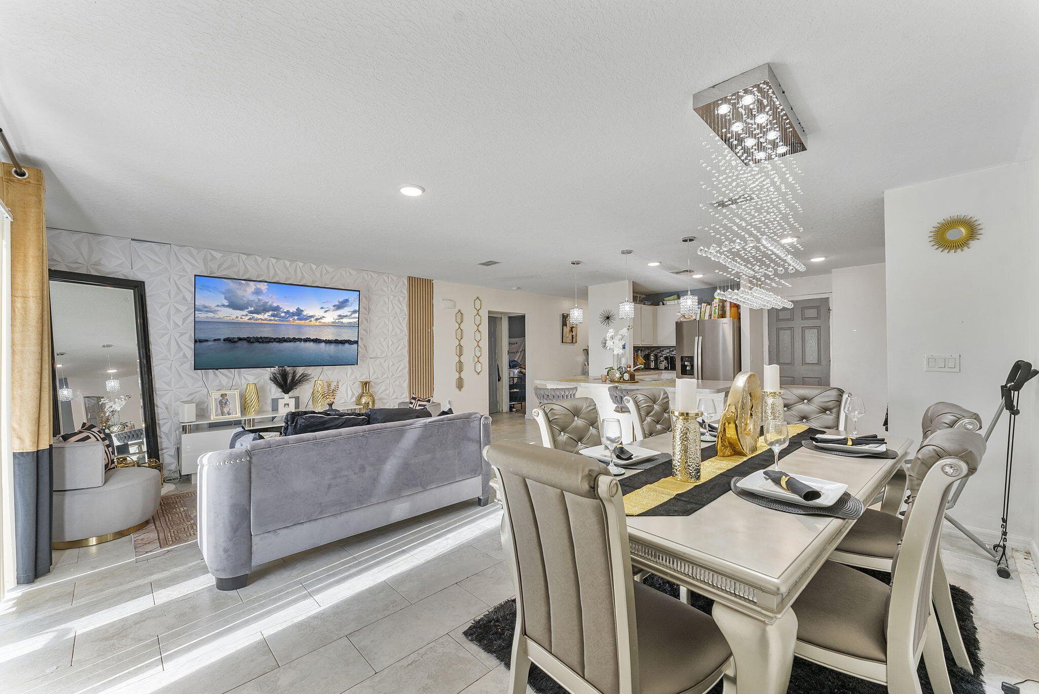 Prepare to be dazzled by this exceptional single family residence, a home where every detail is a statement of style and luxury. Designed for the homeowner who appreciates dramatic flair and spacious function, this 4 bed, 2 bath, and a 2 car garage. Step into an open concept living space. The heart of the home is a seamless great room designed for both grand entertaining and dazzling daily life. The living and dining areas are crowned with show-stopping crystal chandeliers and bespoke light fixtures that throw shimmering light across the space, instantly setting a luxurious mood. The designer kitchen is a bright centerpiece, boasting crisp white cabinetry, modern stainless steel appliances, and a unique mosaic tile backsplash that provides a striking visual contrast