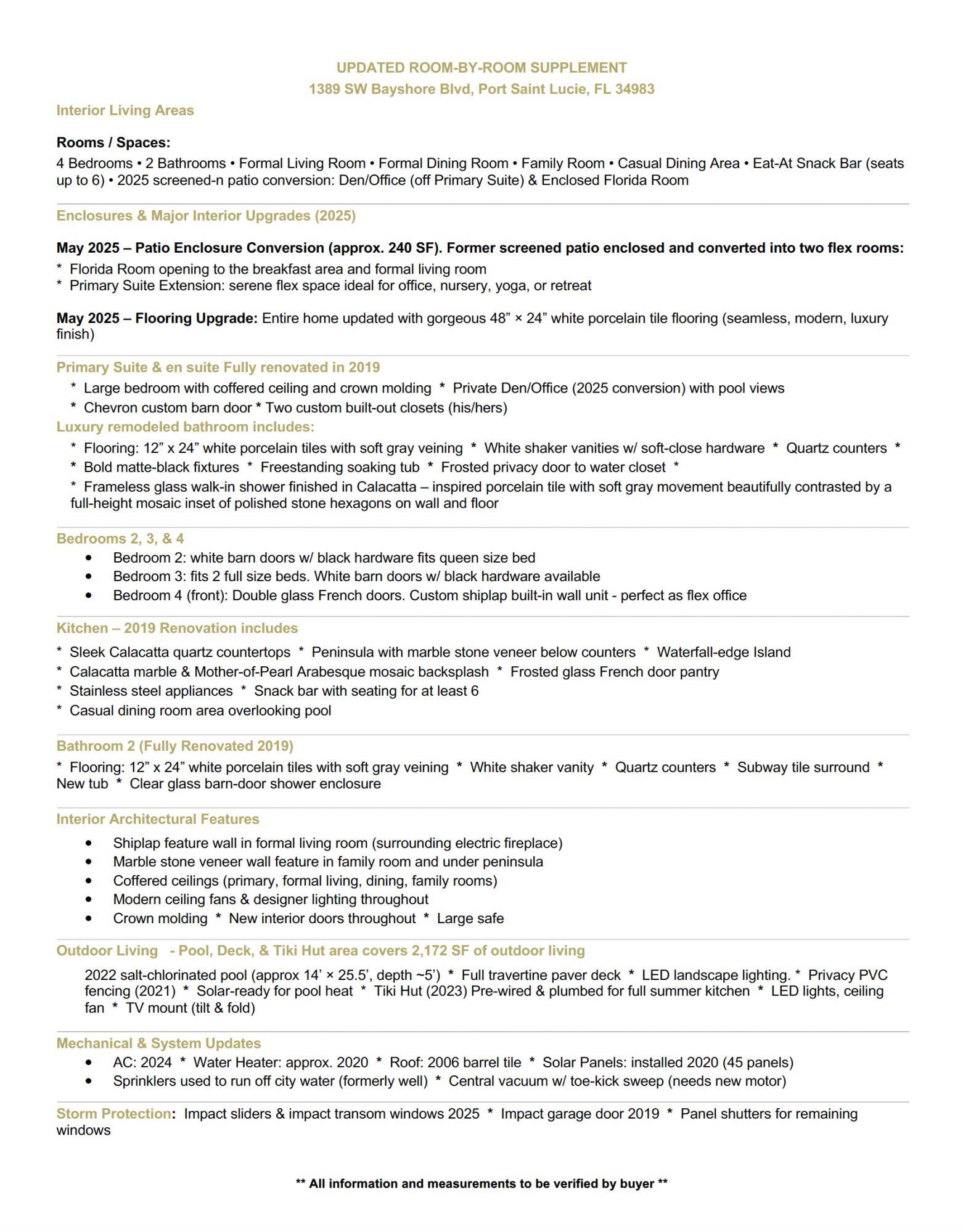 Every inch of this beautifully updated 4 BR / 2 BA/ 3,085-LSF home perfectly blends elegance, comfort & functionality. Each detail feels intentional - from the luxurious primary retreat to the open-concept kitchen that flows effortlessly into the family and dining areas. The home's cohesive design continues outdoors with 2172 SF of sparkling resort-style pool, travertine paver decking, and a tiki retreat - creating a harmonious extension of living space ideal for entertaining & relaxation. This versatile floor plan also includes formal living & dining rooms, den, and Florida room spacious, inviting, and designed for everyday living. Other features include Calacatta-style quartz waterfall island, coffered ceilings, crown molding, sleek porcelain tile throughout, and so much more!Living Spaces: 4 BR " 2 BA " Formal Living & Dining Rooms " Spacious Family Room " Casual Dining Area " Large Eat-At Snack Bar (seats 6) " Private Den/Office off Primary Suite " Enclosed Florida Room (converted from patio) Storm Protection: Impact garage door, sliding doors, and transom window in Den/office. Panels on all others. Based area under Air (Finished Area): 2,845 SF + 240 sf (closed in patio) = 3,085 / Total SF: 3198 sf Pool Deck total area: 2172 sf + Pool 14' x 25'.5" + Tiki / Gross Area: 5,370 SF * Lot Size: 0.25 acres / 10,890 sf See Documents with complete updates