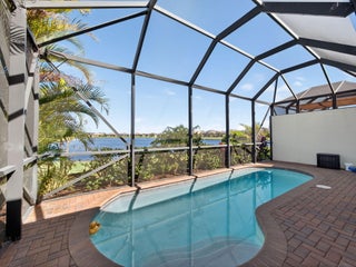 Welcome to premier 55+ Florida living with this TRUE 3-bedroom lakefront villa, perfectly positioned on a rare pie-shaped lot in the prestigious gated community of LakePark at Tradition. This prime homesite offers expanded frontage, exceptional privacy, and impressive spacing between neighboring villas--an uncommon benefit that enhances the home's peaceful setting. Built in 2019 and lovingly maintained by the original owner, this home showcases quality craftsmanship and thoughtful upgrades throughout. The popular Buttonwood model has been transformed into a true three-bedroom layout with the addition of doors and a full closet in the den. Inside, soaring ceilings and abundant natural light accentuate the open-concept design, while impact windows and doors ensure comfort and security.The gourmet kitchen features quartz countertops, beautifully crafted cabinetry with crown molding, and ample storage. Wood-look tile flooring flows throughout the entire home, eliminating carpet and creating a clean, cohesive aesthetic. Both bathrooms are elegantly upgraded with floor-to-ceiling tile, giving them a refined, spa-like feel. Enjoy stunning long lakefront views and brilliant sunrises from your private outdoor oasis. The screened-in pool and spacious patio provide the ideal retreat for relaxing, entertaining, or soaking in the tranquil waterfront scenery. Lush privacy landscaping creates a serene, secluded atmosphere that feels like your own personal sanctuary. Residents of Lake Park enjoy an all-inclusive HOA covering lawn care, mulching, full irrigation system use and maintenance, house phone, alarm system, high-speed internet, and cable TV; making this the perfect low-maintenance Florida lifestyle!
