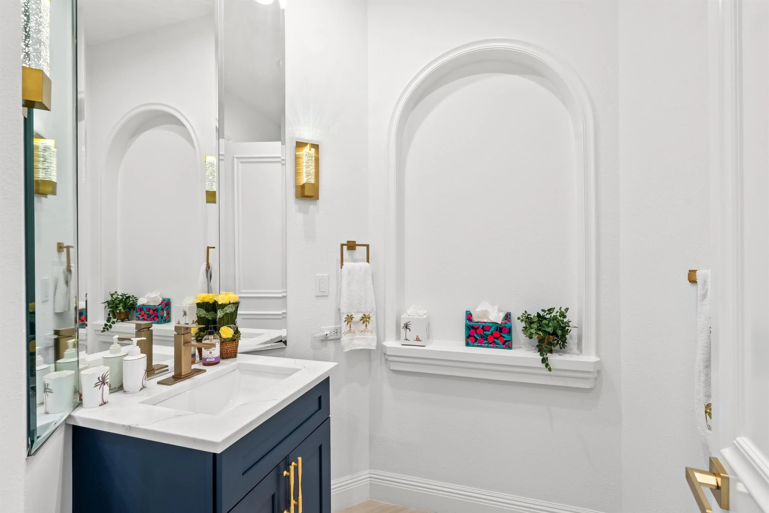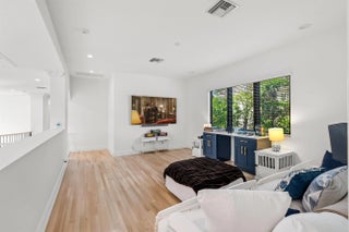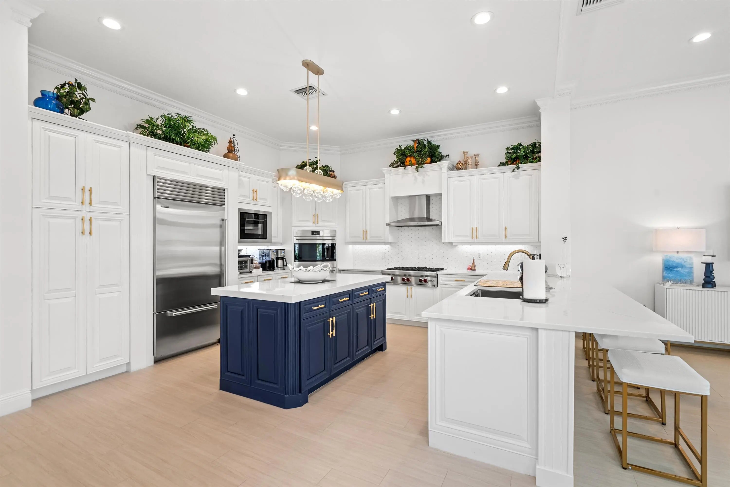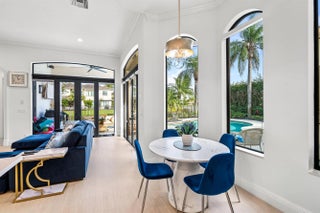 Boca Raton elegance meets European elan at this lakefront seven-bedroom gem with 7,021+/- total square feet. The welcoming entry foyer with a dramatic curving staircase introduces the chic living room detailed by a soaring two-story coffered ceiling, a contemporary ribbon fireplace and a window-wall of glass overlooking the pool patio. Framed by a graceful archway entry, the stylish dining room offers garden views, while imbued with a light-filled ambience and featuring French doors to the pool loggia are the open-concept great room and center-island chef's kitchen. The split-bedroom places one of the primary suites on the first floor for unmatched privacy. Comprising the suite are the spacious lakeview bedroom with French doors to the pool patio, two custom-fitted walk-in closets