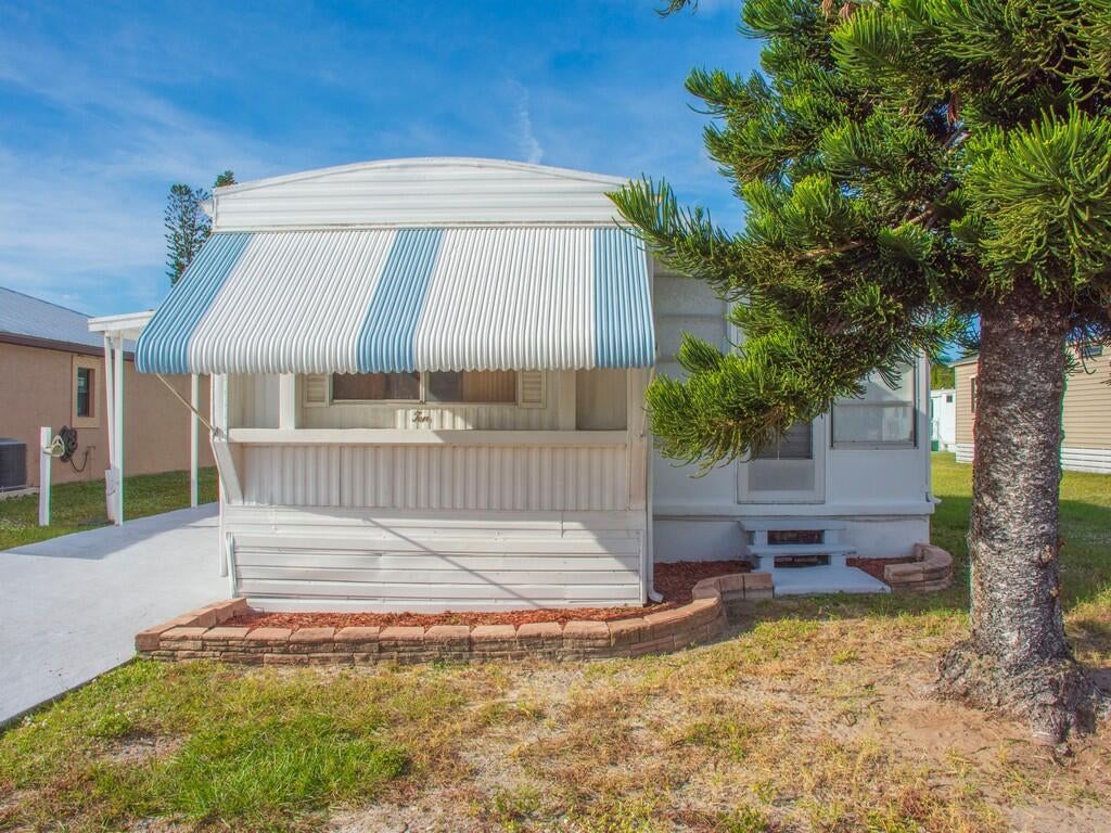 Rare 3BR/2BA value in a mostly 2-bedroom community--move in and roll up your sleeves! Seller pays your first 2 months lot rent. Vintage home on an oversized cul-de-sac lot up front in the community, a real easy walk to the local cantina for margaritas. Make it yours with new colors, cabinets, fixtures and finishes while you build sweat equity. Designed for Florida living: 10'20' Florida room catching Atlantic breezes, 12'26' west-facing carport/covered patio, plus hobby shed. Approx. 1,376 sq ft total (864 living + 200 Florida room + 312 carport/porch). Start your tropical lifestyle here at 10 DeSoto Lane in Spanish Lakes!