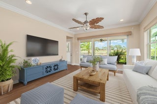 Stunning 4BR/4BA pool home in desirable PGA Village! This beautifully upgraded residence features bright open living spaces, soaring ceilings, and a grand foyer with a striking Chihuly-style chandelier. The chef's kitchen offers granite counters, custom cabinetry, stainless appliances, and an oversized island flowing into the main living area. Triple sliders open to a private lanai and sparkling pool, perfect for indoor/outdoor Florida living. The spacious primary suite includes a spa-like bath and large walk-in closets. Three additional bedrooms and four full baths provide comfort for family, guests, or a home office. Enjoy PGA Village amenities: championship golf, clubhouse, fitness center, resort pools, 27 pickle-ball courts, walking trails, and 24-hr gated security.