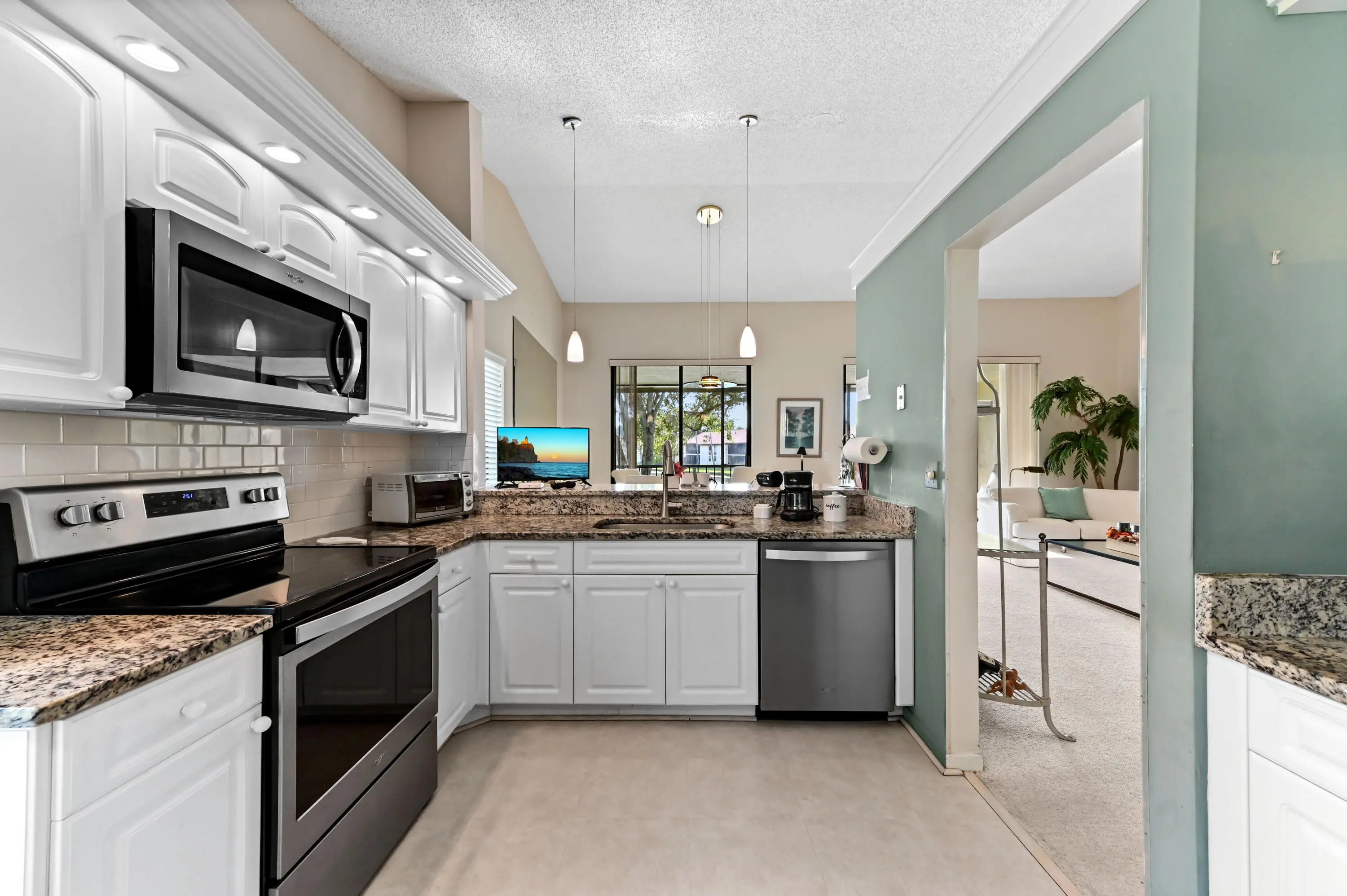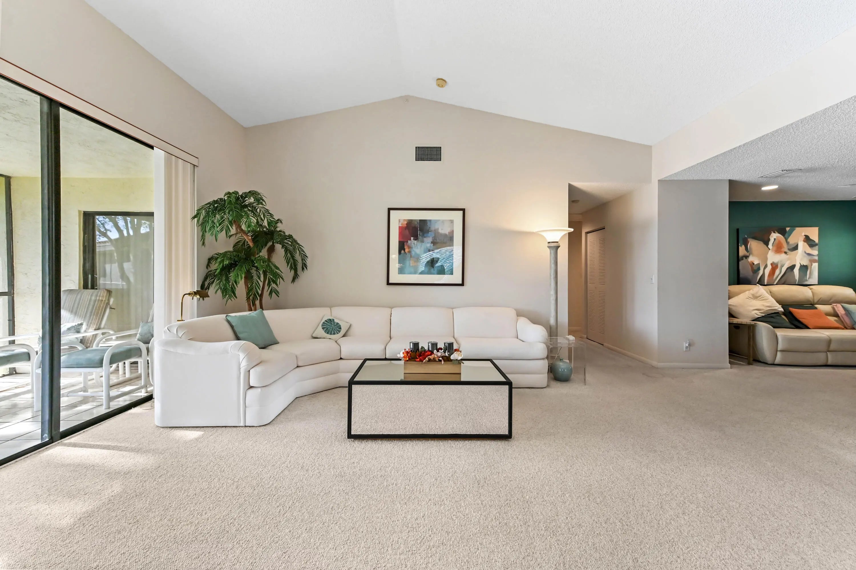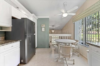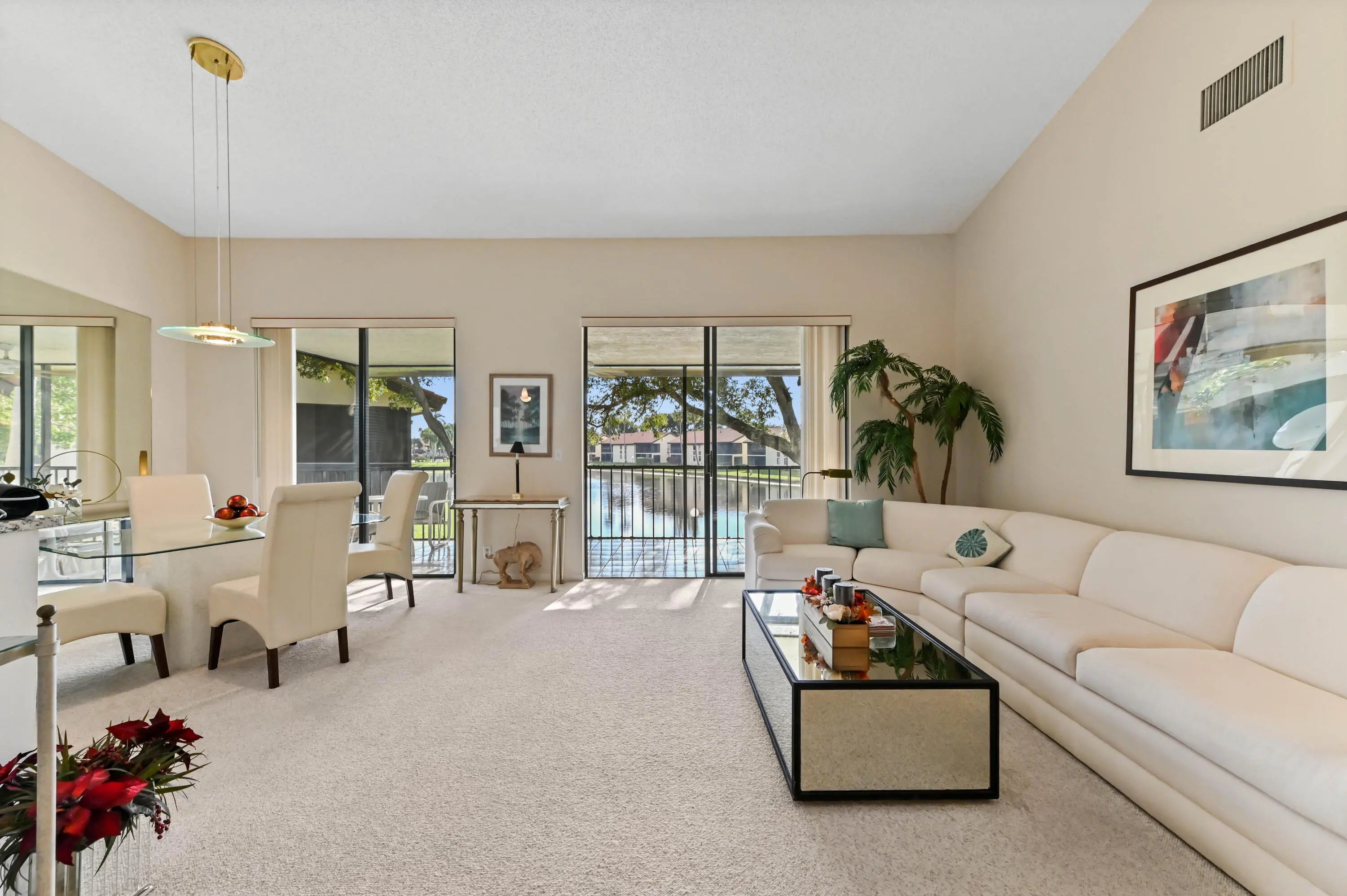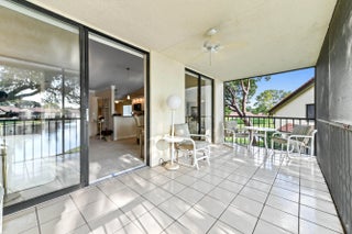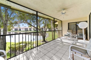 Welcome to Palm Chase Lakes, an active 55+ gated community. This spacious corner unit offers 3 bedrooms and 2 bathrooms, the stairs are equipped with a chair lift for ADA compliance with the 3rd bedroom currently used as a den. With 1,648 sq ft of living space, the home features cathedral ceilings, a split bedroom plan, and a screened and enclosed balcony with peaceful lake views--accessible directly from the master bedroom.Recent upgrades include a new AC system, providing comfort and efficiency year-round. Interior highlights also include a combination of tile and carpet flooring, stainless steel kitchen appliances, and a functional kitchen counter area that doubles as a breakfast bar.