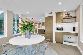 This rarely available Pet-Friendly, walk-out garden unit offers the feeling of a private single-family residence with the amenities of Mizner Court. Lush greenery surrounds the home, and two covered patios lead directly to the Intracoastal promenade, community pools, and The Boca Raton.Completed in early 2022, this residence underwent a full-scale reconstruction, taken to the studs with a reimagined open floor plan, raised ceilings, all-new HVAC and ductwork, hurricane-impact glass throughout, upgraded plumbing and electrical, and a whole-unit water filtration system. Every finish and detail was intentionally selected and executed to a refined standard. The kitchen features custom cabinetry by Paris Furnishings, pure white quartz countertops, Carrara marble backsplash, Rohl bridge faucet, GE Monogram French-door oven, induction cooktop, and glass-door refrigerator. A custom dining coffee bar includes a pot filler and integrated pet watering station. The living area includes a wall-mounted 83" LG OLED TV and custom floating cabinetry. The laundry room is fully tailored with California Closets millwork, Electrolux washer/dryer, stainless utility sink, custom Lucite pet crate niche, and full-height decorative tile. The primary suite includes a sitting area and custom closet, leading to a vanity lounge with floating cabinetry, quartz surfaces, Carrara vessel sink, and accent lighting. The adjoining bath features floor-to-ceiling marble tile, rain shower with herringbone marble flooring, wall-mounted fixtures, and a skirted one-piece toilet. The guest suite/office is accessed via glass French pocket doors, with a second full bath mirroring the same elevated design. Additional appointments include porcelain wood-plank flooring, Hunter Douglas motorized shades, premium wallcoverings, LED recessed lighting with dimmers, thick quartz surfaces, and Millefiori hand-blown glass pendants. Mizner Court is a 24/7 staffed, gated, 13-acre waterfront community offering two large heated pools, four spas, Har-Tru tennis, two fitness centers, sauna/steam facilities, marina with guest dockage, EV charging, indoor parking with storage, and on-site professional management. Ideally located near Palmetto Park Road dining, the beach, and Silver Palm Park.