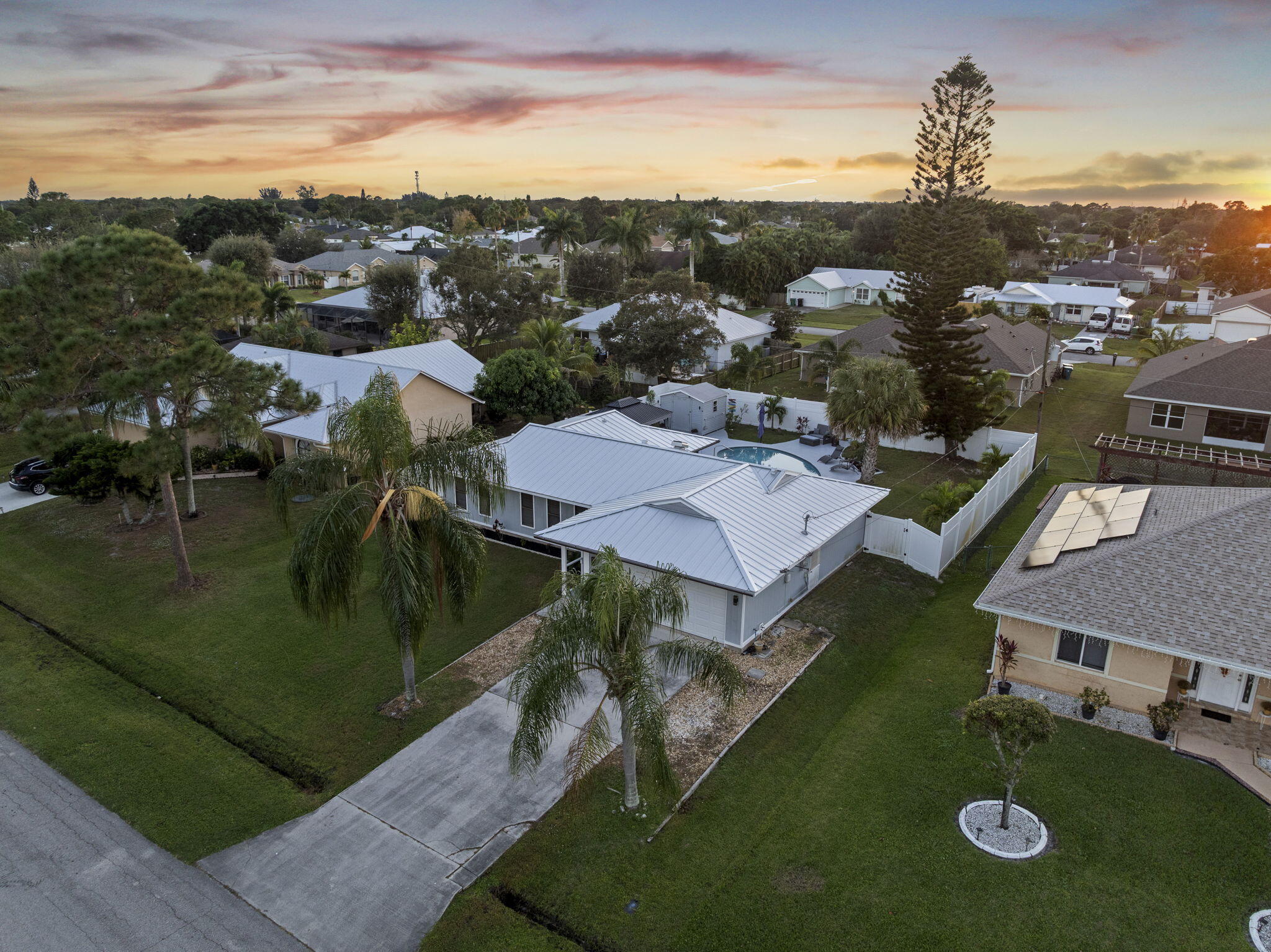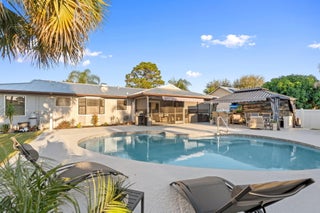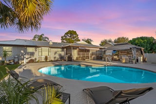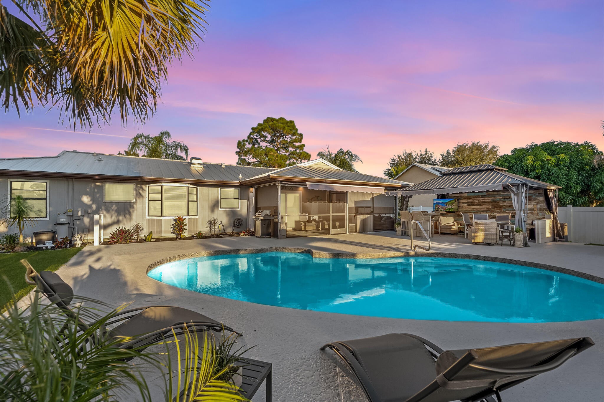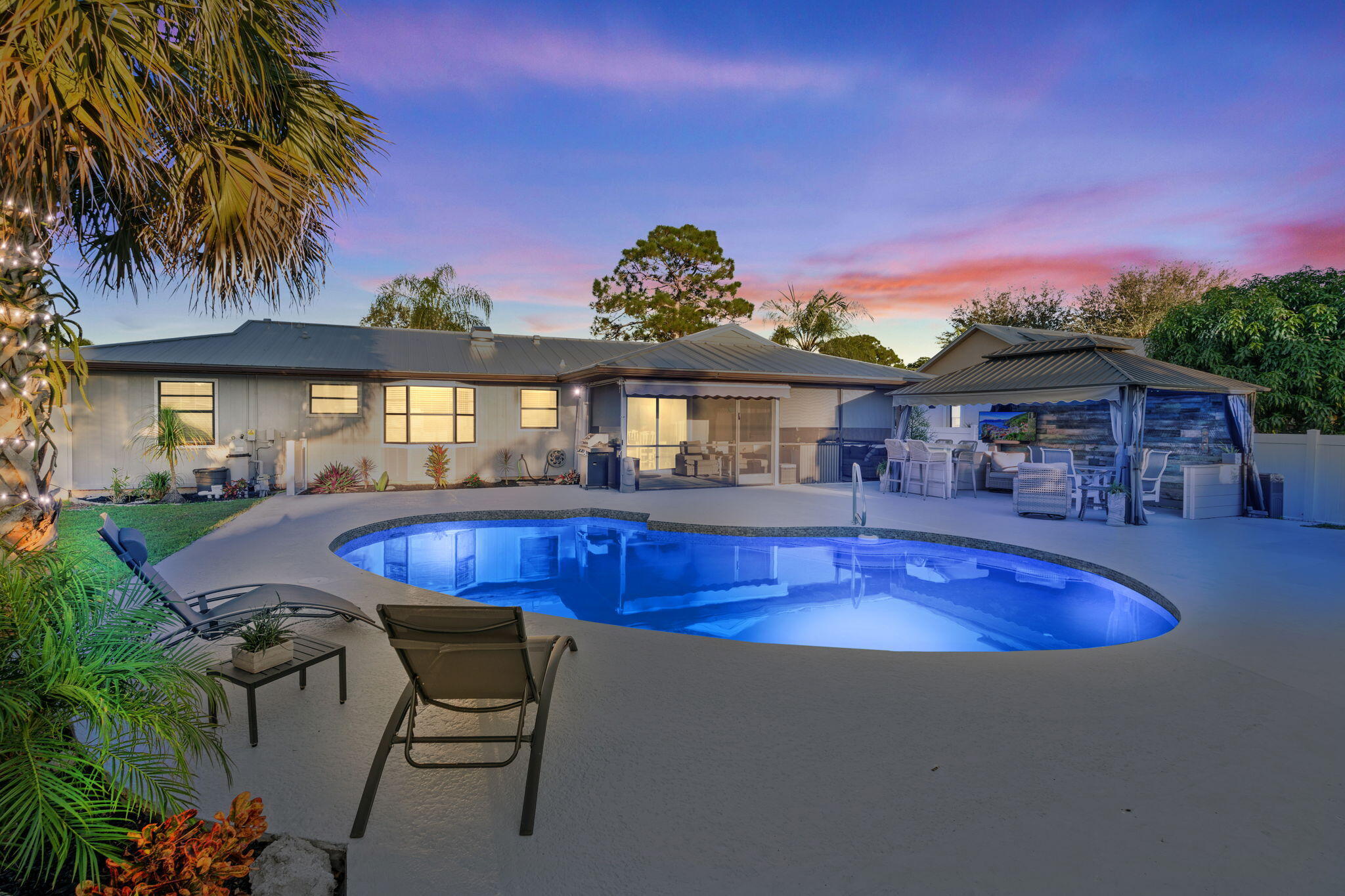 Are you searching for the perfect pool home in Port St. Lucie? This one deserves your attention. This 2 bed, 2 bath, 1154 sqft home offers a 2-car garage, a 2023 metal roof, & a saltwater pool with a covered bar, ideal for enjoying the Florida lifestyle. The home has been thoughtfully updated & is move-in ready. The entire pool was resurfaced and updated with a new salt system & equipment. The backyard was re-graded and enclosed with a new 8 ft PVC fence. Outdoor living is enhanced with a covered gazebo/bar/TV area, custom patio shades, & awnings blocking out the sun. New flooring and paint throughout. This smart-home is enabled with voice-controlled, a smart thermostat, & smart door lock. Prime location close to shopping, restaurants, award-winning healthcare, and quick access to I95