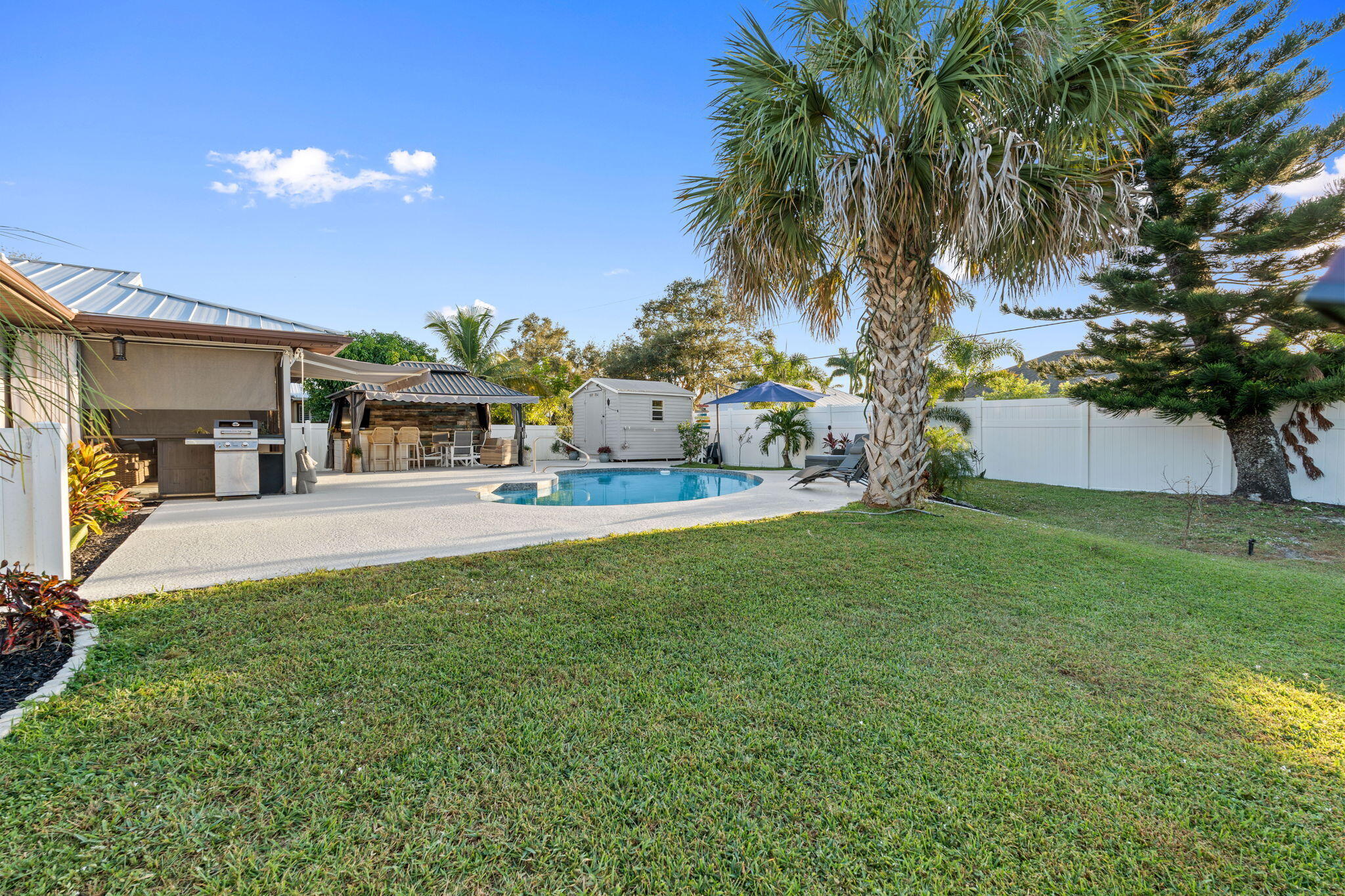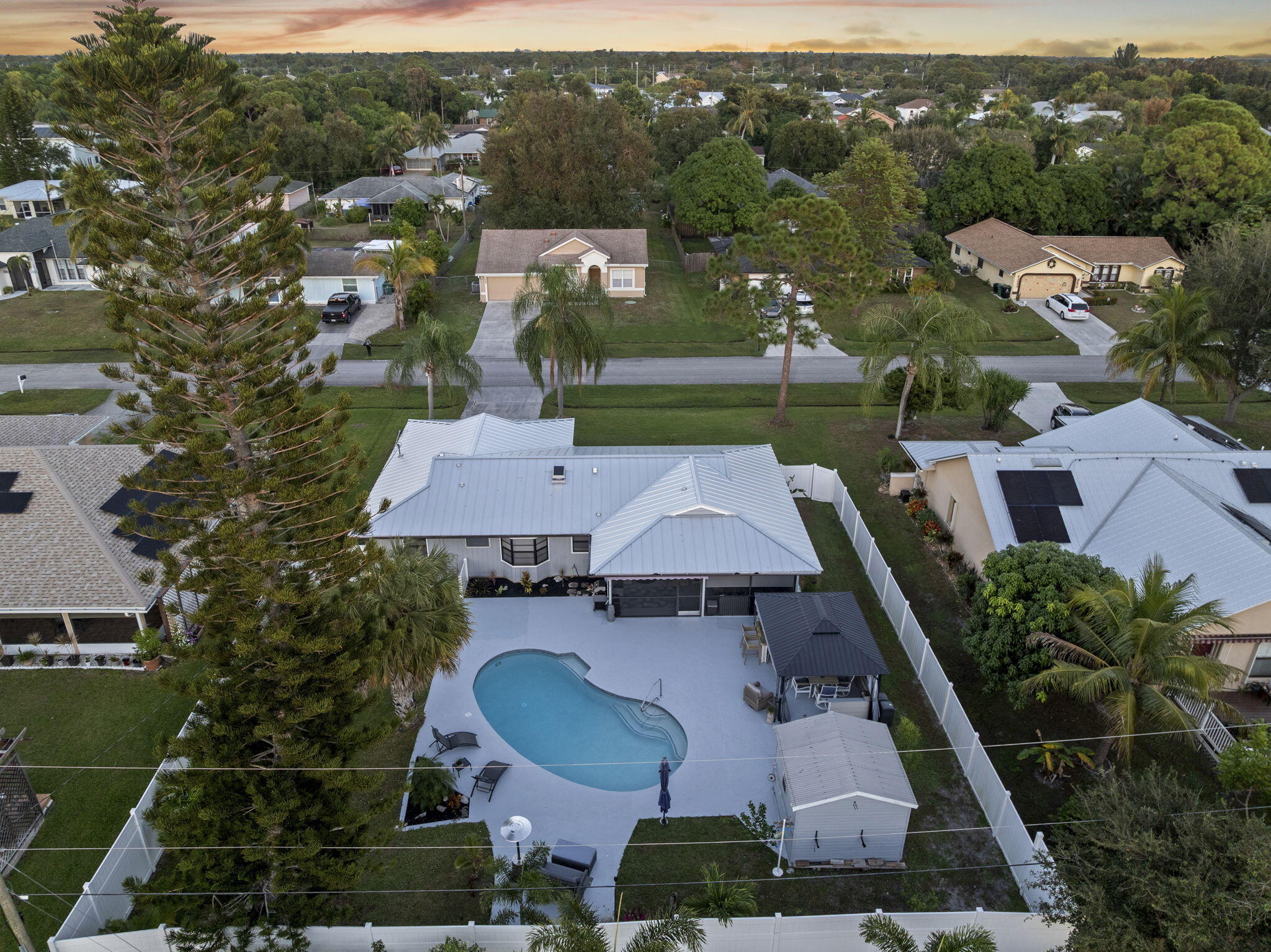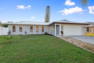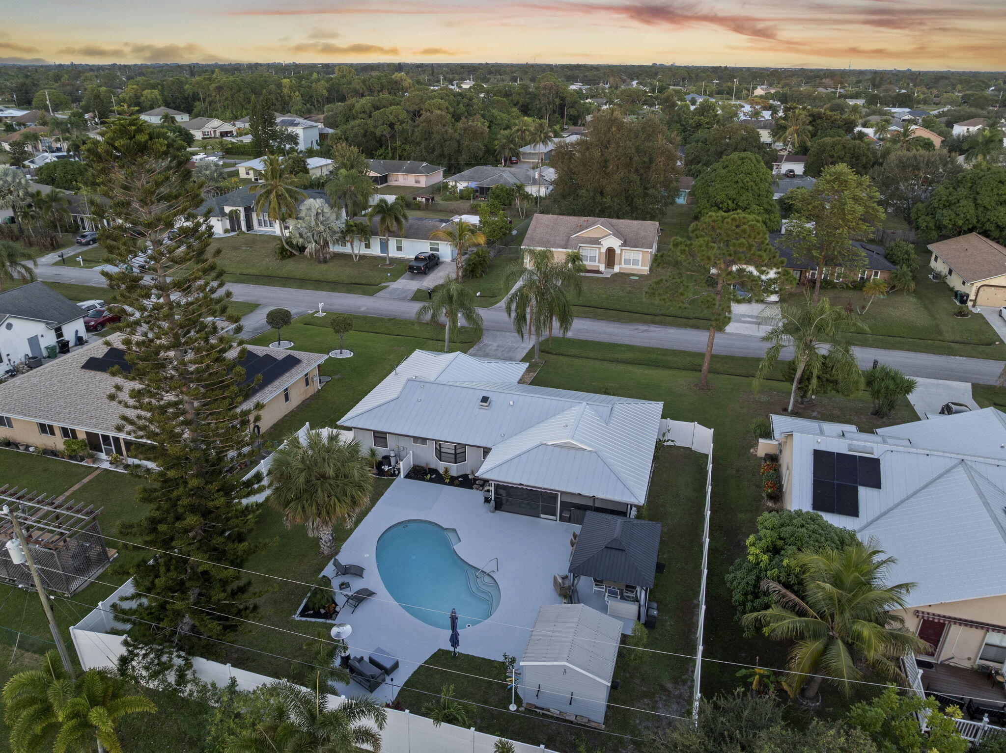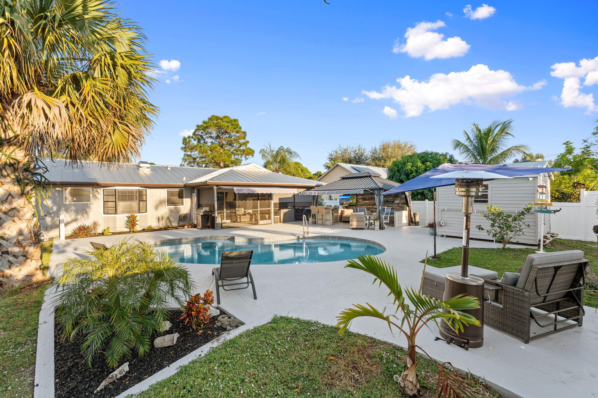 Are you searching for the perfect pool home in Port St. Lucie? This one deserves your attention. This 2 bed, 2 bath, 1154 sqft home offers a 2-car garage, a 2023 metal roof, & a saltwater pool with a covered bar, ideal for enjoying the Florida lifestyle. The home has been thoughtfully updated & is move-in ready. The entire pool was resurfaced and updated with a new salt system & equipment. The backyard was re-graded and enclosed with a new 8 ft PVC fence. Outdoor living is enhanced with a covered gazebo/bar/TV area, custom patio shades, & awnings blocking out the sun. New flooring and paint throughout. This smart-home is enabled with voice-controlled, a smart thermostat, & smart door lock. Prime location close to shopping, restaurants, award-winning healthcare, and quick access to I95