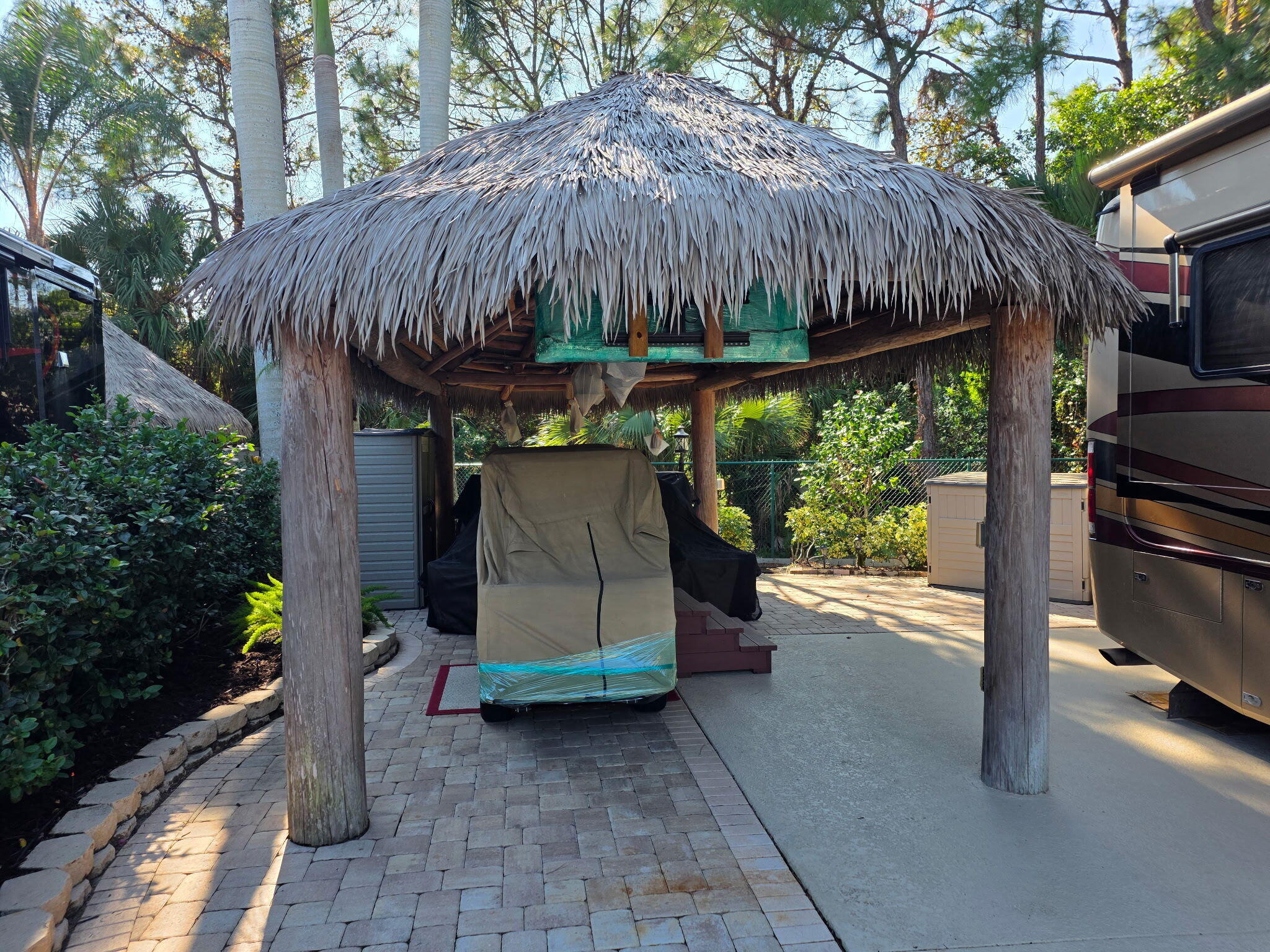 Enjoy the privacy of the preserve with this updated back in lot. Recently added Synthetic palm fronds for low maintenance on the nicely equipped tiki with kitchen! Plenty of room for vehicles and golf cart. Nice landscaping and paver accents this desirable lot. Storage bins and furnishings included. Lot faces cross street so easy back in access. A fantastic lot for warm weather getaway or rental income possibilities! Located in the Motorcoach Resort St Lucie West - a class A only resort. Amenities include 18 hole golf, pickleball, pools, spas, tennis, clubhouse, onsite manager with endless activities and social calendar and more!