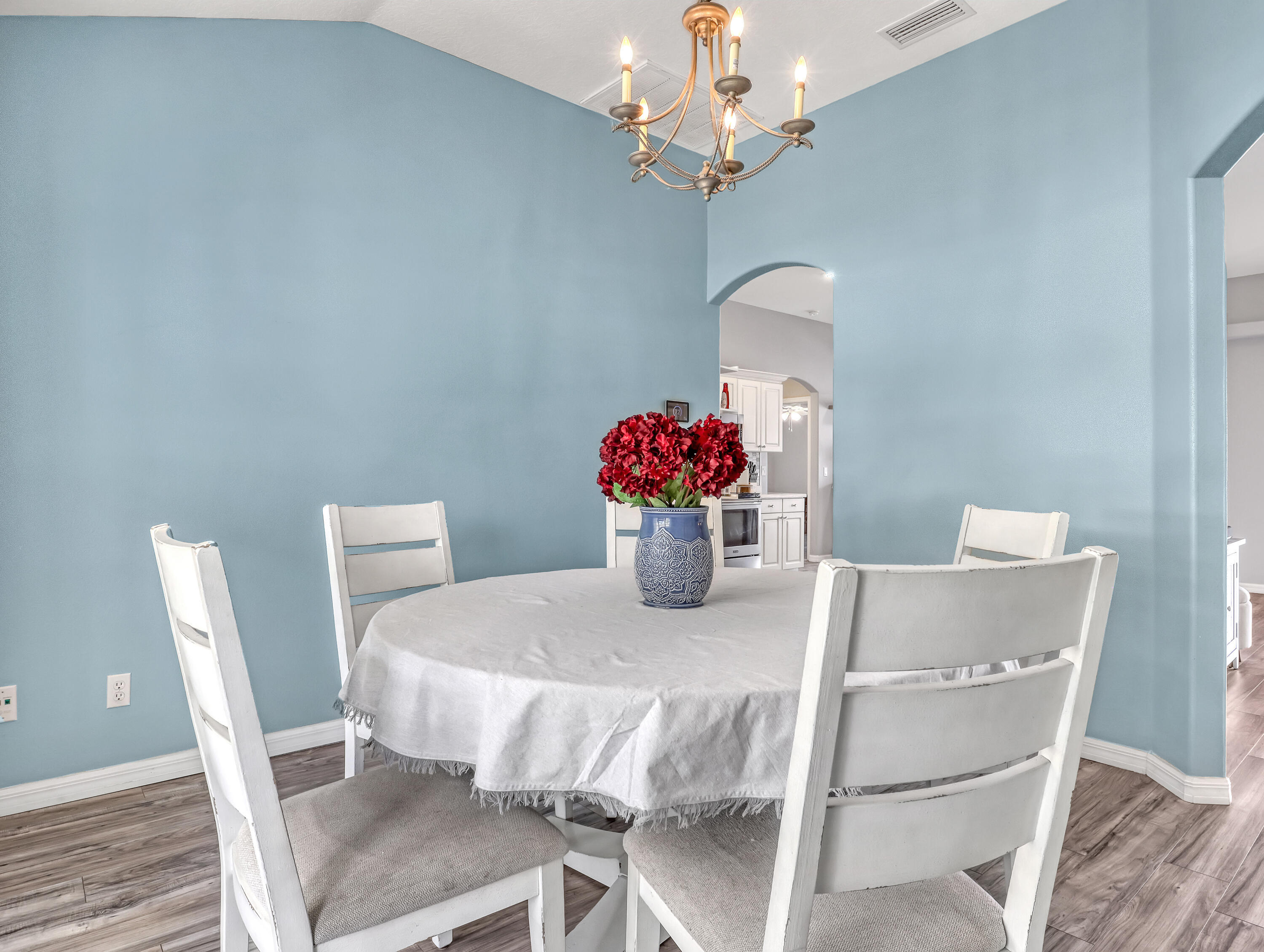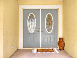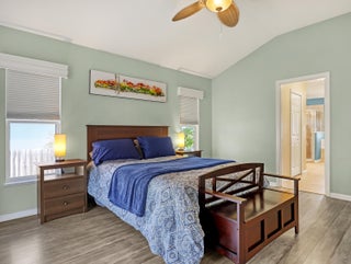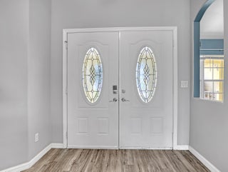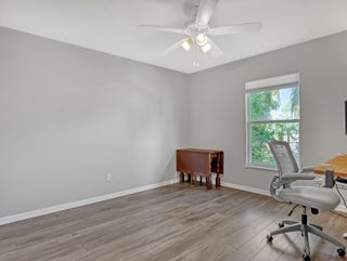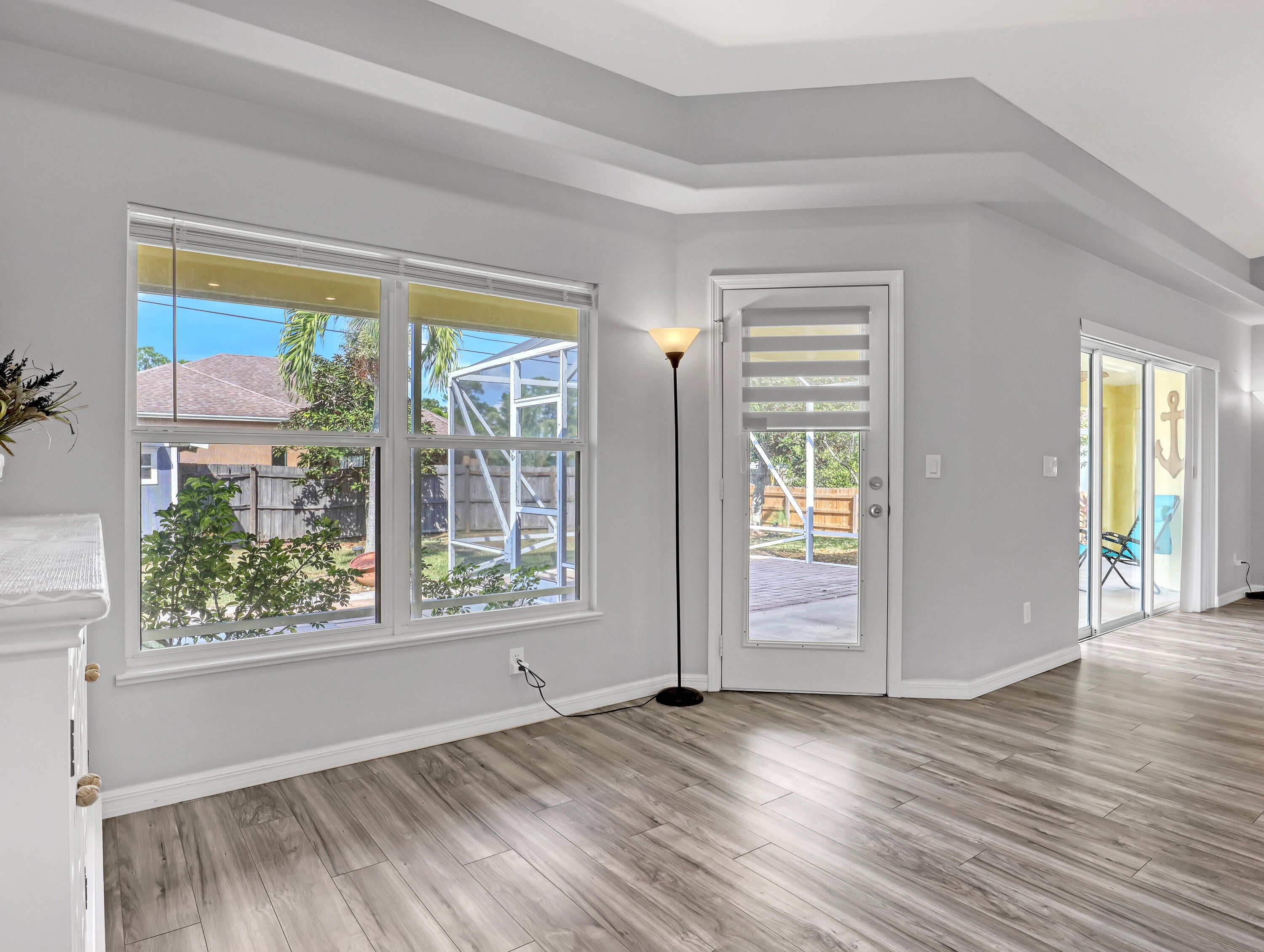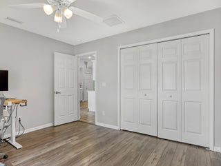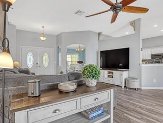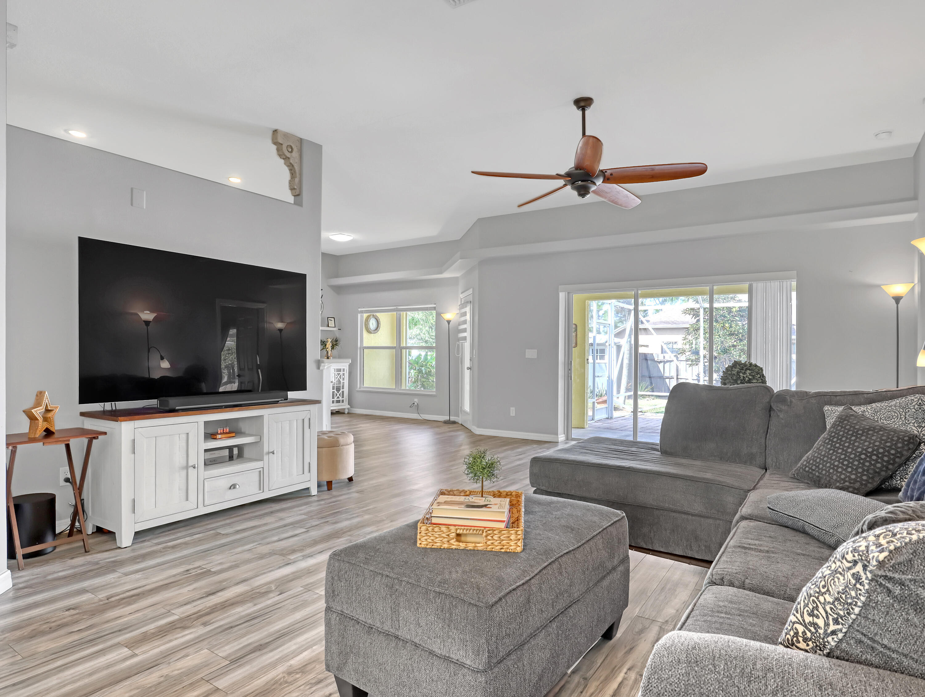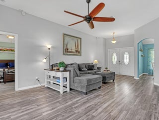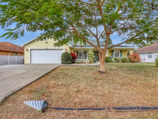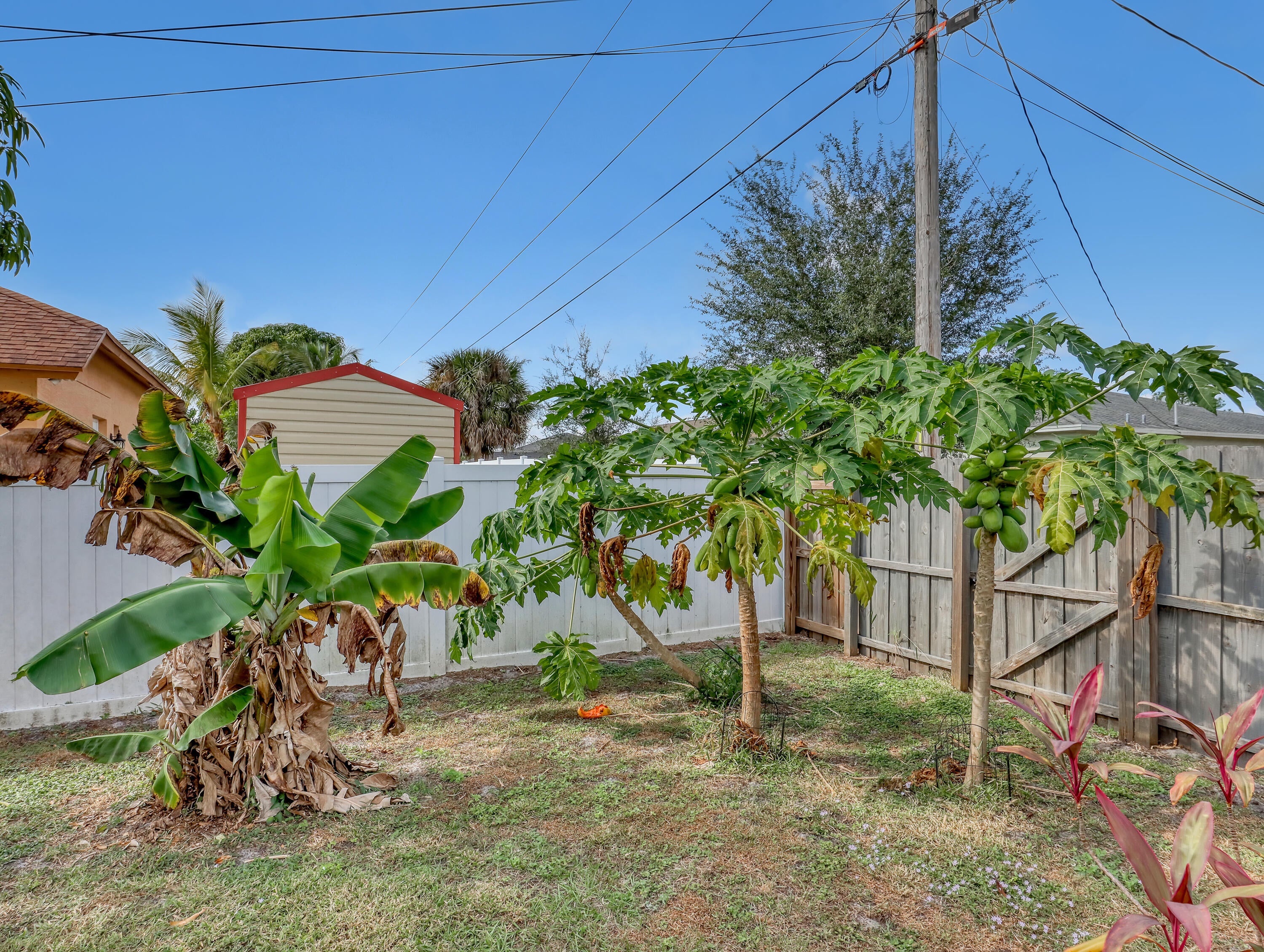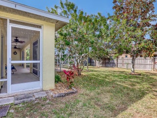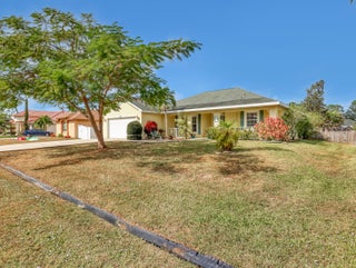 This immaculate 3 bedroom, 2 bath CBS home is perfectly located near I-95, Becker Road, Florida's Turnpike, and Tradition. A charming covered front porch--complete with a porch swing--welcomes you through double entry doors into bright living areas featuring vaulted ceilings, tile flooring, and updated wood-plank look floors in the main living spaces and primary suite.The spacious kitchen offers white cabinetry, solid-surface counters, stainless steel appliances, a custom backsplash, breakfast bar, and an inviting eat-in area overlooking the backyard. A formal dining room sits adjacent for easy entertaining.The owner's suite features a well-proportioned bedroom with sliding glass doors to the patio, his-and-her walk-in closets, and a relaxing bath with dualvanities, soaking tub, separate shower, and private water closet. Pocket sliders open from the living and primary bedroom to the screened, paver patioan ideal spot for morning coffee. The split bedroom floor plan and fenced backyard with Papaya, Mango and Banana trees as well as a storage shed in yard, an extended driveway for extra parking, A/C 2019, hurricane panels and no HOAbring your toys! This beautifully maintained home is the perfect blend of comfort and convenience. Prepare to fall in love!