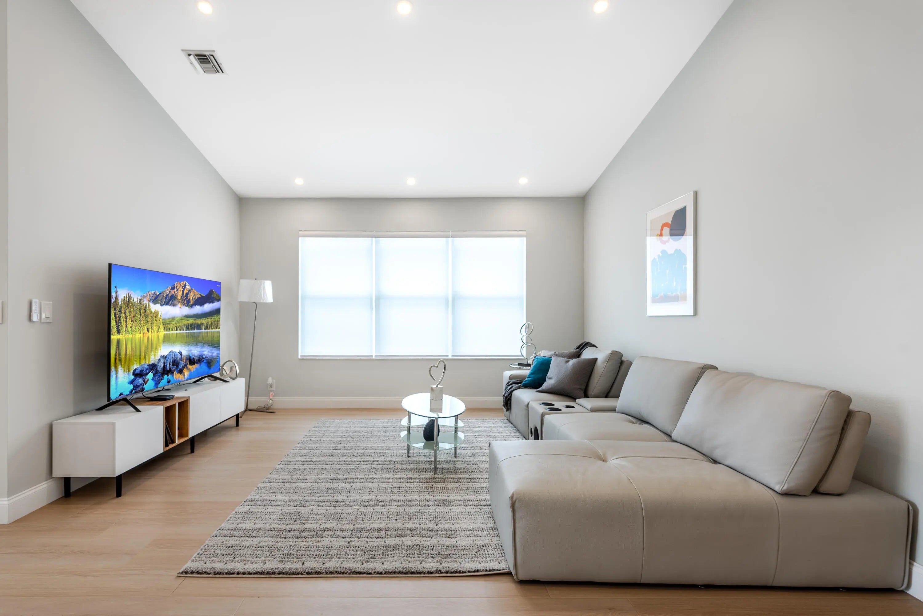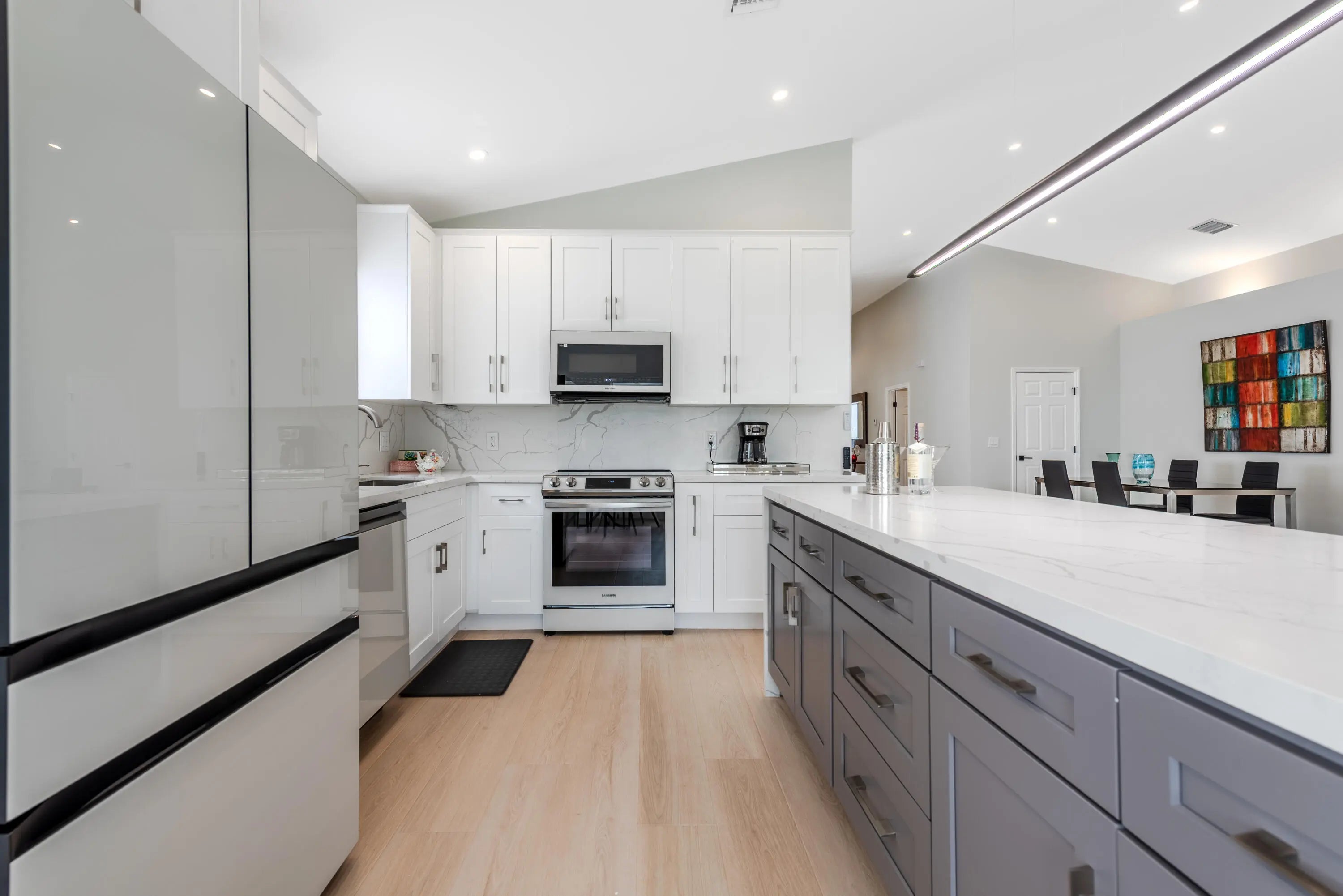 A stunning renovation, everything done to perfection, including a new roof and AC in 2024. Walk through the front door and you will see the beautiful lake view and fountain. Kitchen has been opened up and is a sleek, modern design with a huge island and quartz counters and backsplash. Bathrooms are spa-like with beatiful tile work and modern vanities. Very large model in community with expansive living space and a comfortable primary suite. The 3rd bedroom - den with double doors.Remote operated blinds thruout.Community - upgraded, active clubhouse with new pickleball courts and a large resort like pool. Friendly community.Recent quote to replace all windows with impact but owner travels regularly and has not done the work. Seller will credit amount to Buyer.