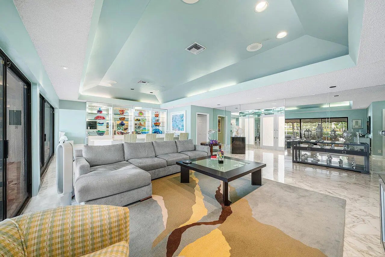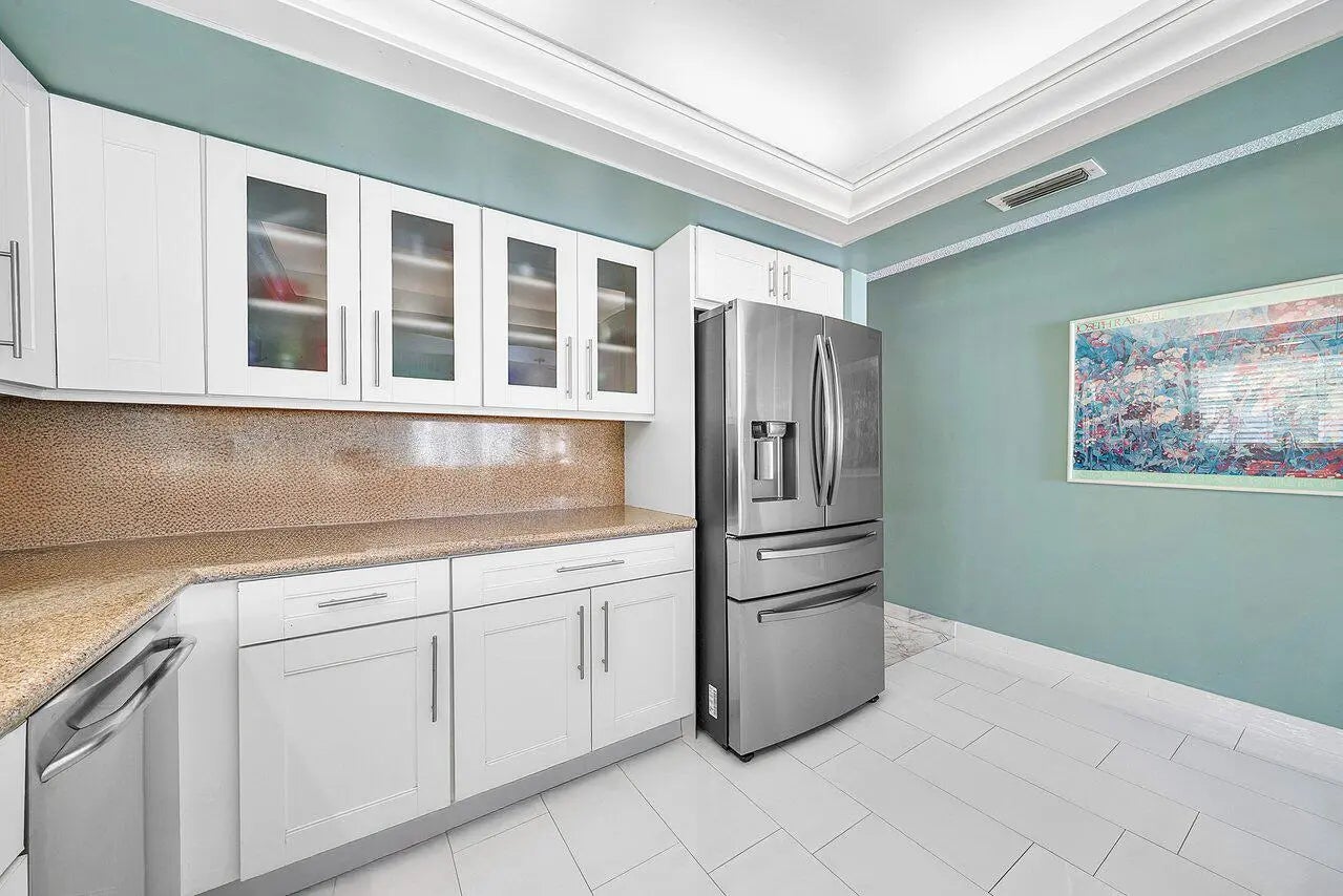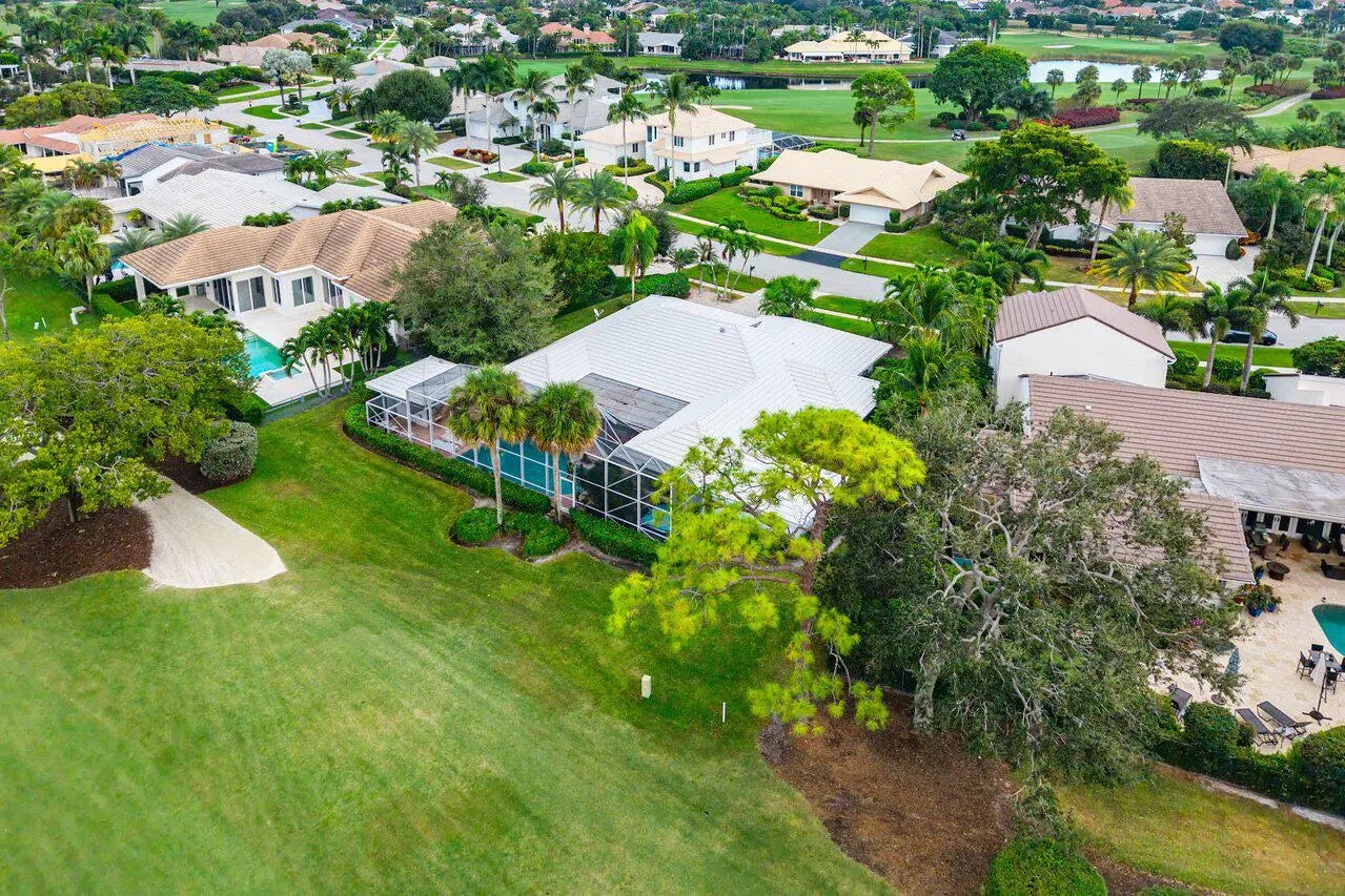 Situated on a quiet cul-de-sac street and just a short walk to the clubhouse, this home offers a wonderful opportunity to enjoy lakefront living with beautiful sunset views and sweeping golf course scenery. Set on over one-third of an acre, the property features a spacious layout with two primary suites, each with generous walk-in closets and en-suite baths. Elegant European marble flooring, coffered ceilings, and custom built-ins add to the home's appeal, while formal living and dining areas provide great space for entertaining. The kitchen includes updated white soft-close cabinetry, offering an ideal base for your own personal enhancements. A large den/office can also serve as a third bedroom to meet your lifestyle needs. Additional highlights include a three-zone HVAC system and an