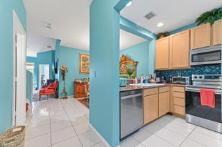 Prepare to be mesmerized by this one-of-a-kind townhome, where vibrant artistic design meets an ideal functional layout. The exterior features attractive Mediterranean architecture with a tile roof and a brick-paver walkway leading to the covered entry and attached garage. The living room boasts soaring vaulted ceilings and is bathed in light, flowing seamlessly through sliding glass doors to the screened patio. The dining area is highlighted by a glamorous, oversized gold-framed mirror and a classic chandelier. The kitchen is efficiently laid out with warm wood cabinetry, granite counters, and stainless steel appliances.