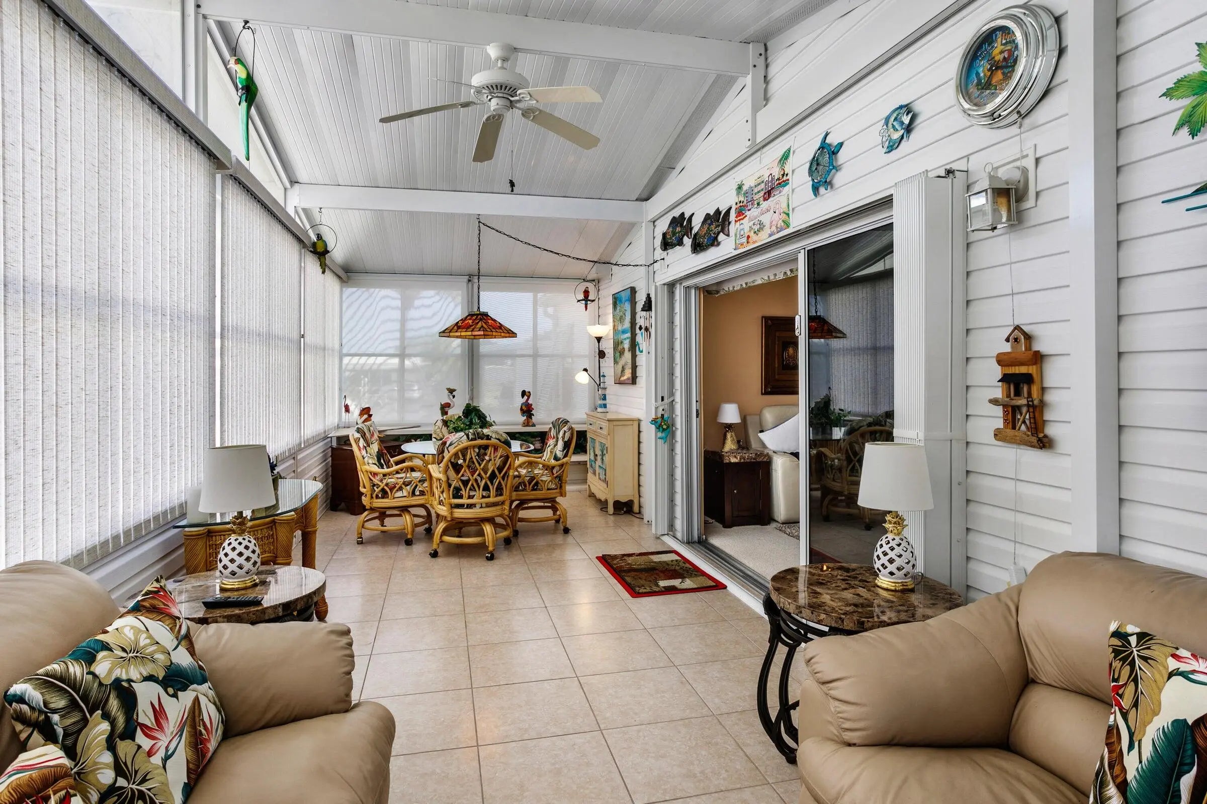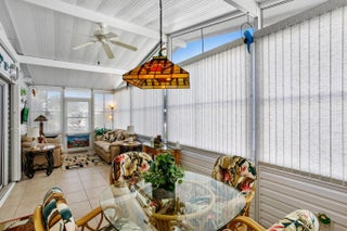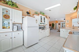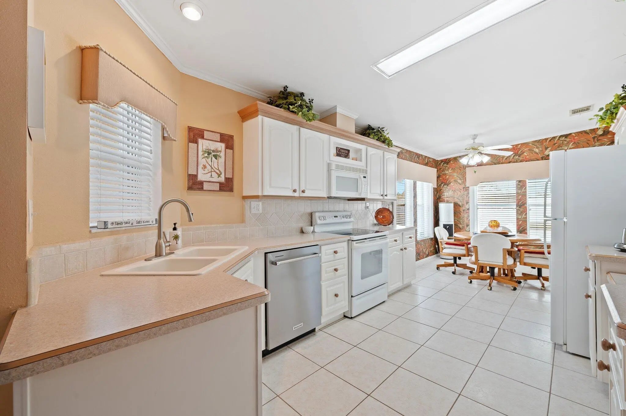 Charming Home in Prime Cul-de-Sac Location. Home is ideally situated at the end of a quiet cul-de-sac. Built with quality drywall construction and featuring elegant crown molding, it offers a spacious, raised enclosed patio with wall-to-wall windows. A top of the line Palm Harbor Home. Recent updates include a newer A/C unit, water heater, new stainless steel dishwasher, kitchen faucet, and dryer. The thoughtfully designed split floor plan features generously sized bedrooms throughout. The kitchen boasts white cabinetry, ample counter space, a large walk-in pantry with floor-to-ceiling shelving, and a cozy eat-in area. Adjacent to the kitchen is indoor laundry equipped with abundant shelving. The formal dining room includes a built-in buffet. The living room features vaulted ceilings