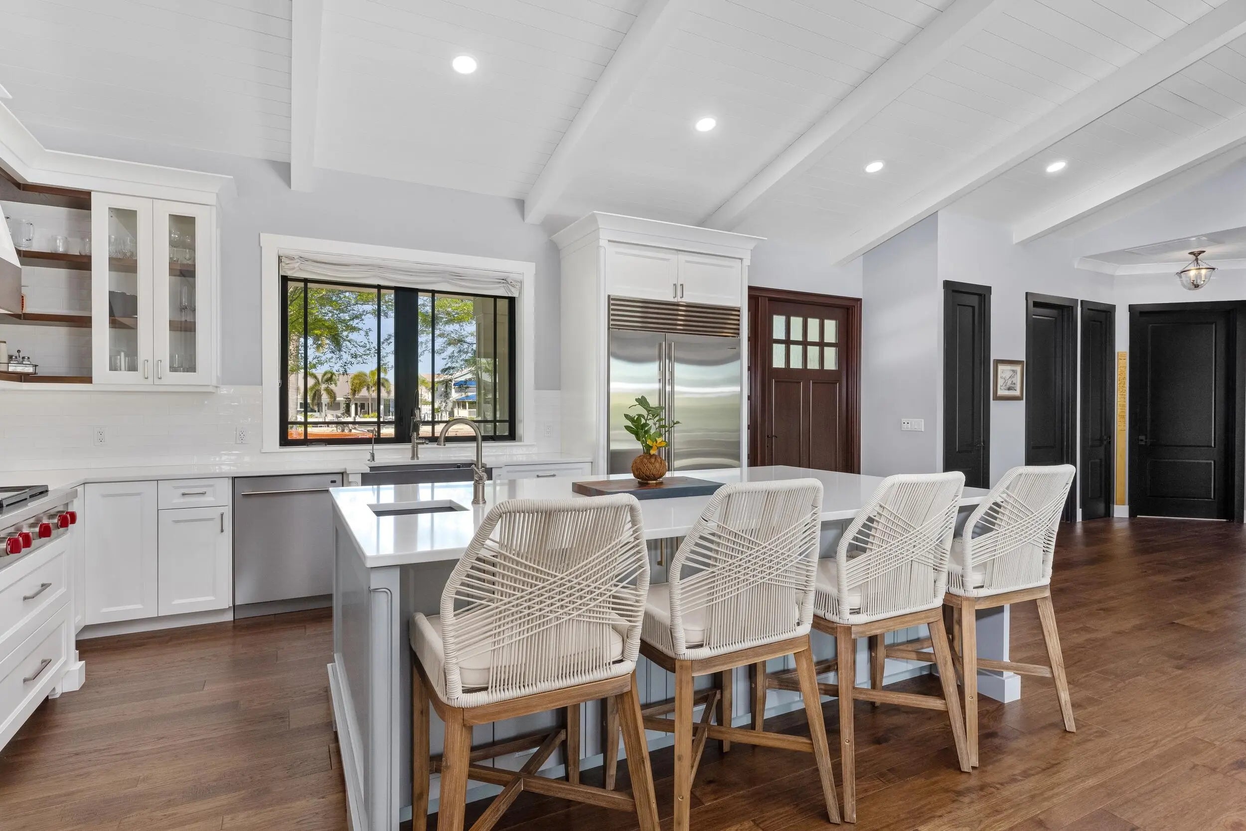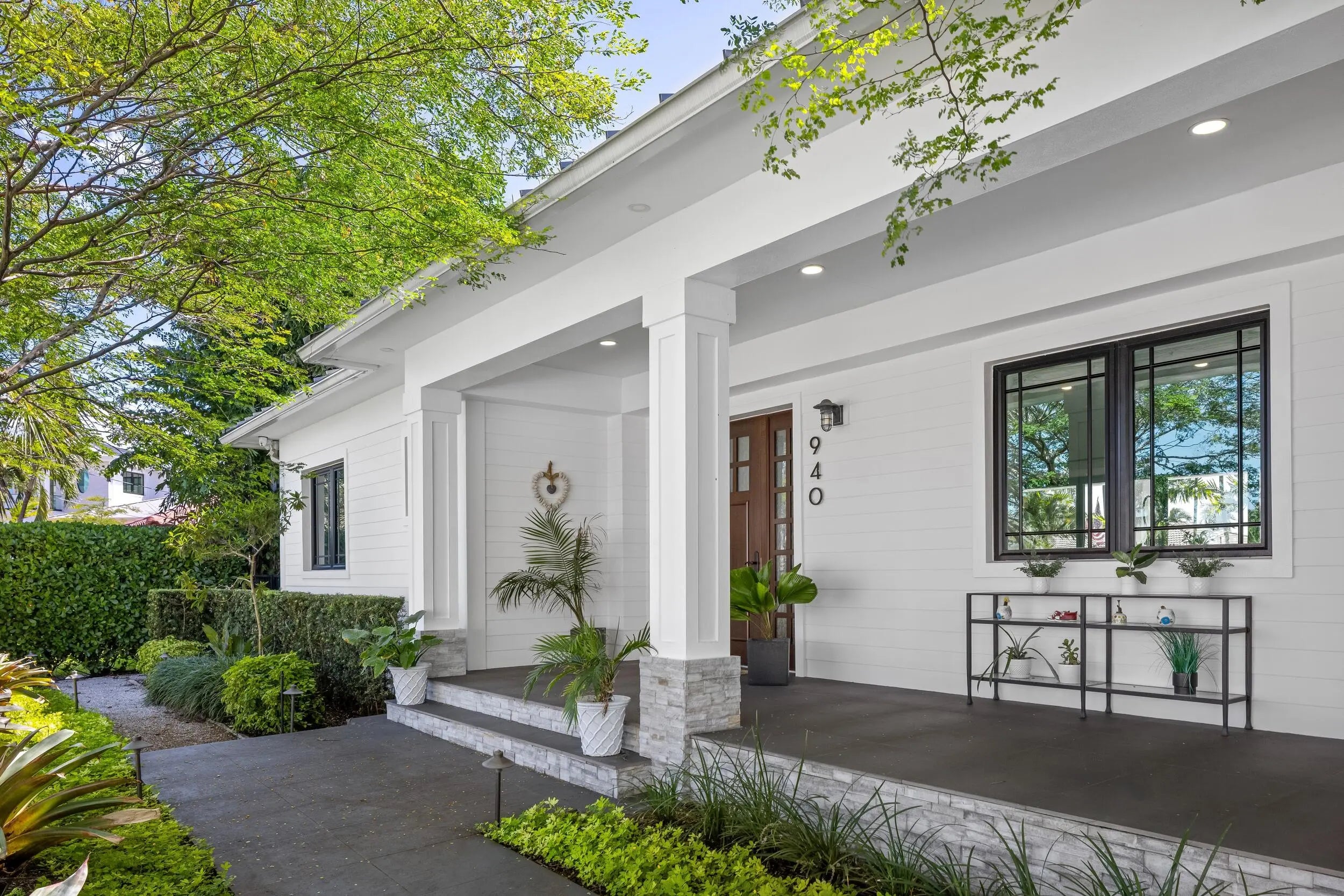 An incredible waterfront residence minutes from the Boynton Beach Inlet is a rare gem. Located in the exclusive boating community of Boynton Isles at 940 Greenbriar Drive, this immaculate 3 bedroom, 2.5 bathroom single-story modern home was completely rebuilt in 2019 with all new plumbing, electrical, and structural components, offering everything needed to live the ideal Florida lifestyle at its finest. With 90 feet of direct water frontage, this home provides no fixed bridge access and sits just two miles from the inlet. Perfect for outdoor entertaining is a nature-infused luxurious backyard surrounded by lush landscaping.