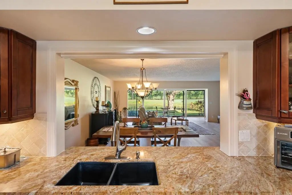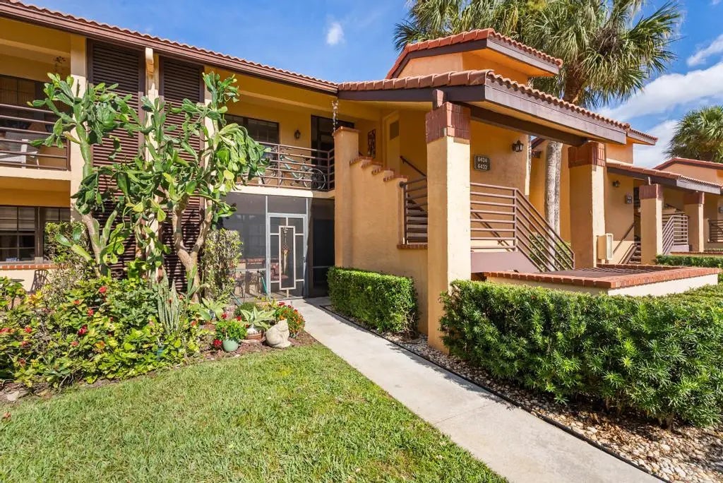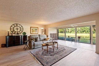 Stunning first floor unit with most amazing golf and water views! Oversized 2 bed, 2 bath condo with enclosed florida room, adding to the living sqft. (1626 liv) Separate bedroom floor plan for ultimate privacy. Beautiful updated kitchen with glass cabinets, granite counters. NEW floors throughout except 2nd bedroom! Both baths updated.HWH 2025, AC 2015. Gated plus roving security. HOA fee includes lawn, cable, insurance, community pool. Unit comes with large storage closet and front porch area!