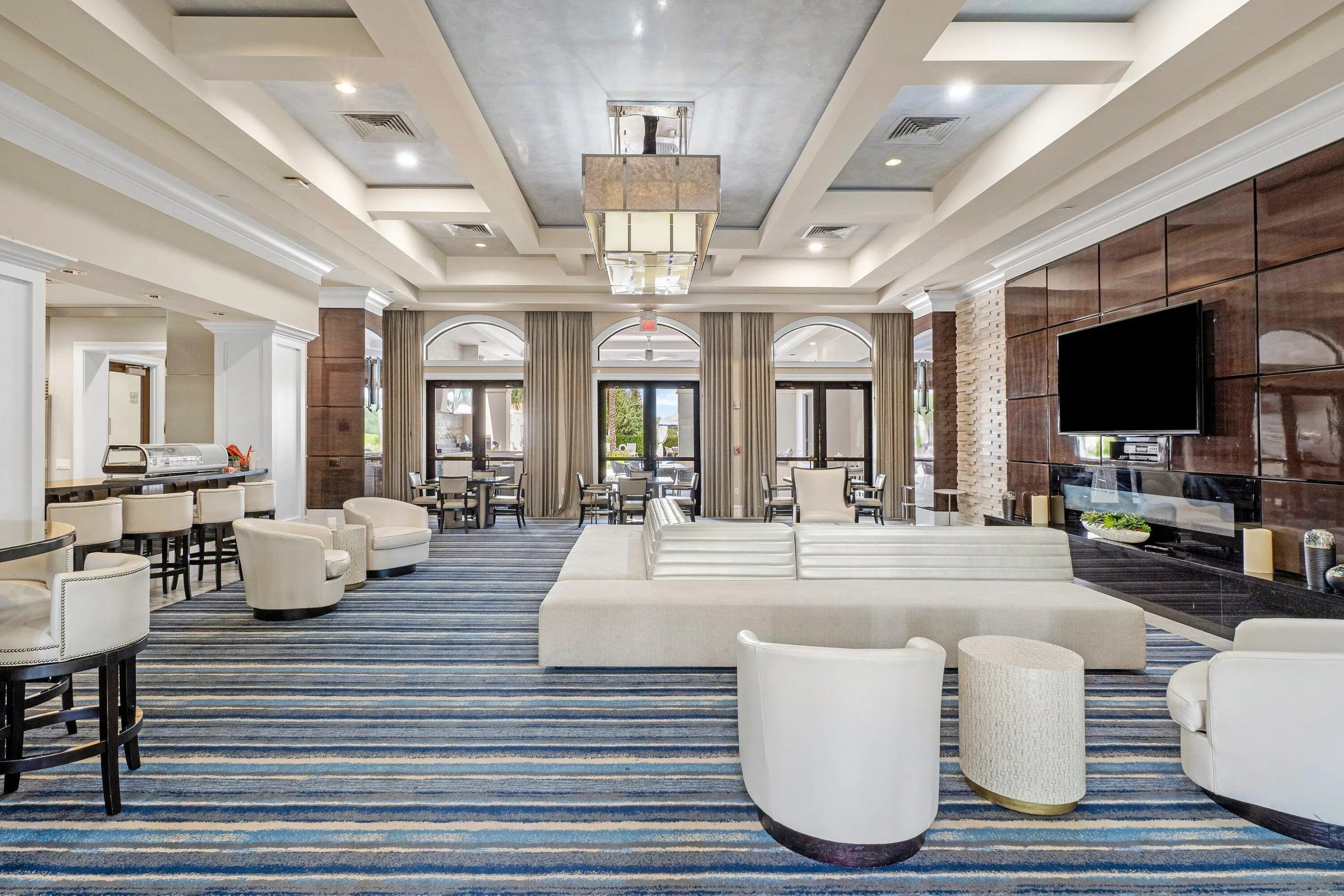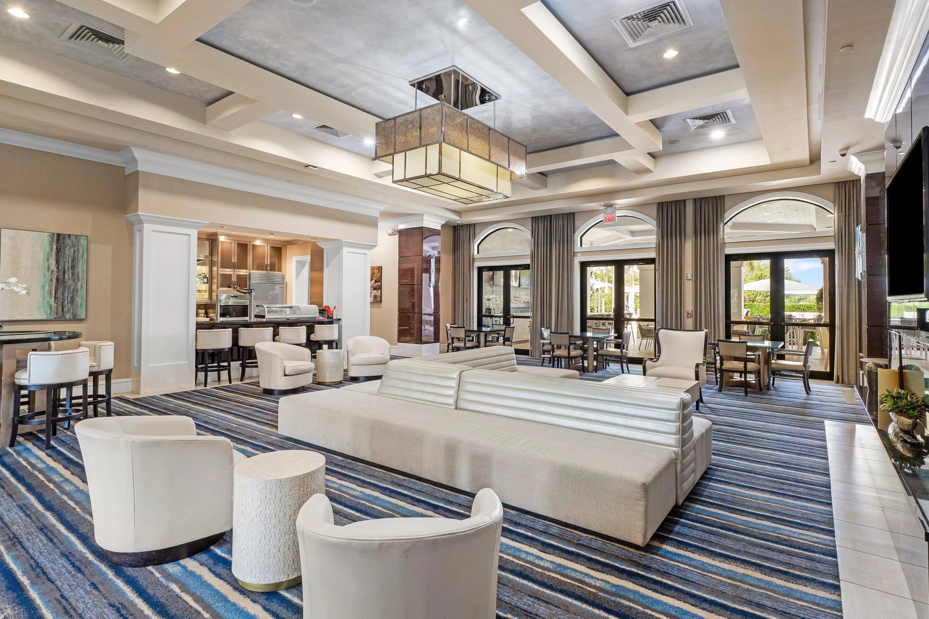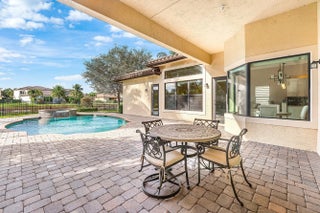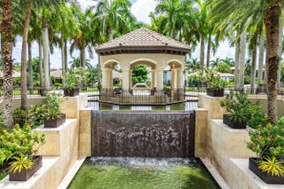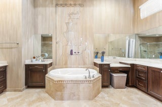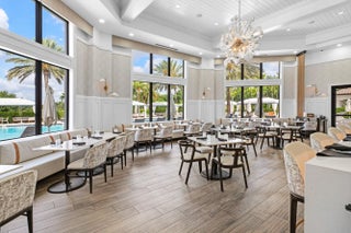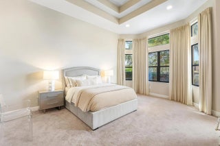 Experience elevated lakefront living in this exceptional single-story Venetian Model from the Coastal Collection, located in the prestigious gated community of The Bridges. This expanded residence welcomes you with a dramatic double-height foyer leading to a stately living room, formal dining room, and spacious family room. Marble flooring, volume coffered ceilings, and a custom wet bar create a refined and inviting atmosphere.Expansive windows showcase breathtaking lake and pool views, seamlessly blending indoor elegance with outdoor tranquility. The heated saltwater pool and spa are surrounded by lush landscaping and capture stunning sunset vistas across the approximate 1/3-acre lot.