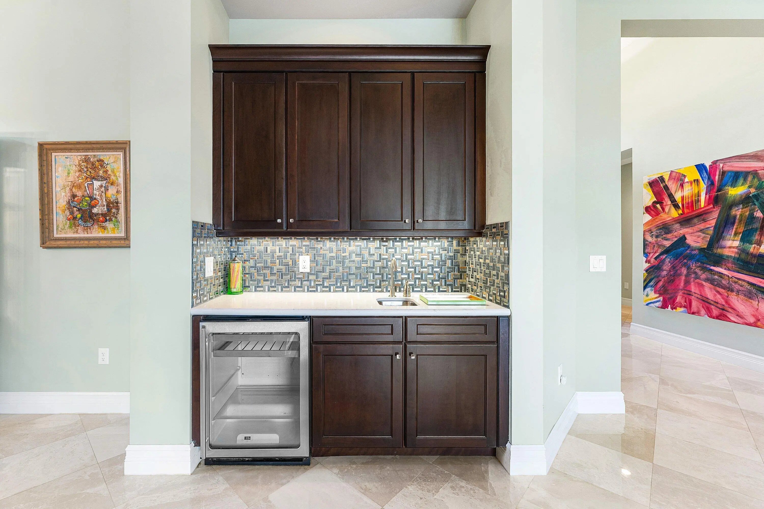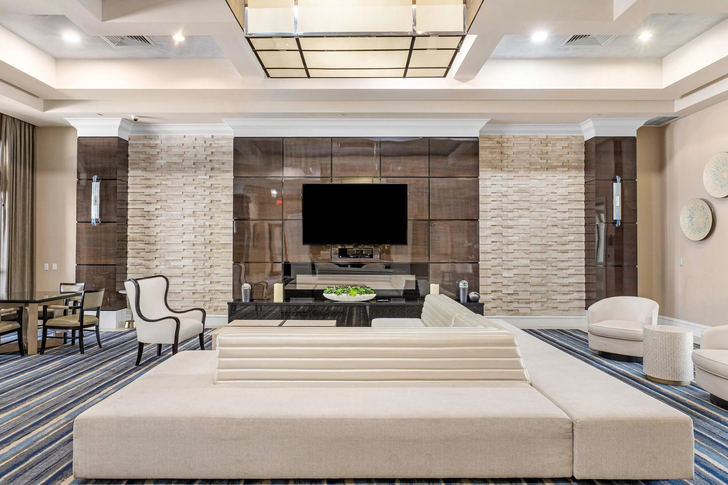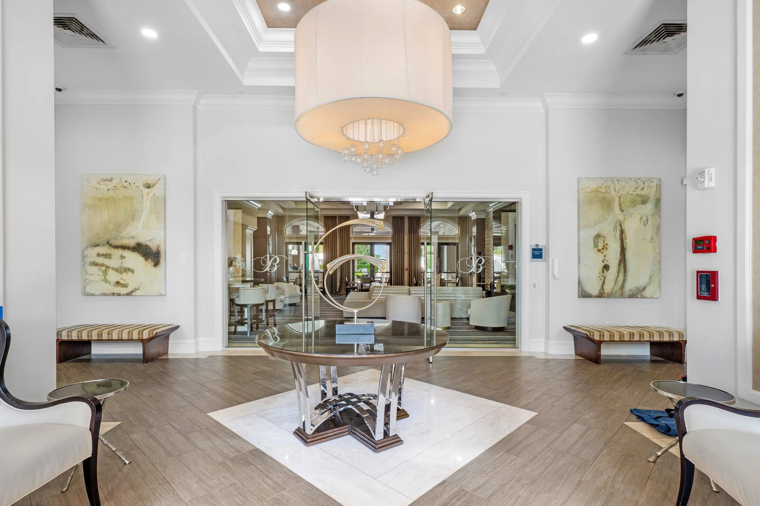 Experience elevated lakefront living in this exceptional single-story Venetian Model from the Coastal Collection, located in the prestigious gated community of The Bridges. This expanded residence welcomes you with a dramatic double-height foyer leading to a stately living room, formal dining room, and spacious family room. Marble flooring, volume coffered ceilings, and a custom wet bar create a refined and inviting atmosphere.Expansive windows showcase breathtaking lake and pool views, seamlessly blending indoor elegance with outdoor tranquility. The heated saltwater pool and spa are surrounded by lush landscaping and capture stunning sunset vistas across the approximate 1/3-acre lot.