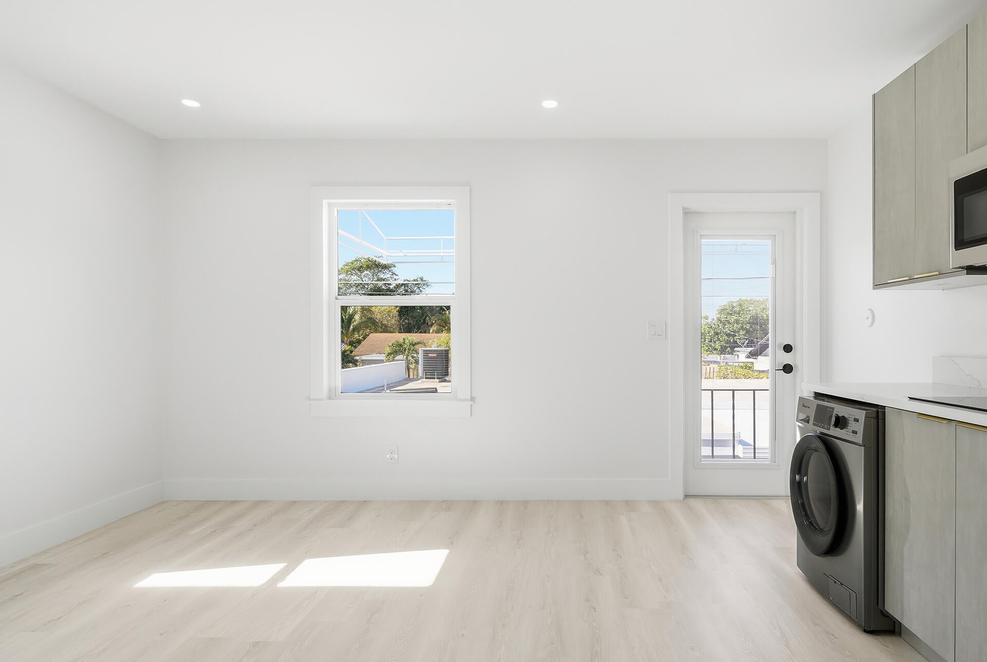 Newly renovated upstairs one-bedroom, one-bath apartment accessed via stairs and available for immediate occupancy in the SoSo area. This light and bright unit has been fully updated from top to bottom, including new flooring, updated kitchen and bath, new appliances, and modern finishes throughout. The kitchen is equipped with a cooktop, microwave, refrigerator, and washer/dryer combo. Located on S. Dixie Highway above commercial space, offering convenient access to nearby restaurants, shops, tennis, golf, the Intracoastal Waterway, beaches, and downtown West Palm Beach. Two residential units are located side-by-side; this listing represents one individual unit. Shared rooftop terrace. Street parking. No pets. First month, last month, security deposit, and background check required.