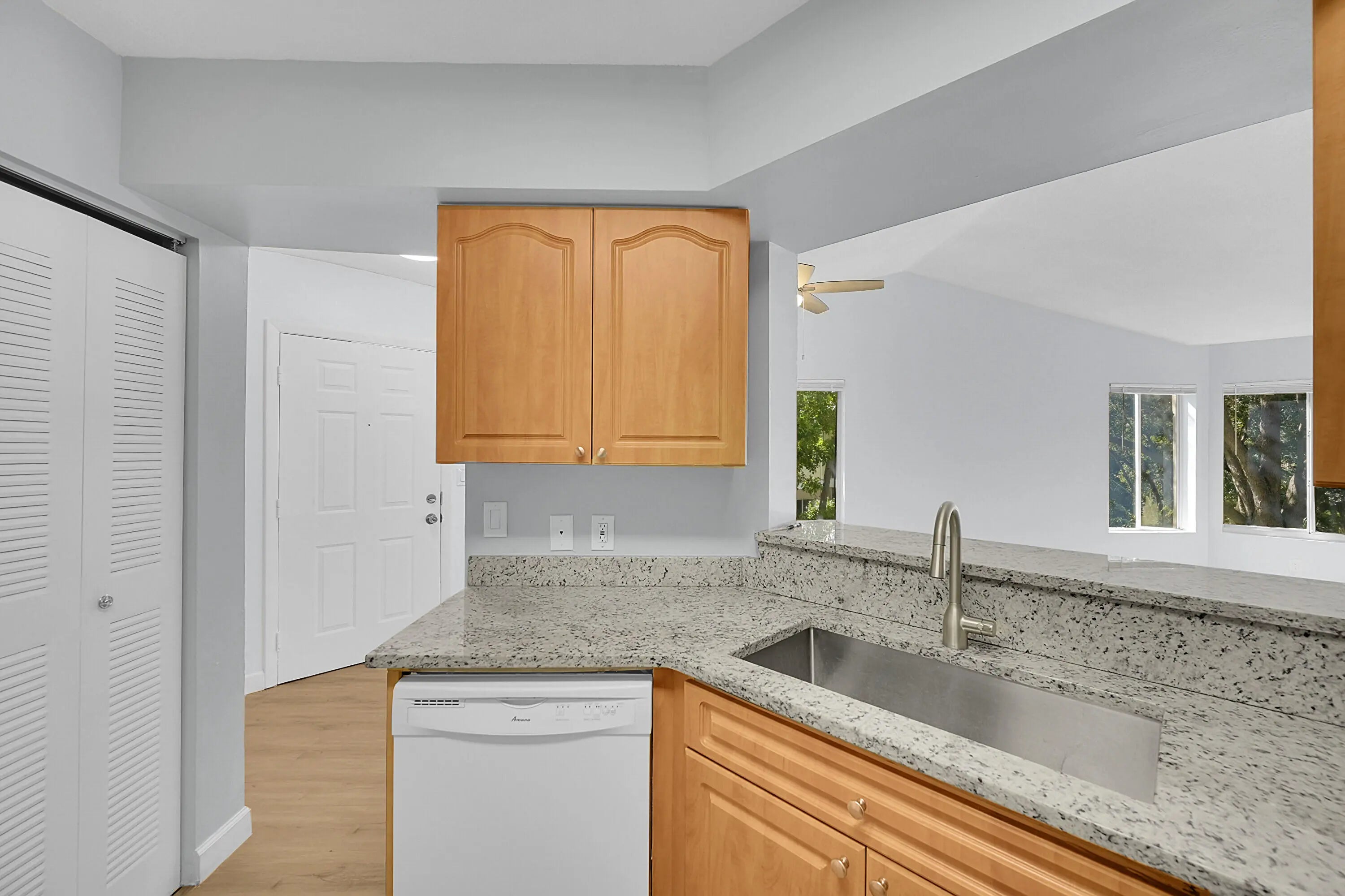 Spacious 2-bedroom, 2-bath second-floor end unit offering extra privacy and comfort. Freshly painted, thoroughly cleaned, and move-in ready! Upgraded wood laminate flooring throughout the condo. Enjoy a peaceful screened patio off the living room with relaxing views of the canal and surrounding nature. The spacious kitchen has upgraded granite countertops and features a breakfast bar and a large kitchen sink with a new garbage disposal. Convenient assigned parking, plus access to community amenities including a sparkling pool, clubhouse, and tennis courts -- a wonderful place to call home.