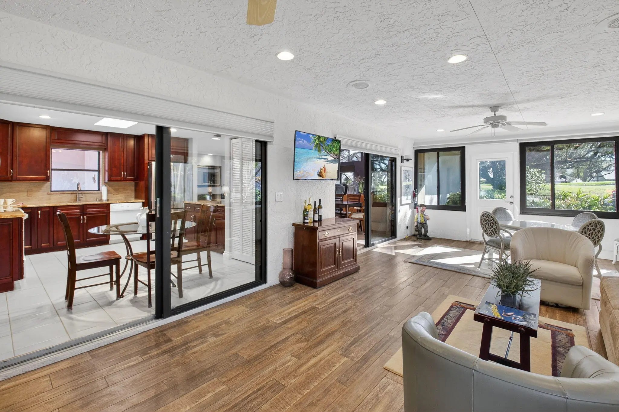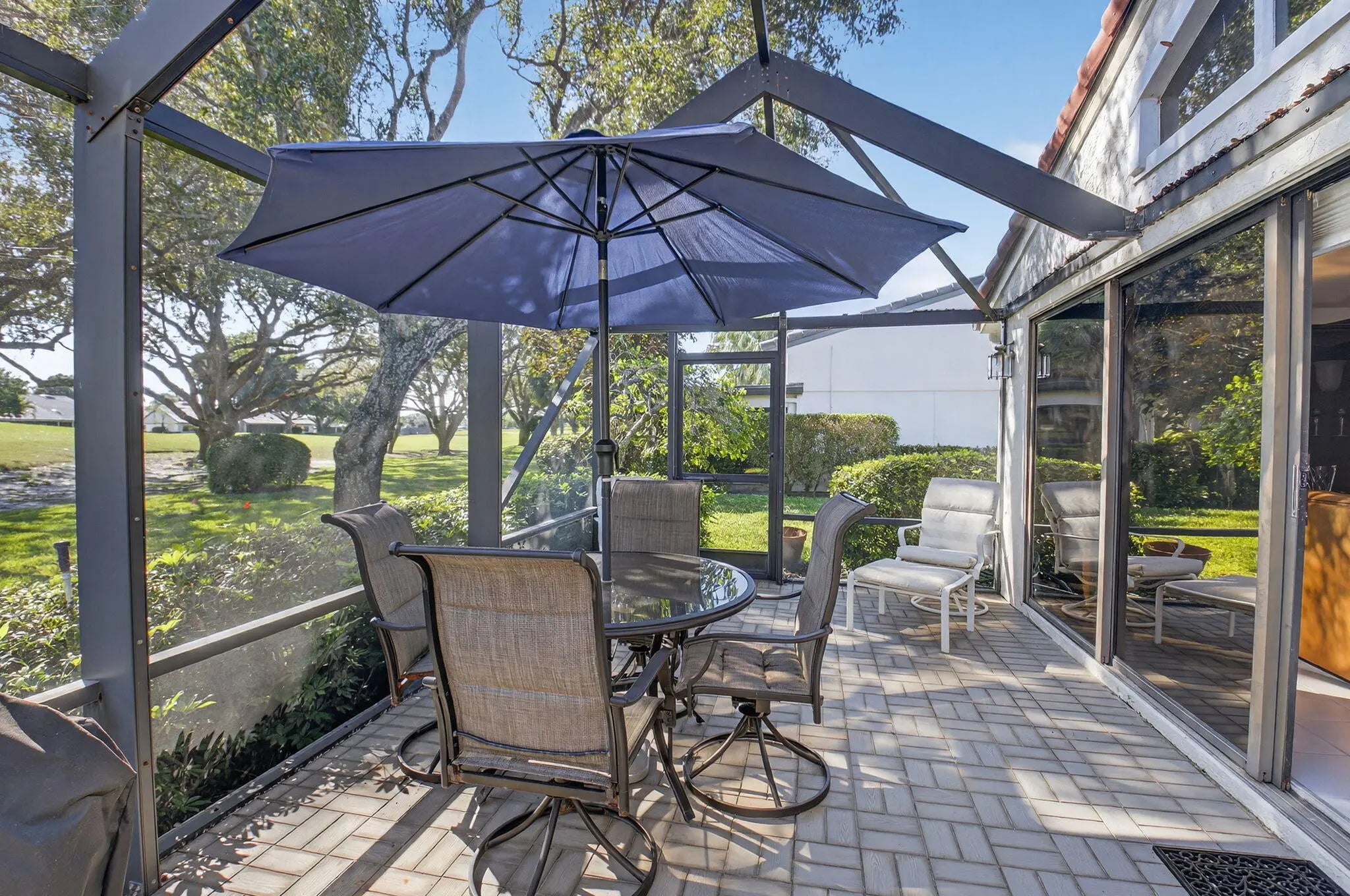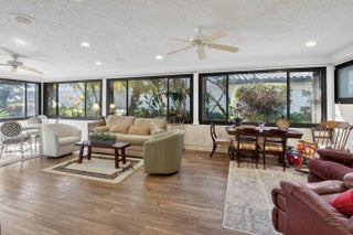 Located in the highly desirable Bristol section of Hunters Run Country Club, this beautifully maintained single-family home offers an exceptional blend of comfort, elegance & functionality. Featuring 2 spacious bedrooms w/ en suite bathrooms, plus a versatile convertible 3rd bedroom/den, an ideal layout for both everyday living & hosting guests. As you enter, you are welcomed by an impressive living room highlighted by soaring double cathedral ceilings & dramatic clerestory windows that fill the home w/ natural light. The open, airy ambiance is enhanced by neutral white tile flooring throughout the main living areas, creating a bright & inviting atmosphere . Open Kitchen concept, granite counters & breakfast bar. Large Screened Lanai w/golf course views. POOL LOT!! A MUST SEE!!!