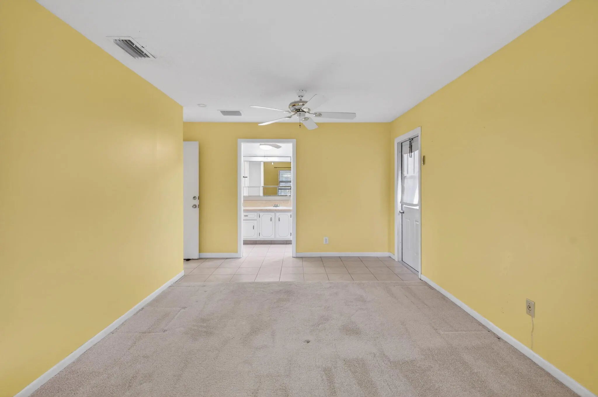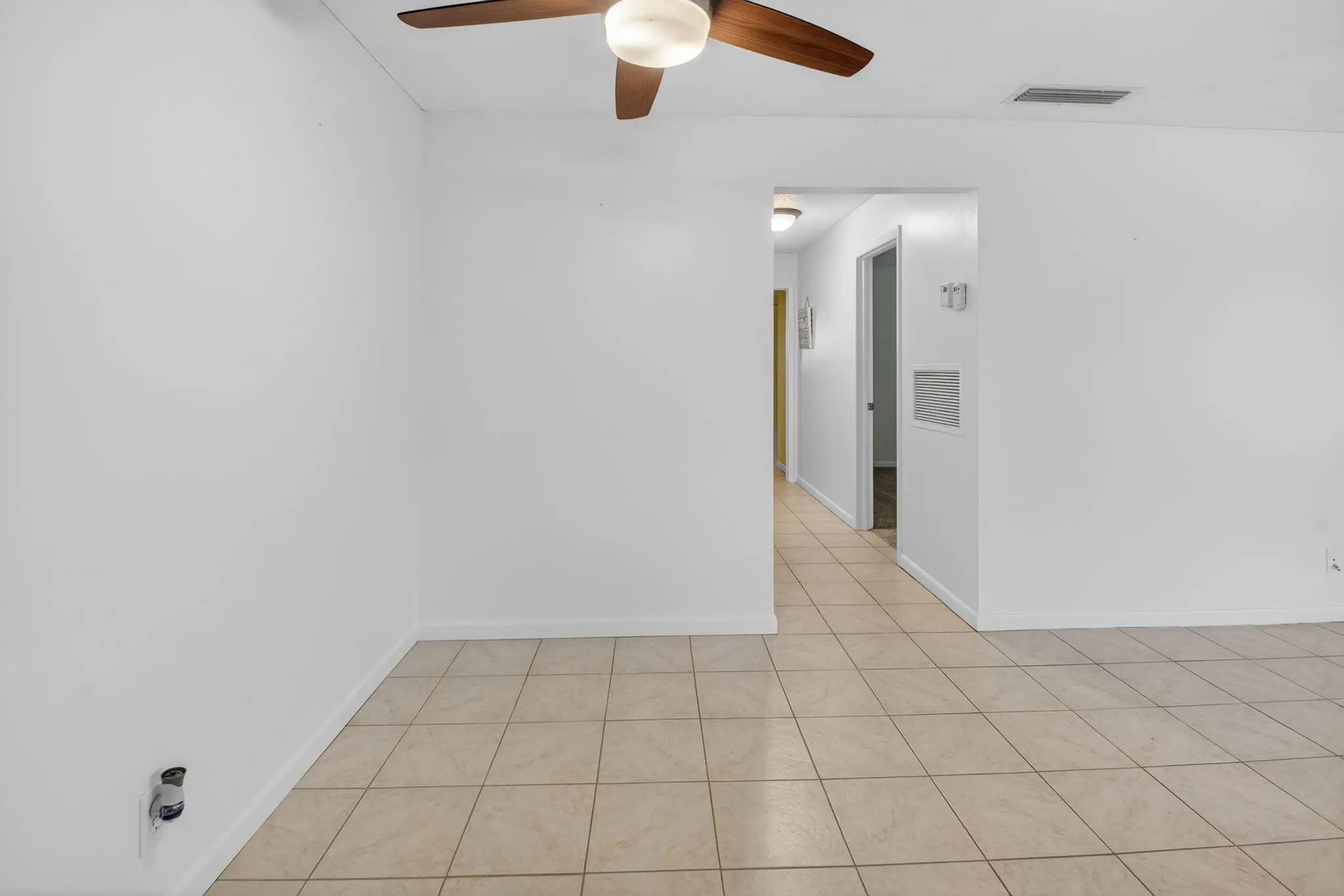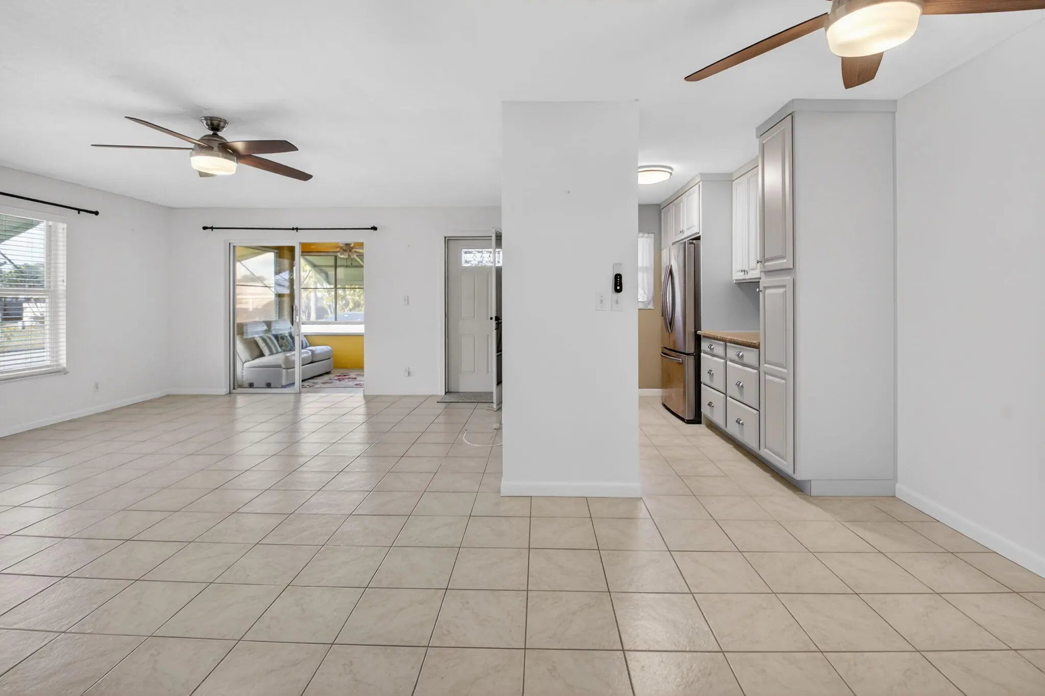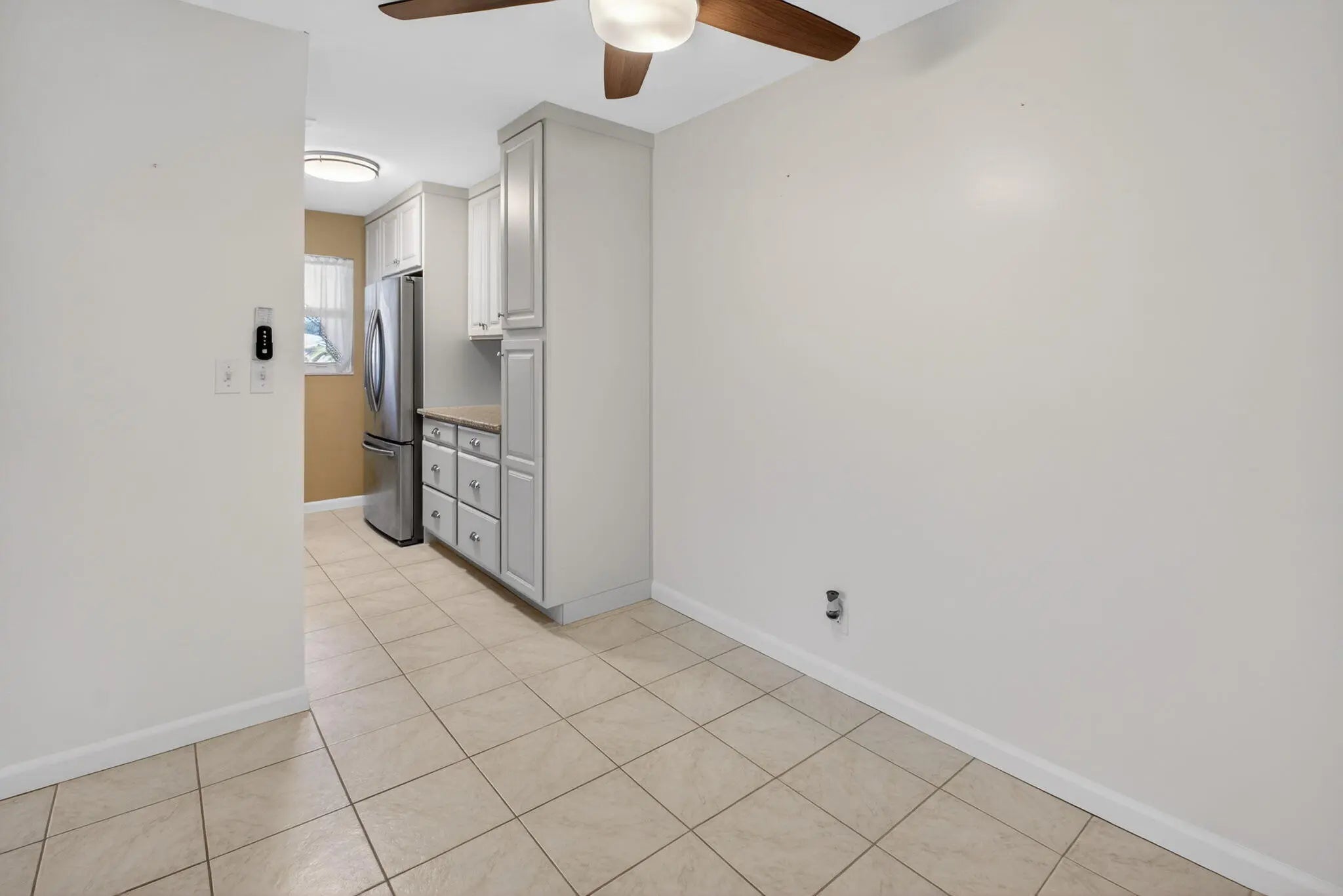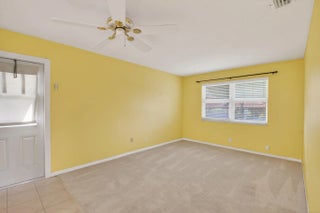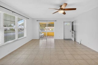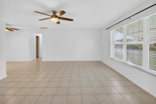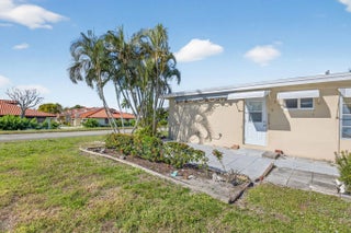 Welcome to this beautifully maintained 2-bedroom, 2-bath corner villa located in the highly desirable 55+ community of High Point in Boynton Beach. Set at the end of a quiet street, this residence enjoys exceptional privacy with lush lawn space on three sides and peaceful surroundings--ideal for year-round living or a seasonal retreat. A brand-new roof in 2025 adds long-term value and peace of mind. The interior is spotless and move-in ready, featuring tile flooring throughout the main living areas and neutral carpeting in the bedrooms. The spacious open living and dining area is filled with natural light, enhanced by hurricane-rated windows and additional awnings on all openings for comfort and protection. The tastefully updated kitchen offers sleek finishes with white cabinetry, granite