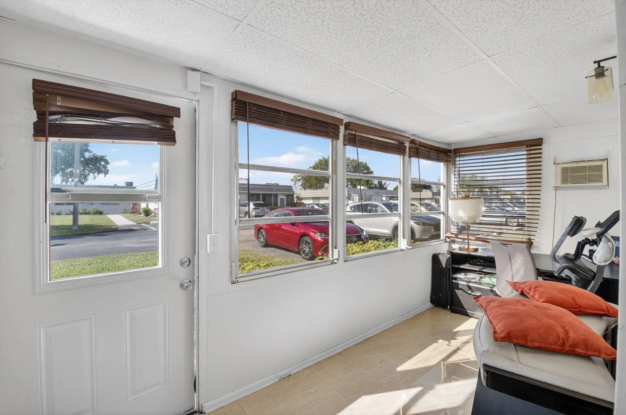 Light-filled, cozy corner condo-villa offering one of the most inviting villa-style opportunities currently available in the sought-after Valencia section of Kings Point. Windows on three sides create an airy feel throughout the home. Just outside the front entrance a few steps to the right, a landscaped common area offers scenic water views and frequent wildlife sightings. This 1-bedroom, 1.5-bath residence features an updated kitchen with island, updated baths, new laminate flooring, updated lighting and doors, and an enclosed Florida room with porcelain flooring and a full-size washer and dryer. A/C replaced April 2021 with air purifier. Furnishings negotiable.Residents enjoy extensive community amenities. Minutes to shopping, dining, downtown Delray Beach, and the ocean.