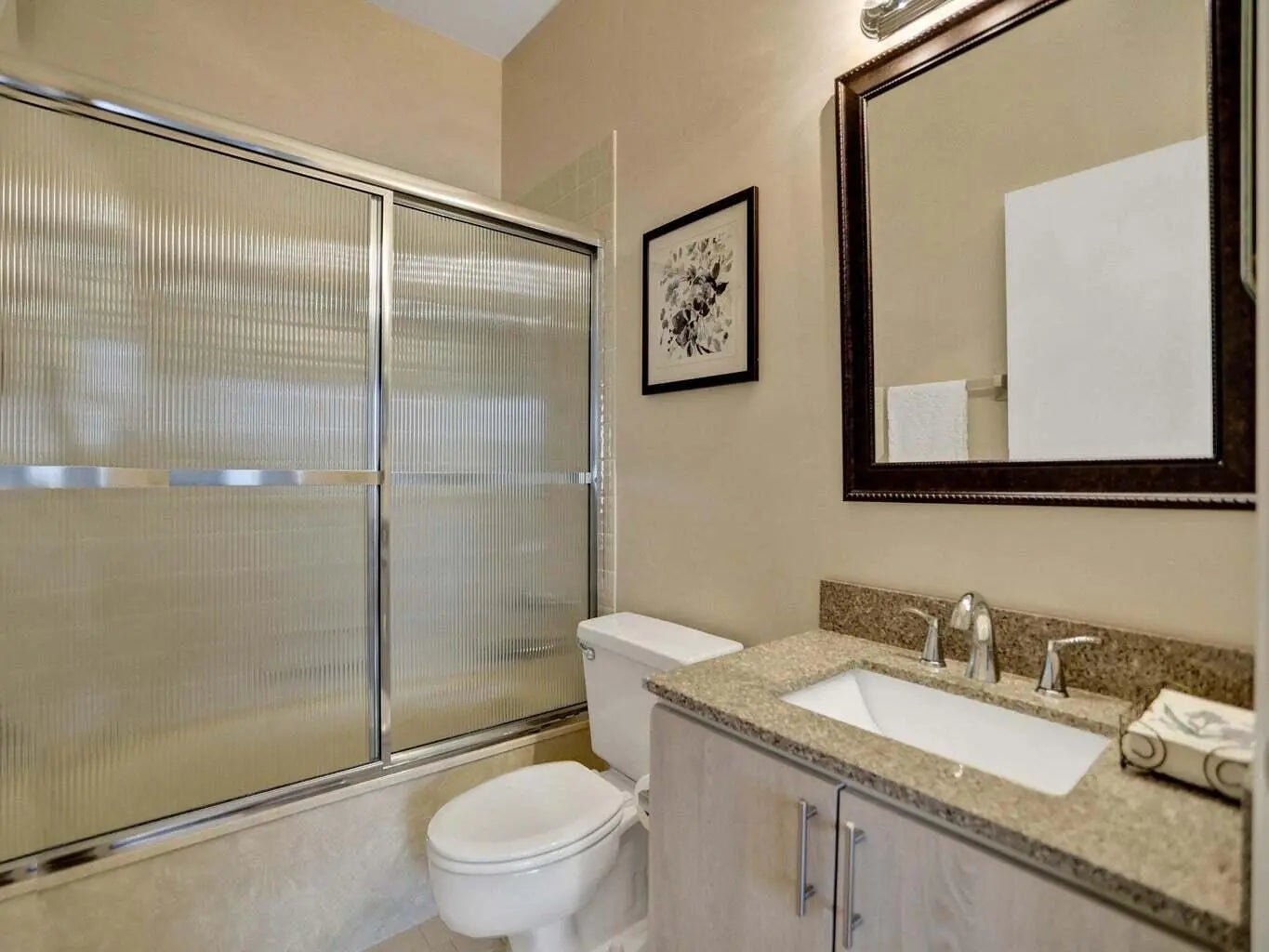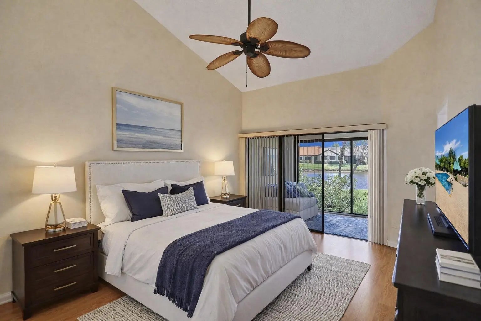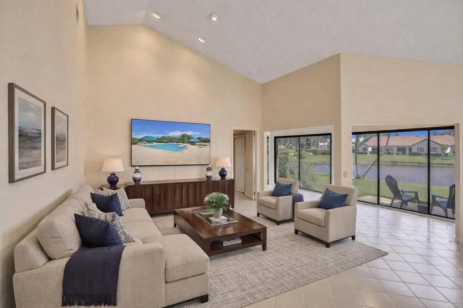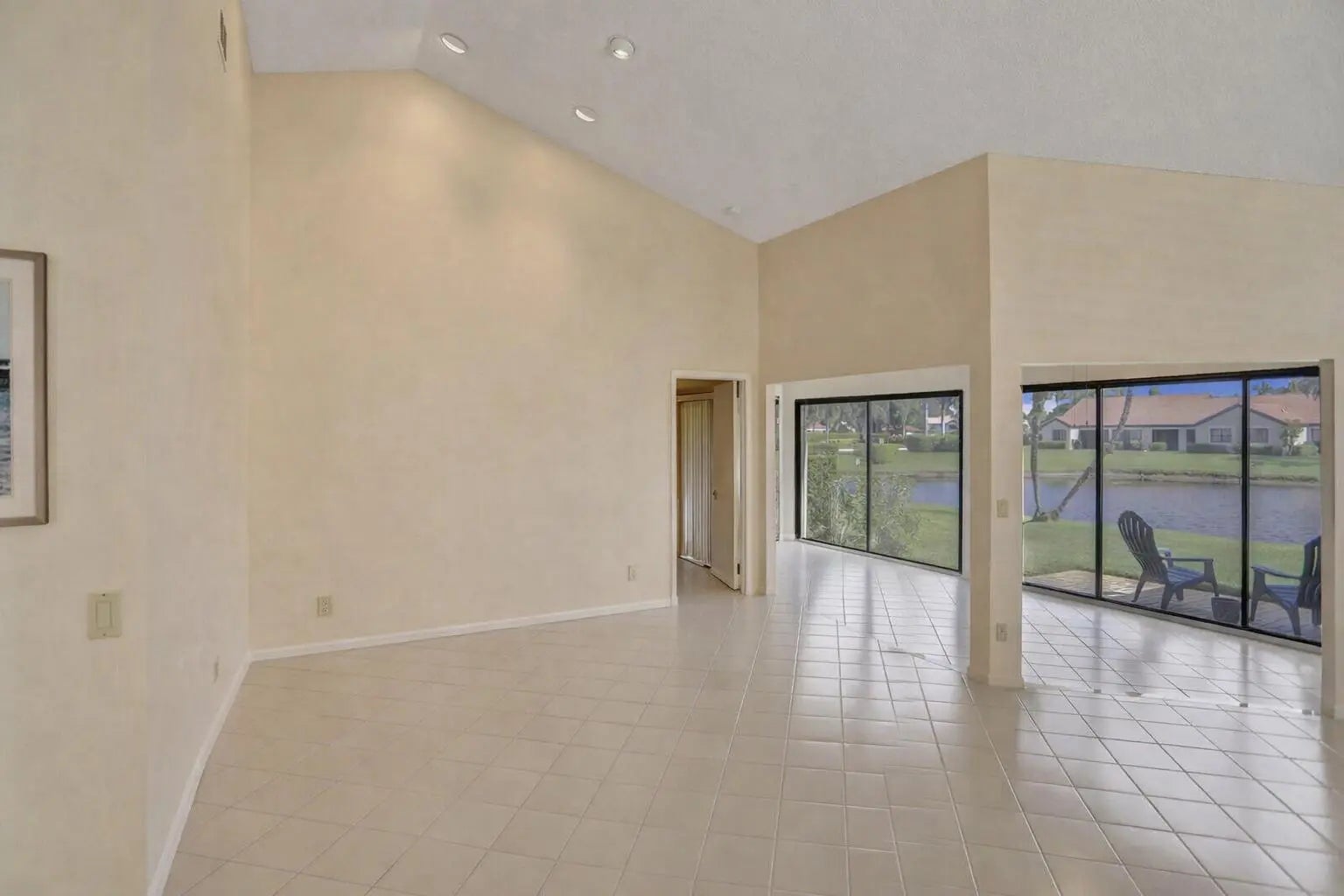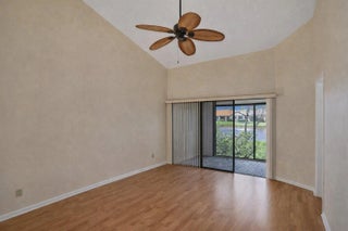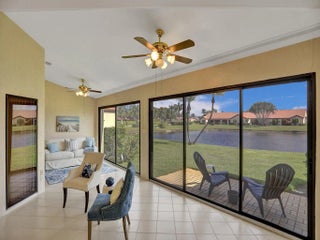 This lovely, upgraded villa is perched on the shores of the glistening lake, offering serene and peaceful views. As you enter, you will be delighted by the open layout and lake views. The home has beautiful natural lighting. The kitchen features granite countertops, sleek stainless steel appliances, and a breakfast cafe overlooking the lake. The living area is nice and spacious and adjoins the enclosed lanai, which has sliders to your outdoor patio. The primary suite offers generous proportions and windows that frame the beautiful lakeview. The primary bath is nicely upgraded, with dual sinks and a stall shower. No worries about your storage, with the large walk-in closet. The 2nd br is strategically located, offering privacy from the primary suite. The 3rd br/ den offers more closet