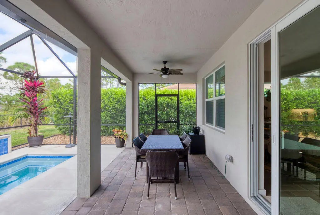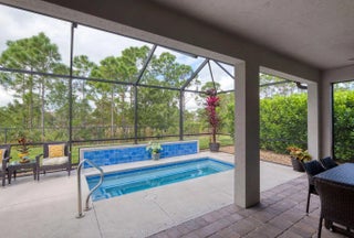 Come see this beautiful 5 year old Jensen Village home located on a cul de sac and view the 10 person spa with jet action that can be heated and cooled under a spacious lanai. The home features 4 bedroom 2 bathrooms with tile throughout as well as a 2 car garage. It is thoughtfully designed with over 2000 square feet of air conditioned living space. The home is nicely landscaped with clusia bushes on both sides and a private view of the preserve. It has numerous upgrades which includes impact windows, a screened front entrance, a water softening & filtering system, an alarm system with cameras and an enhanced air conditioning system. The community is gated and has 3 heated pools, numerous tennis courts, a community room as well as a public golf course on premises which includes full bar