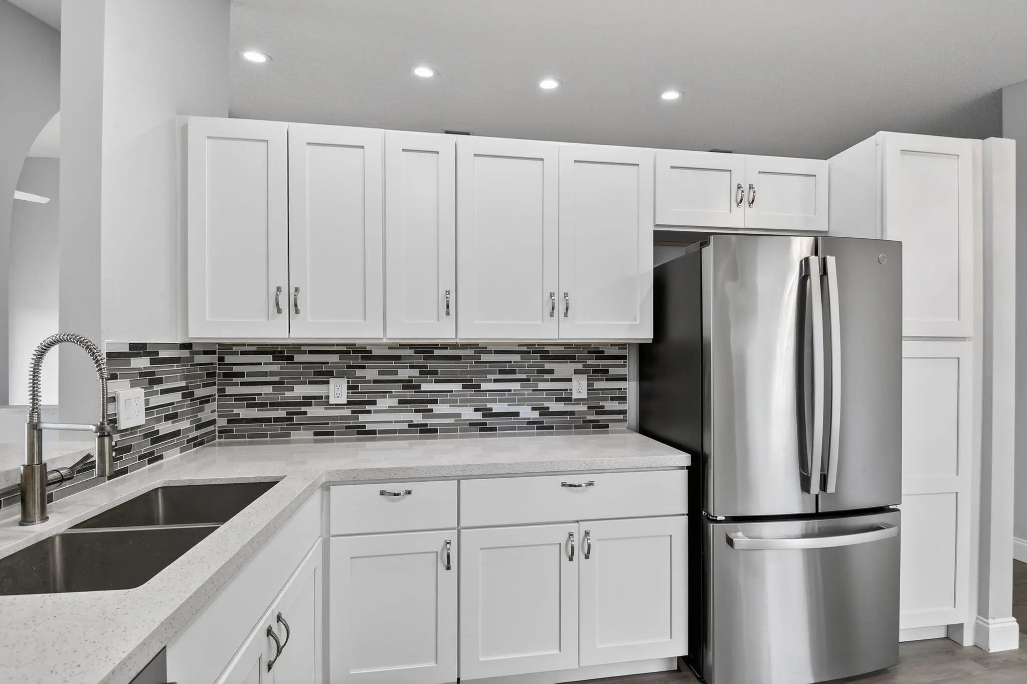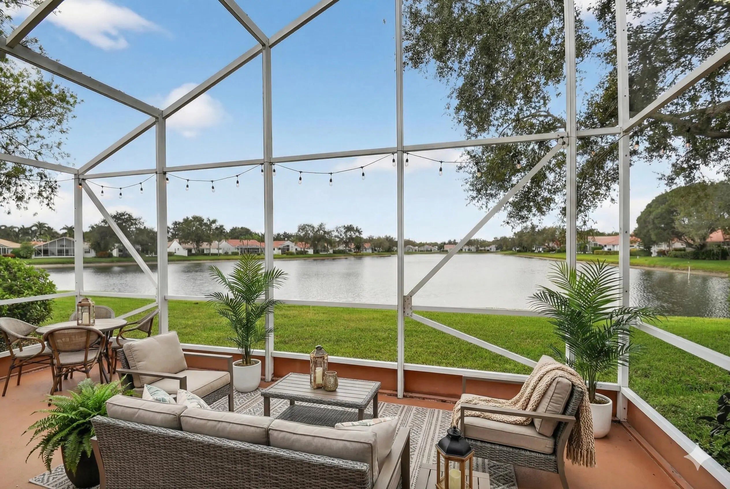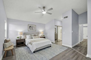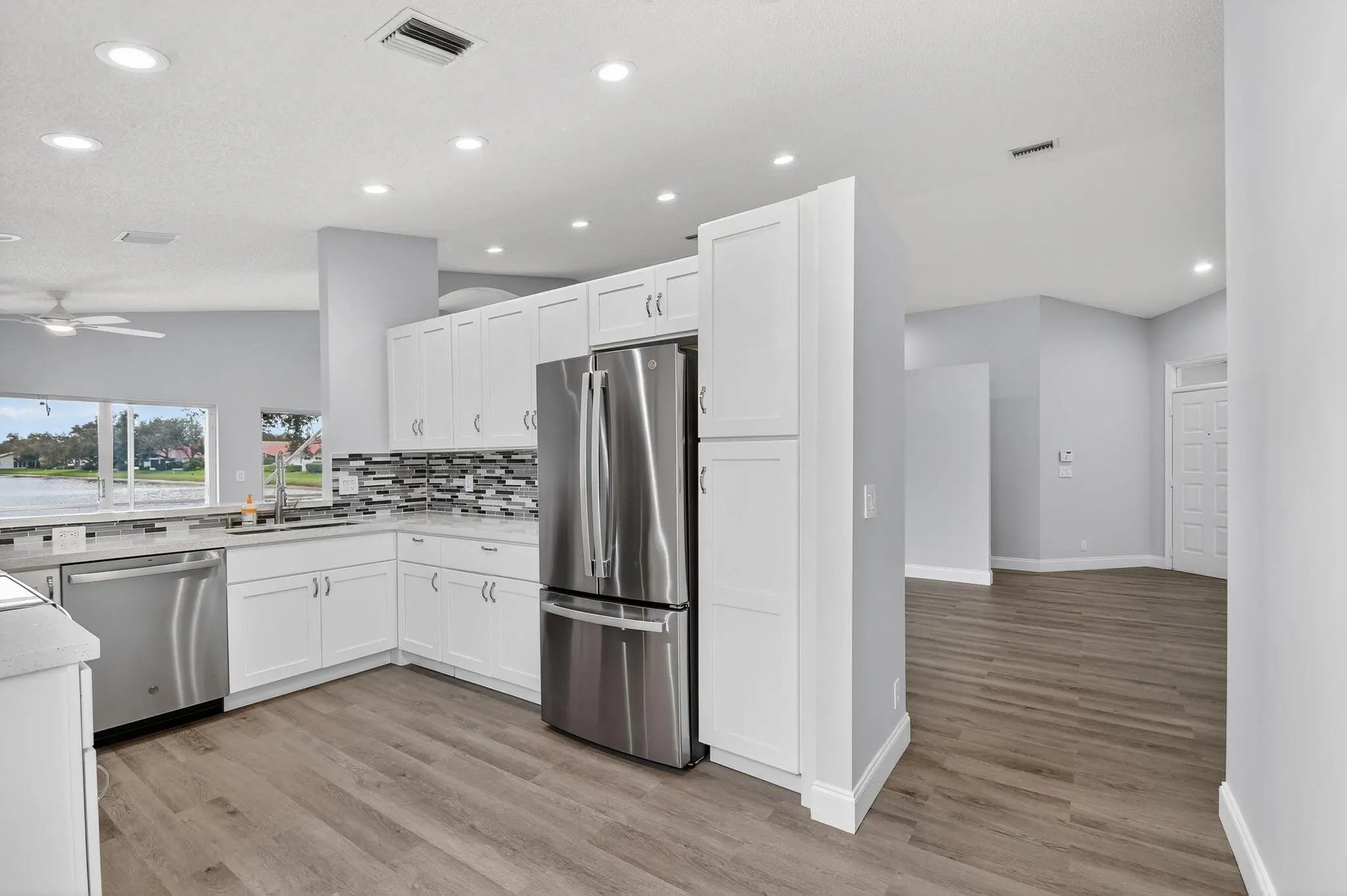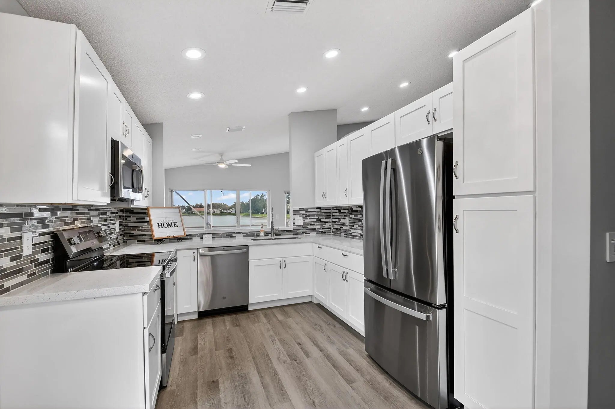 This beautifully updated 3-bedroom, 2-bath home features fresh interior paint, new waterproof vinyl flooring, a fully renovated kitchen with stainless steel appliances, recessed lighting, and soaring vaulted ceilings that enhance the bright, open layout. Both bathrooms have been upgraded with new vanities, toilets, and frameless shower doors. Enjoy serene lake views the moment you enter, and unwind on your private enclosed patio while taking in stunning sunset views over the water. Additional highlights include a 2-car garage with new rubber mat flooring, gutters, accordion shutters throughout, a 2009 roof, and 2017 A/C.