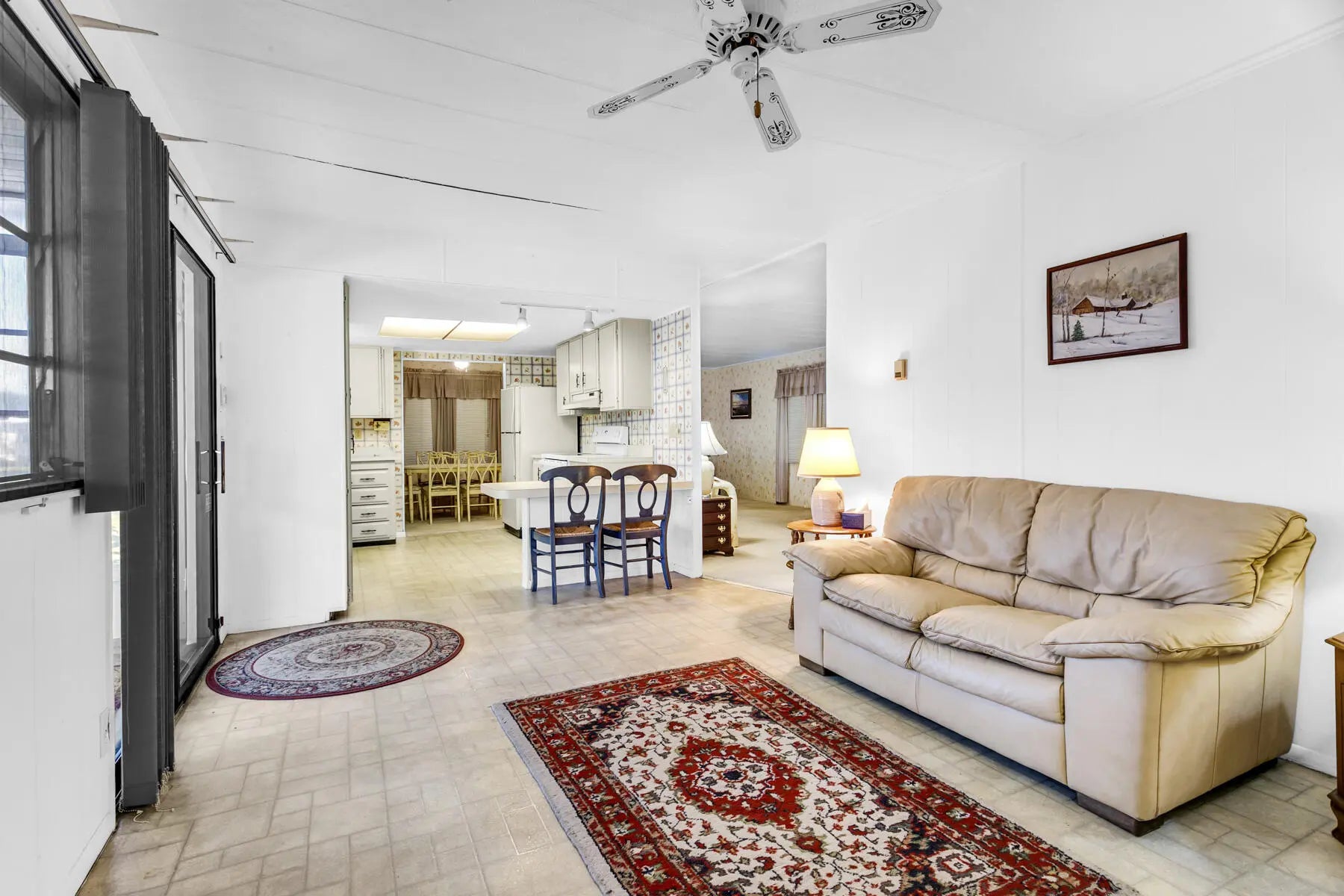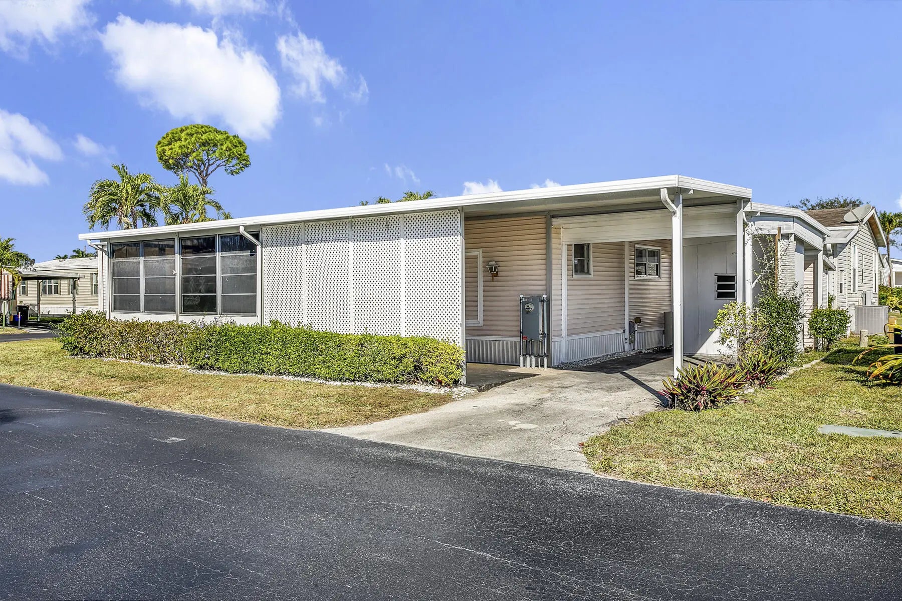 This property is an investor's dream, offering generous space and great potential. It features a living room and family room, an open kitchen with a dining area and built‑in buffet, plus two large bedrooms. The main suite includes a walk‑in closet and a roomy bath with a step‑in shower, while the guest room offers ample storage and guest bathroom has a tub/shower combo. Enjoy both a screened patio and a covered outdoor area. With two storage sheds, indoor laundry, and the possibility to convert to a three bedroom, this home has endless possibilities. This is a gated community with a low monthly fee. NO Land Lease. Active clubhouse with heated pools, pickle ball, shuffleboard, bingo, cards, dances and so much more. Close to plenty of shopping and dining and local beac