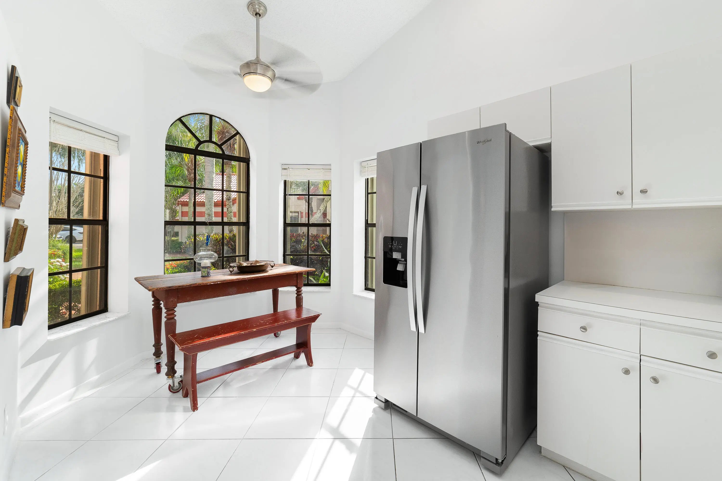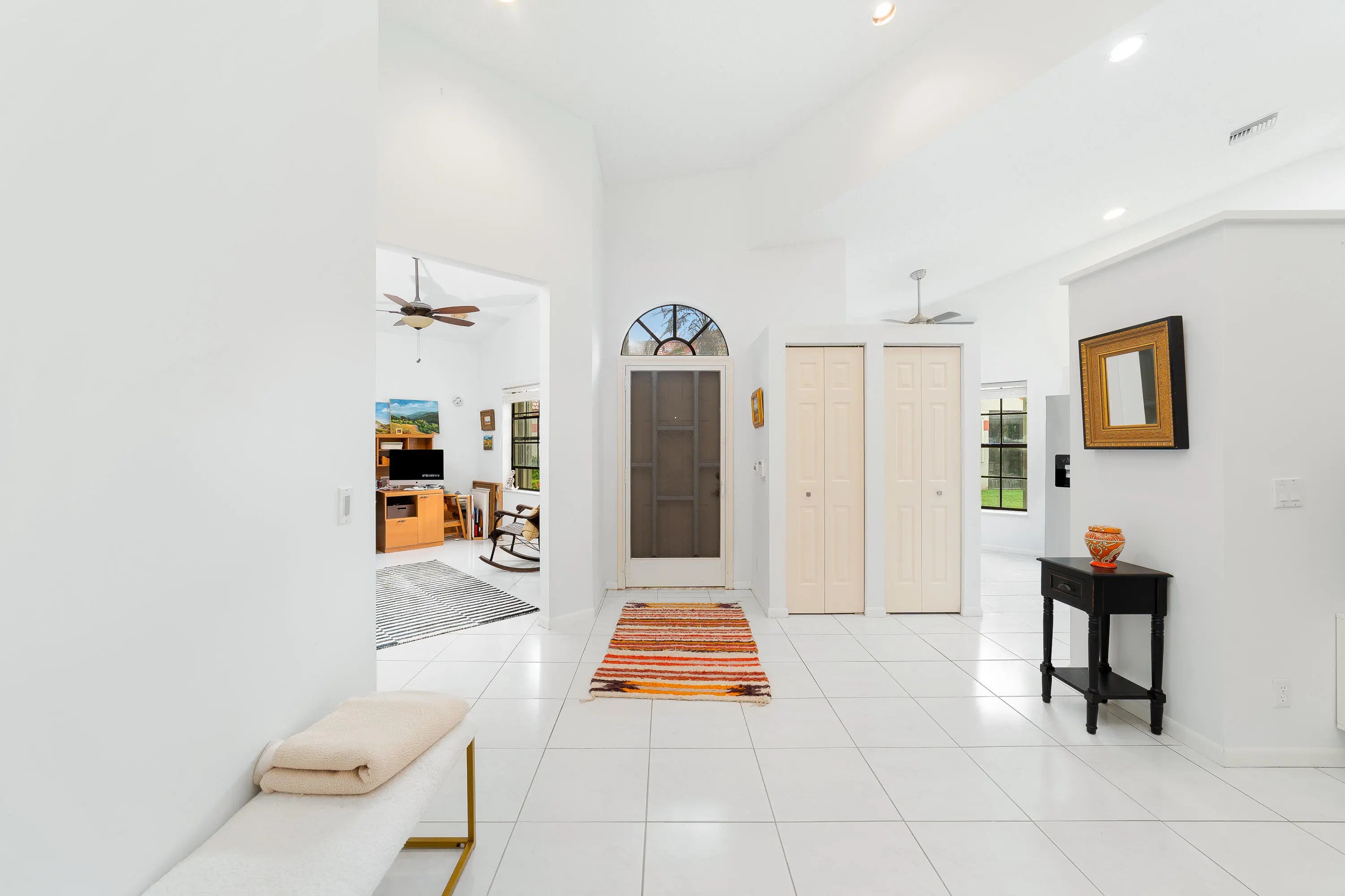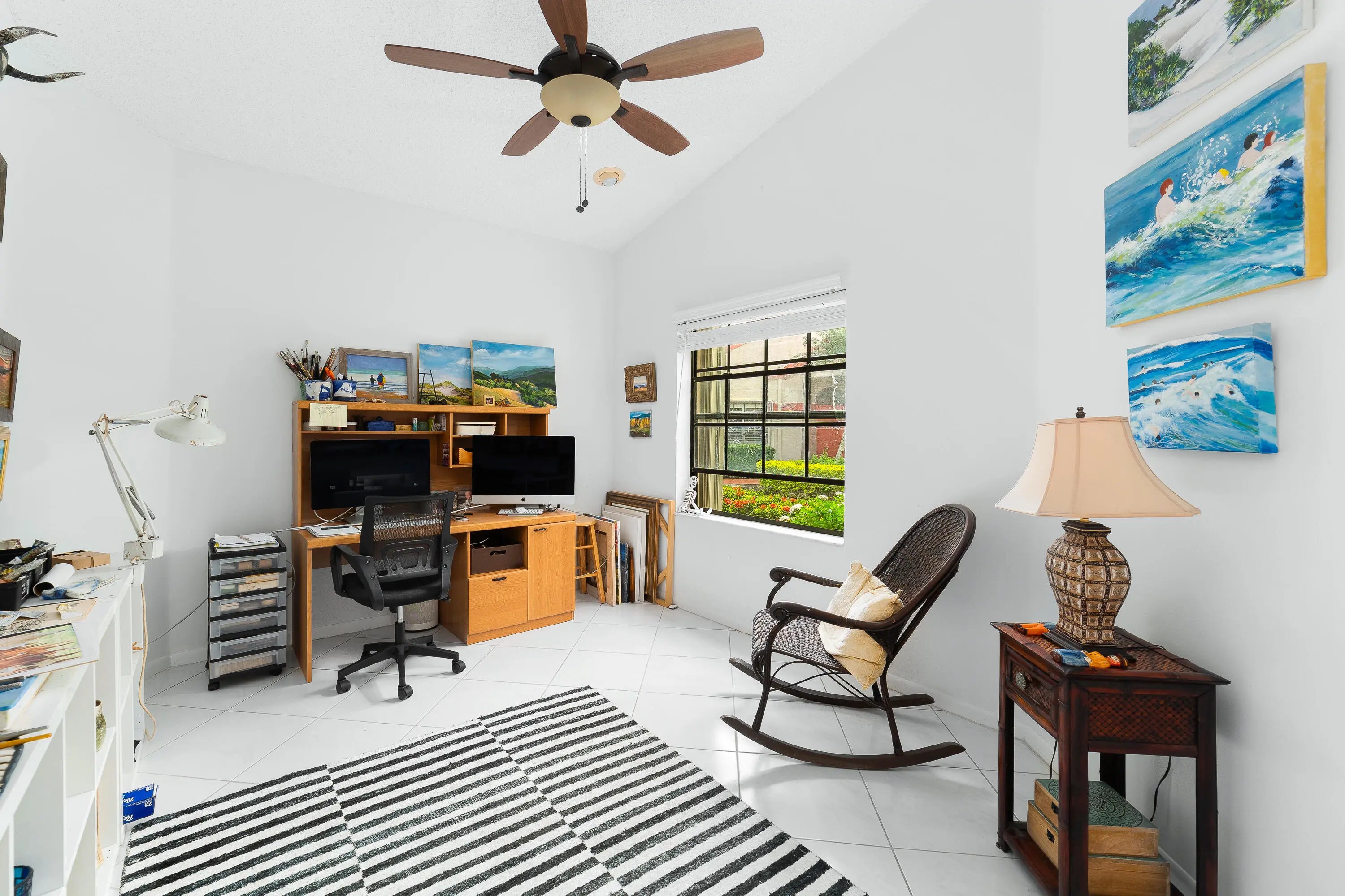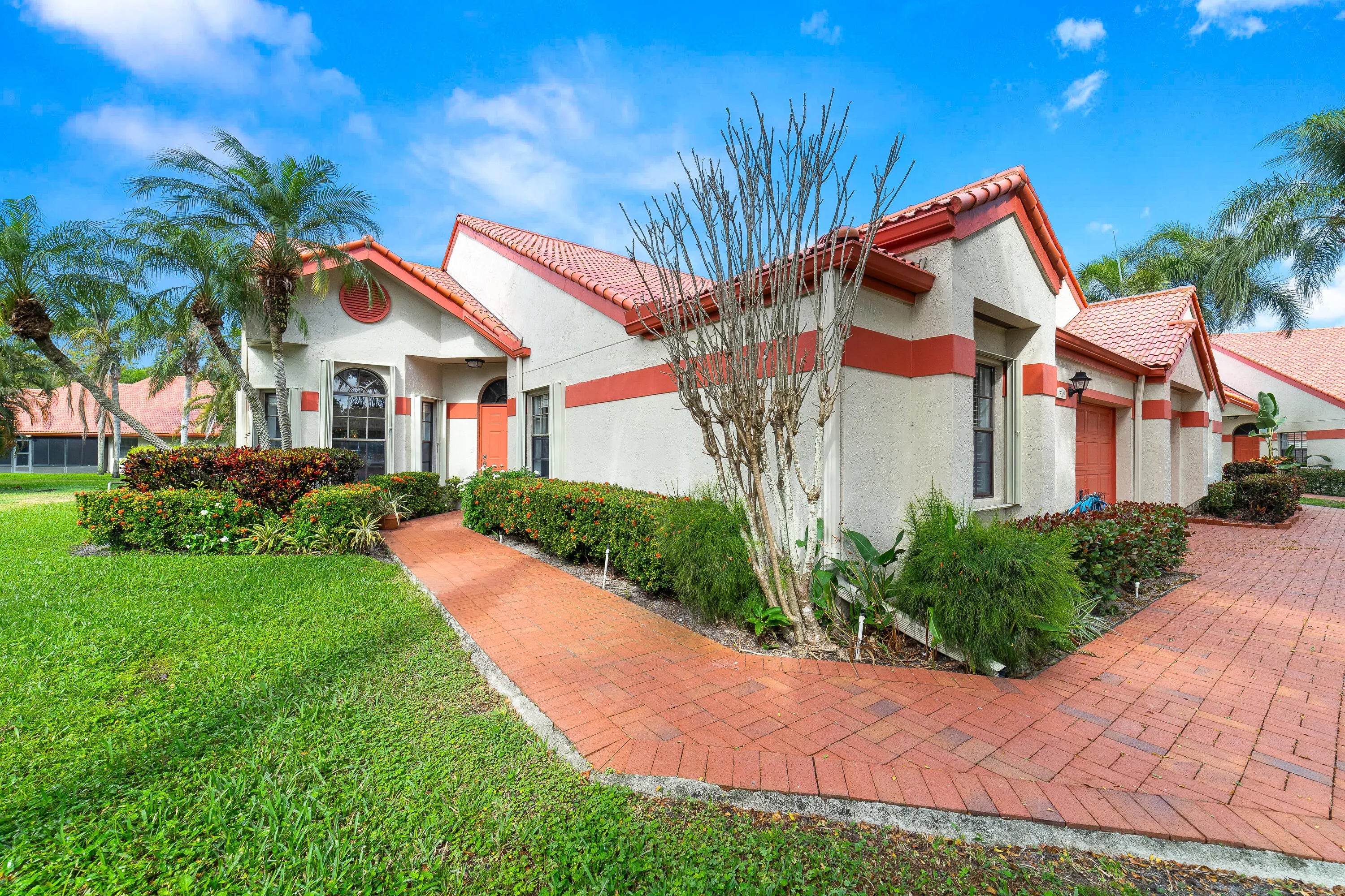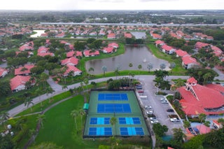 Welcome home to this inviting townhouse in the desirable Lexington Club community of Delray Beach. This well-appointed model offers 2 bedrooms, 2 full bathrooms, a den/office, and 1,657 square feet of comfortable living space. The light-filled eat-in kitchen features a convenient pass-through to the dining area, perfect for everyday living and entertaining. Vaulted ceilings enhance the open, airy layout throughout the main living areas. The spacious primary suite includes a walk-in closet and dual sliding doors that open directly to the patio. The updated primary bathroom is designed for relaxation, featuring dual vanities, a separate shower, and a Roman tub. Head outside to the expansive 28 x 8 screened patio with roll-down enclosures, ideal for enjoying Florida living year-round.