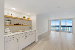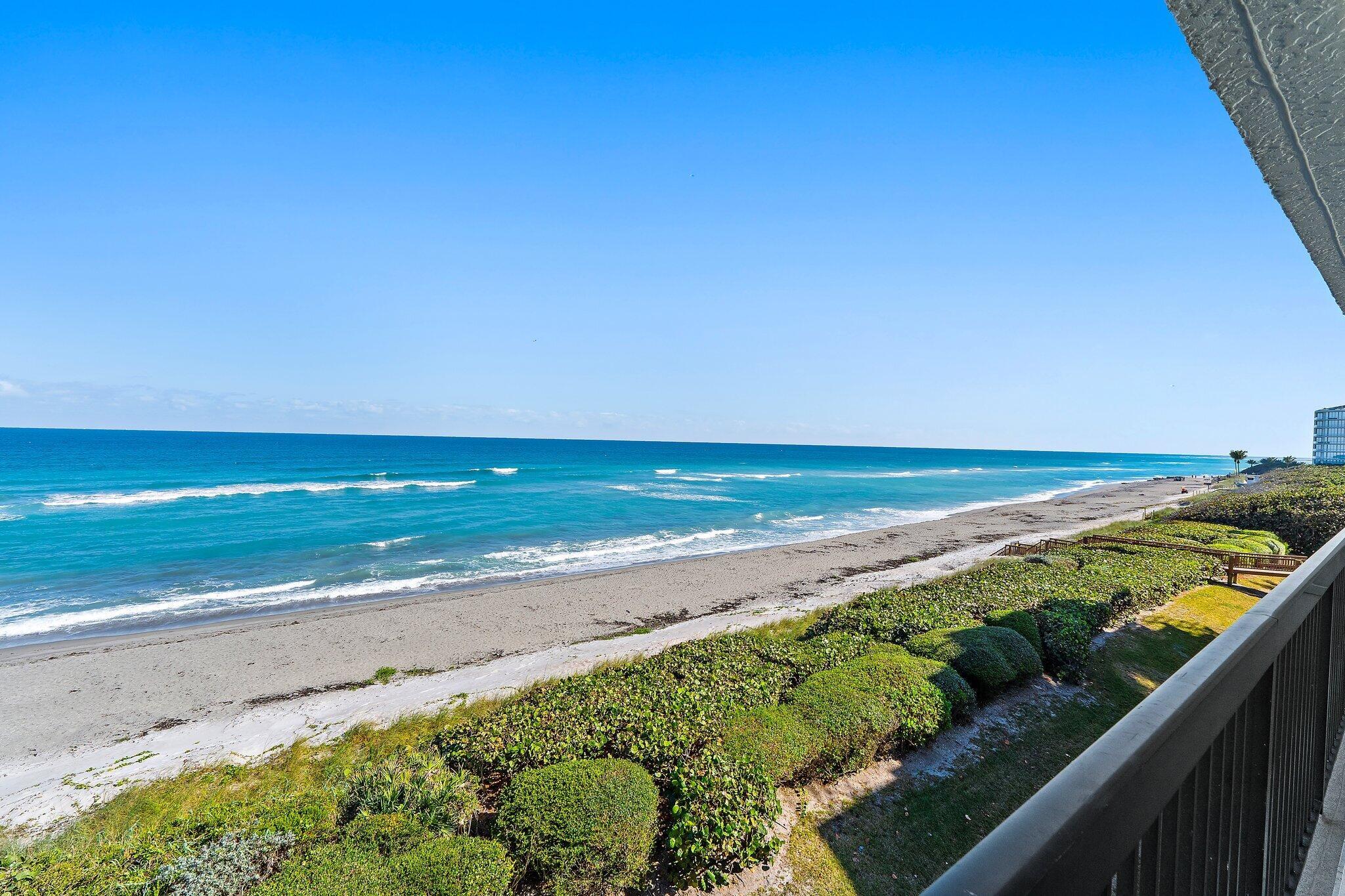 Endless ocean views define this fully remodeled 5th-floor oceanfront residence at Seawatch on Jupiter Island. The open living area features luxury vinyl flooring, brand new full impact sliding glass doors, and a beautifully updated kitchen with quartz counters, stainless steel appliances, and a built-in bar perfect for entertaining. Enjoy sunrise views and ocean breezes from the spacious covered balcony. Both bedroom suites offer private baths and walk-in closets, complemented by a powder bath for guests and an in-unit laundry room. 2 assigned parking spaces and a storage locker. Seawatch offers 24/7 onsite management and security, resort-style amenities incl. a pool, tennis court, fitness room, private beach access and intracoastal common dock. 13% condo dues reduction approved for 2026