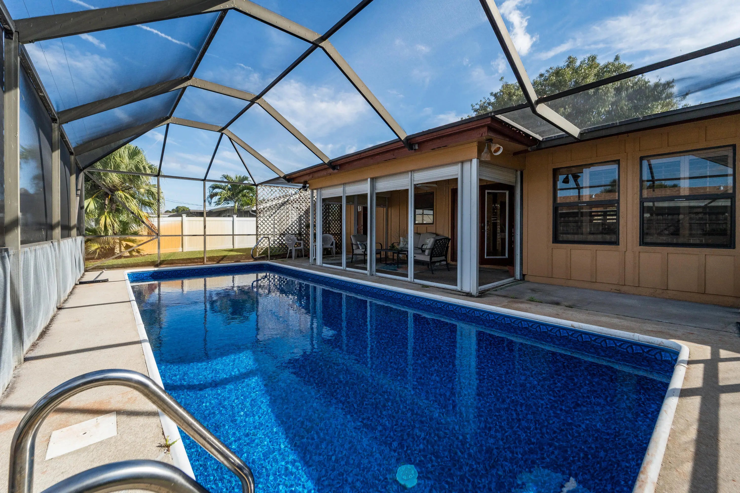 3 bedroom/2 bath single-family home located on a quiet street in Boynton Beach. Larger lot size - .17 acres. Impact windows throughout offers complete storm protection. No HOA - no restrictions! Bring your RV, boat, pets, etc. Large backyard features a fully screened in pool with brand new vinyl, and a new pool filtration system. Roll down shades on patio. Plenty of room to entertain, relax or soak up the Florida sun. Master bath leads out to pool area. Other updates include newer AC, water heater, washer and dryer. Conveniently located near shopping, dining, beaches.