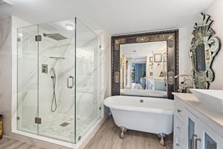 Stunning oceanfront 2BR/2BA condo with sweeping Atlantic views and direct private beach access in the gated Ocean Trail community. Beautifully renovated with an open floor plan, engineered vinyl wood-tile flooring, upgraded fixtures, custom finishes, smart-home AC, wine fridge, wet bar, and a stone accent wall with electric fireplace. Renovated kitchen and spa-inspired baths throughout.The primary suite features custom barn doors, a clawfoot soaking tub, separate spa shower, double sinks, walk-in closet, and a luxurious retreat feel. The second bedroom and bath can be closed off with elegant barn doors, creating a private second primary suite. In-unit washer/dryer and a spacious screened balcony overlooking the ocean and Jupiter Beach Resort & Spa. 4 star Jupiter Beach Resort & Spa/restaurant FOB access included. Resort-style amenities include 22 gated oceanfront acres with 24-hour manned security, covered parking, storage, tennis, pickleball, bocce, heated pools, hot tubs, sauna, fitness center, grills, walking paths, lap pools, and private beach access. Walk to par 3 golf, dining, shopping, parks, Riverwalk, Cinepolis, Fresh Market, upcoming Whole Foods, and Maltz Theatre. Complimentary golf cart shuttle available.