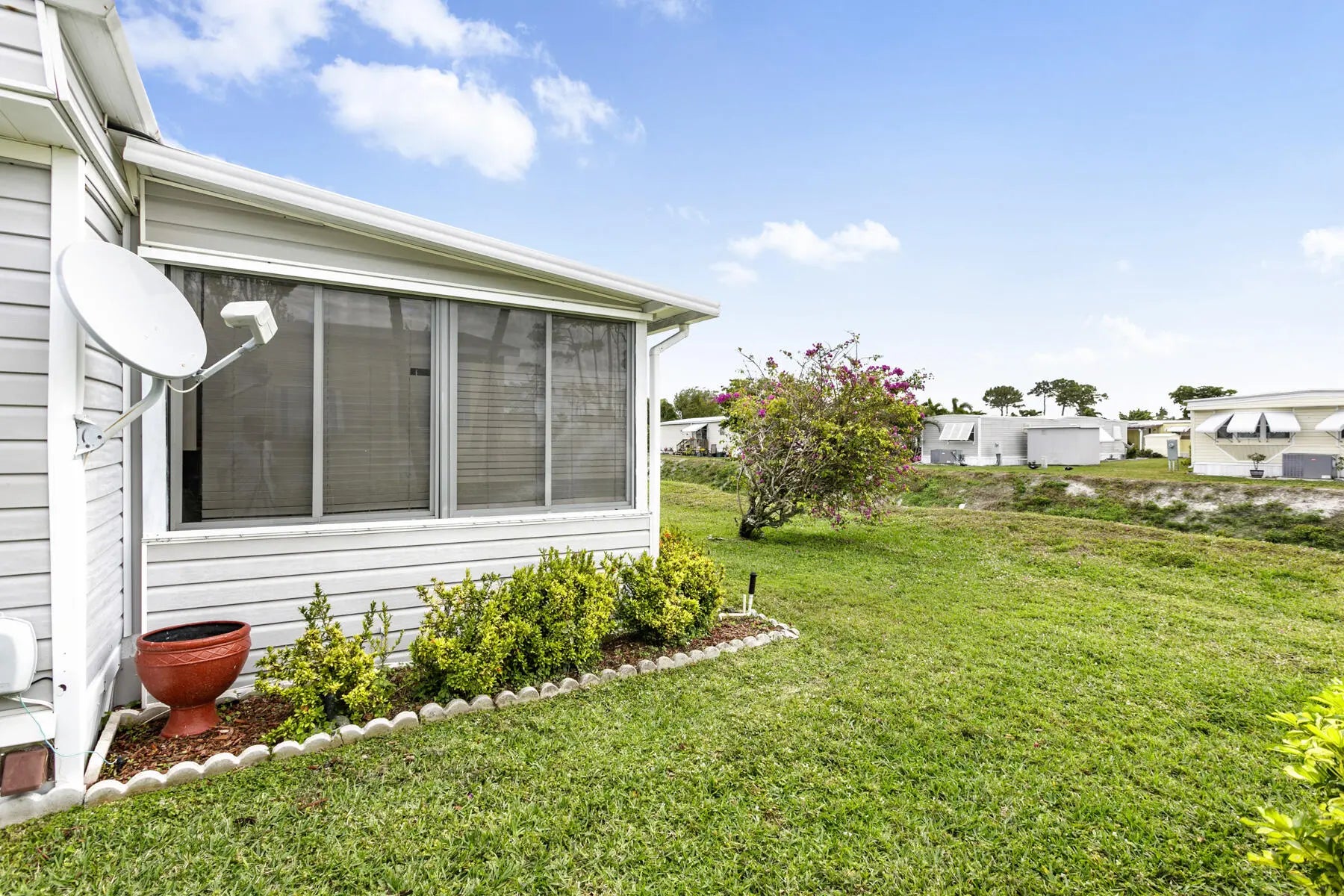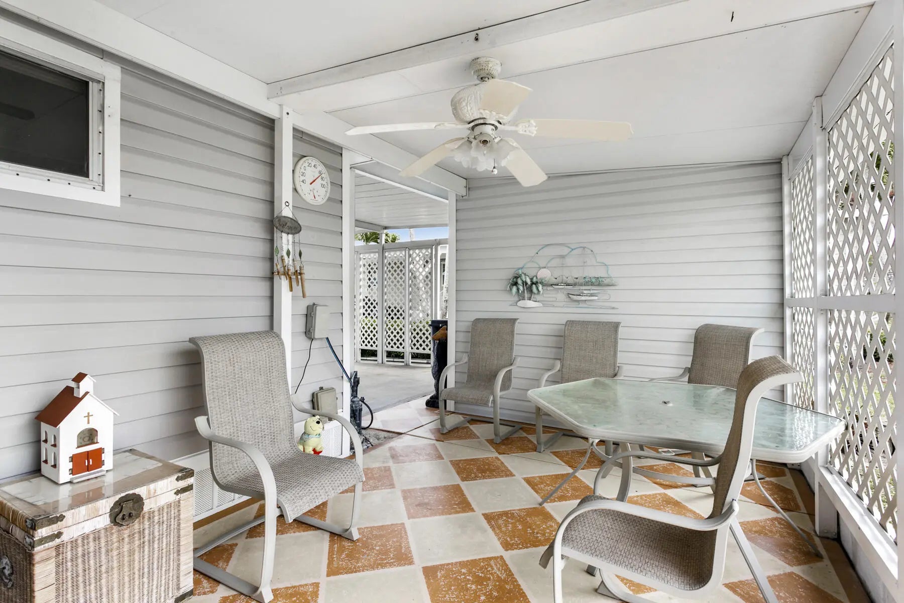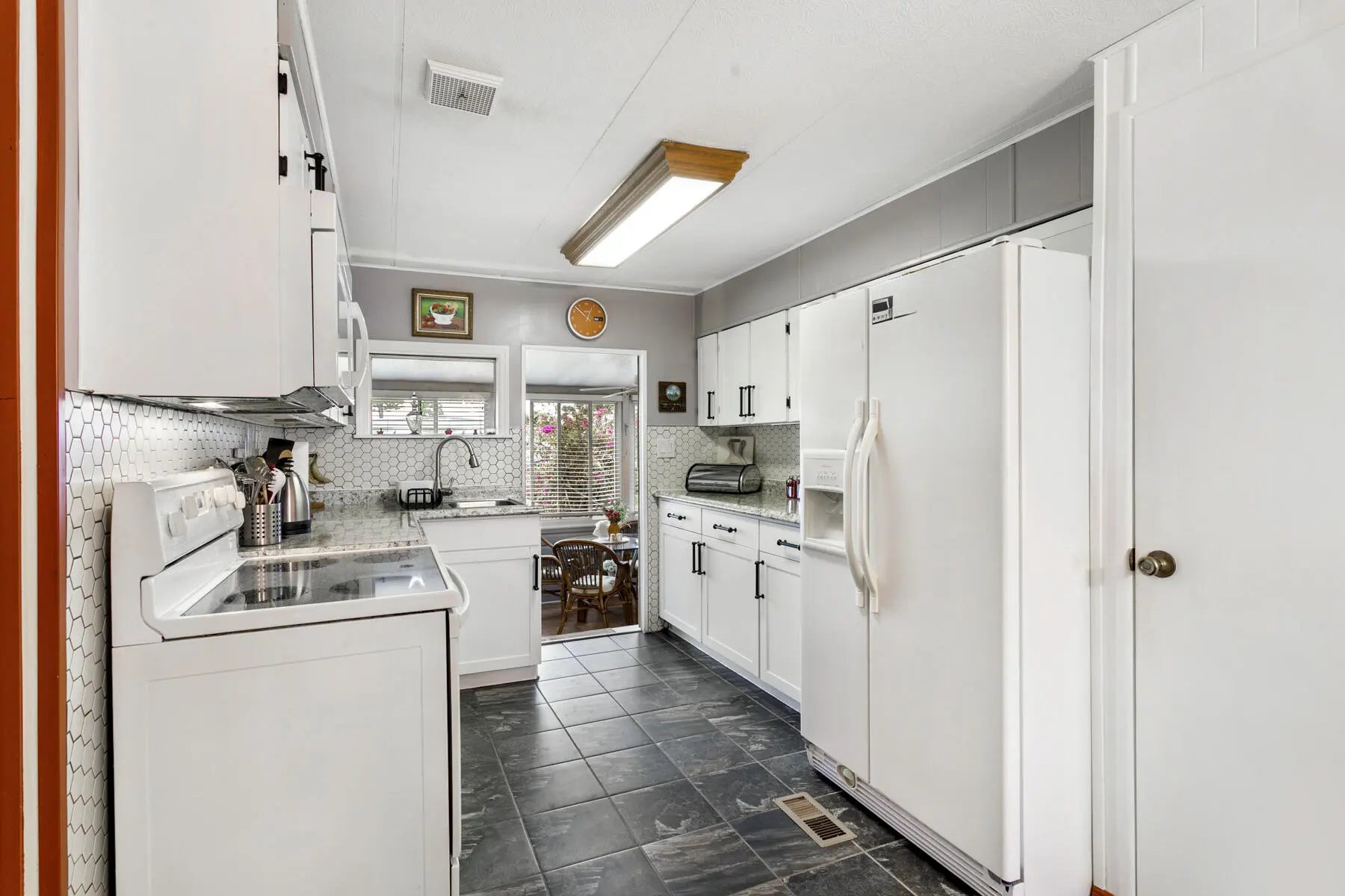 Tucked away at the end of a quiet cul-de-sac, this charming two-bedroom, two-bath home offers a warm sense of privacy, with a peaceful backyard overlooking a scenic canal where wildlife often wanders. Inside, the home is tastefully furnished and well maintained, featuring laminate flooring throughout and a bright, spacious living room accented by sunny bay windows. The updated kitchen feels fresh and inviting with white shaker-style cabinets and new countertops, while both bedrooms provide generous closet space, including the main bedroom with a walk-in closet. Updated bathrooms with step-in showers add a modern touch. The cozy Florida Room, with wall-to-wall windows, invites you to relax and enjoy tranquil green views, while the covered patio offers the perfect spot for fresh air and