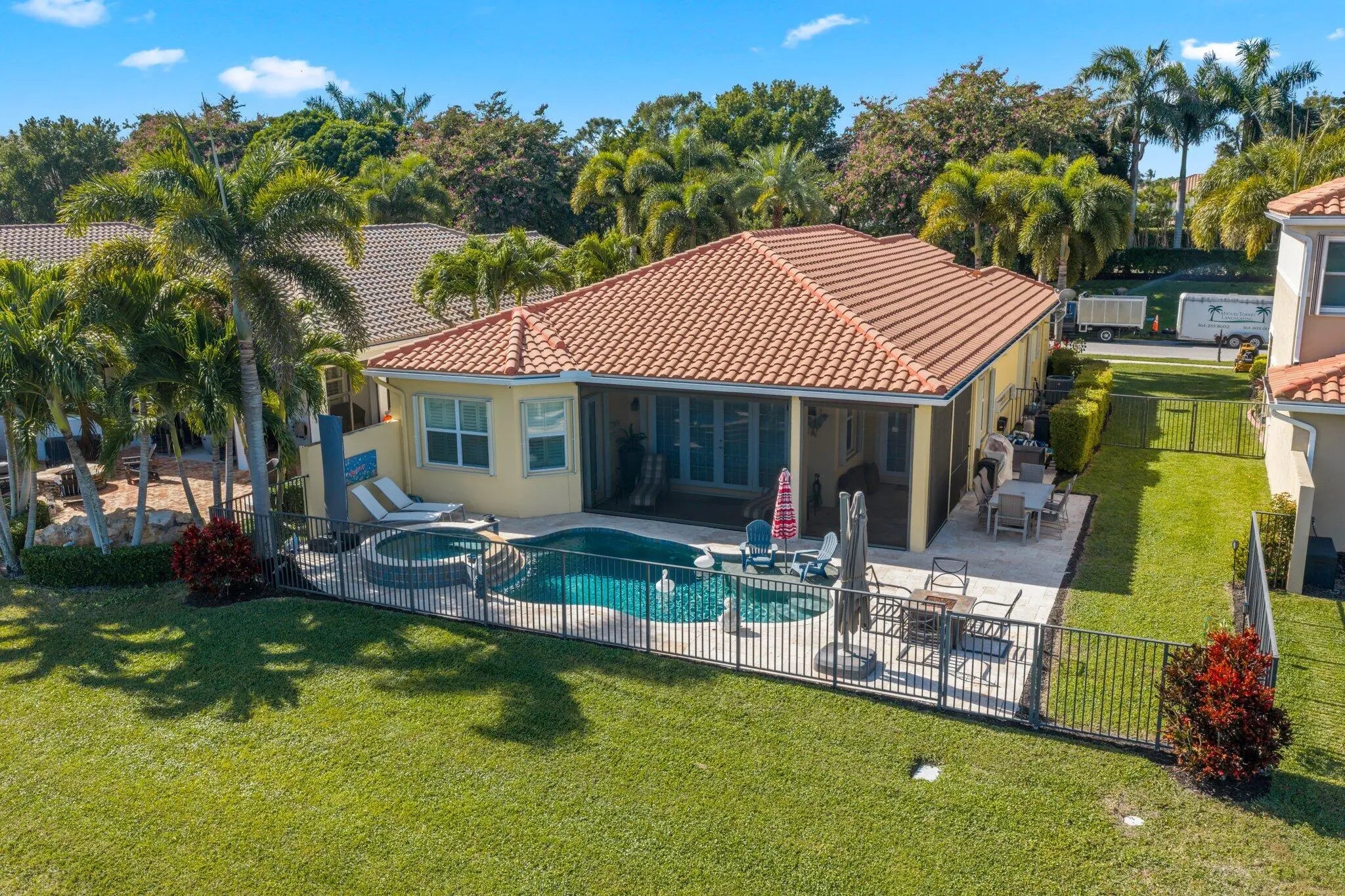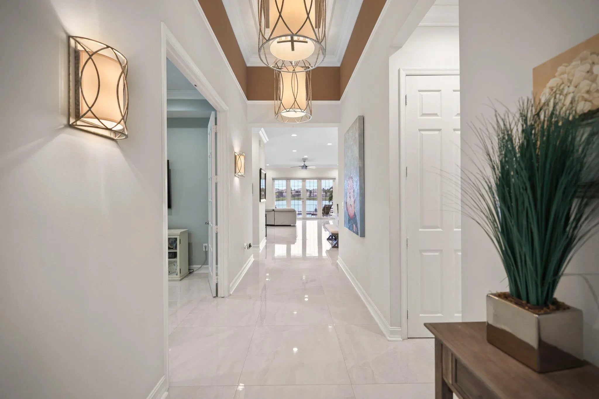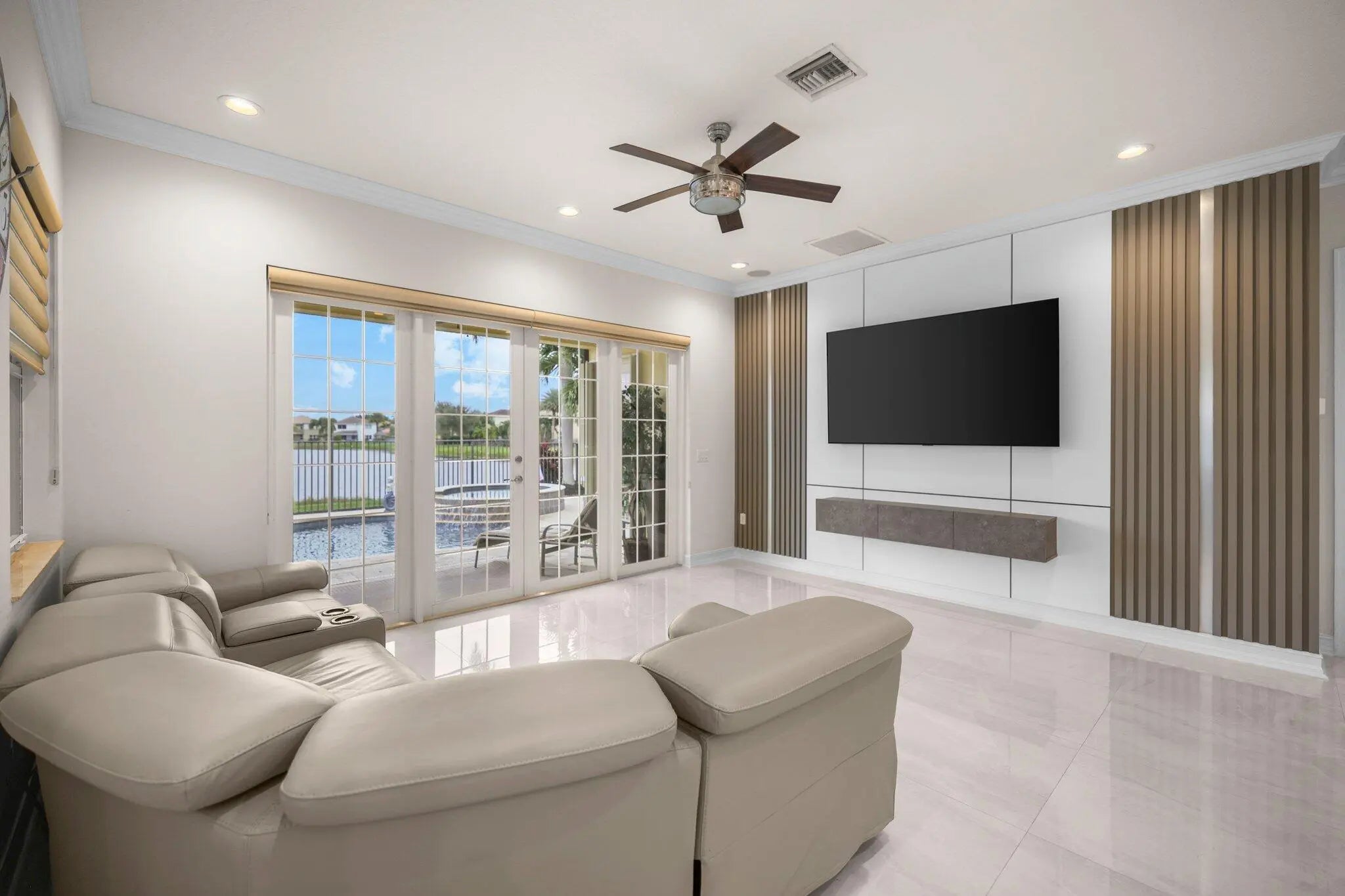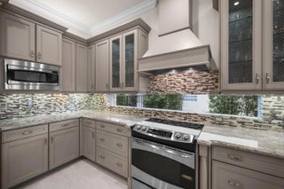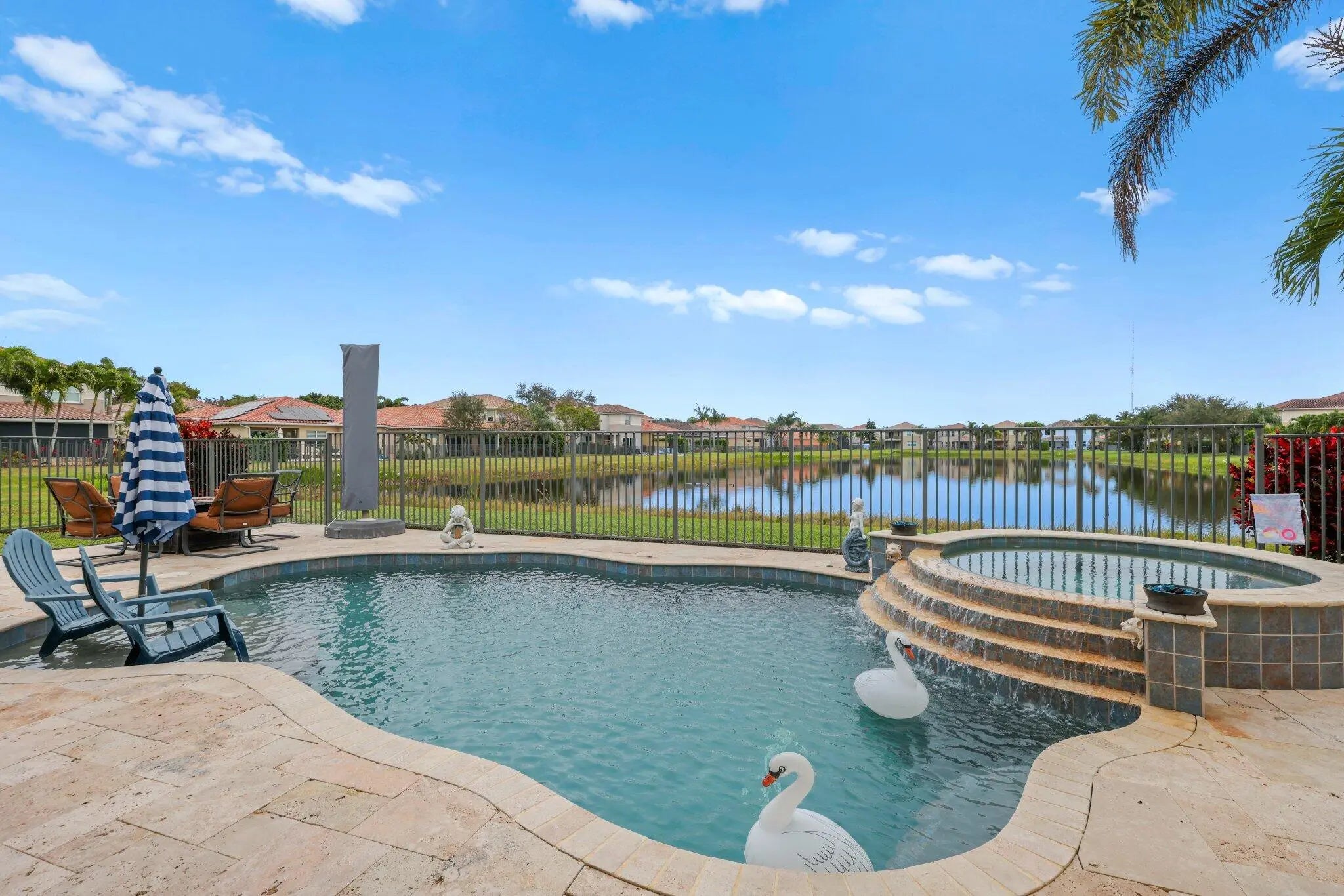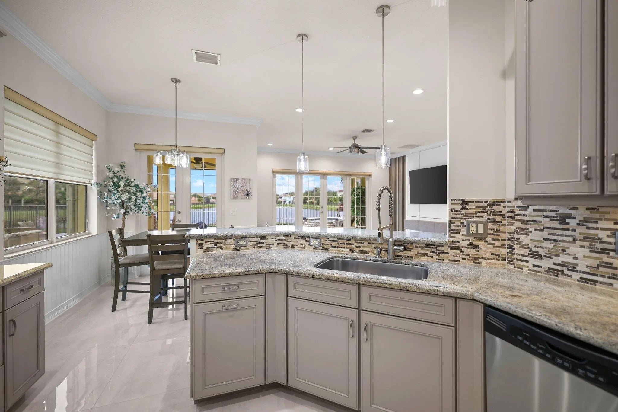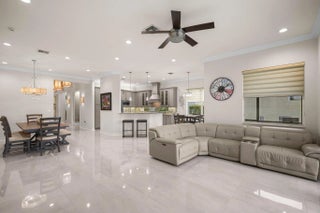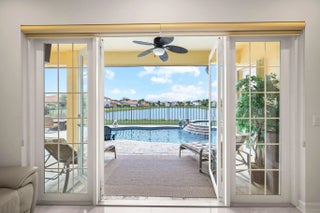 Experience refined lakefront living in this exquisite Bimini model located in the prestigious Canyon Trails community. Thoughtfully renovated and impeccably maintained by the original owners, this elegant single-story residence offers 3 bedrooms, 3 bathrooms, and a private den. Set on a premier expansive lakefront lot, the home showcases serene sunrise views complemented by a heated pool and spa, creating a true private retreat. Notable features include accordion hurricane shutters, Phantom retractable outdoor screens, new porcelain tile flooring throughout, and a beautifully redesigned open-concept kitchen ideal for both everyday living and entertaining.