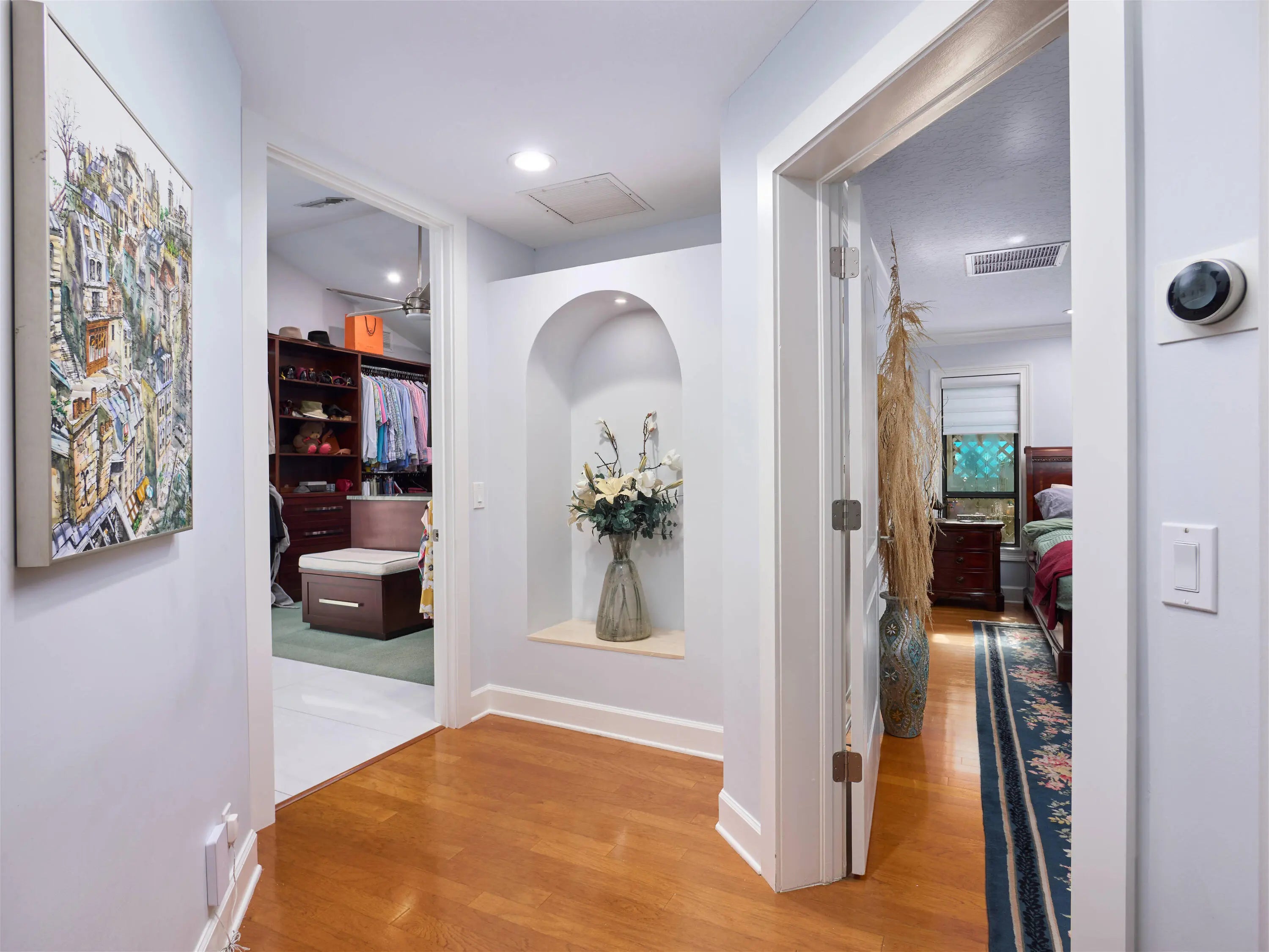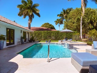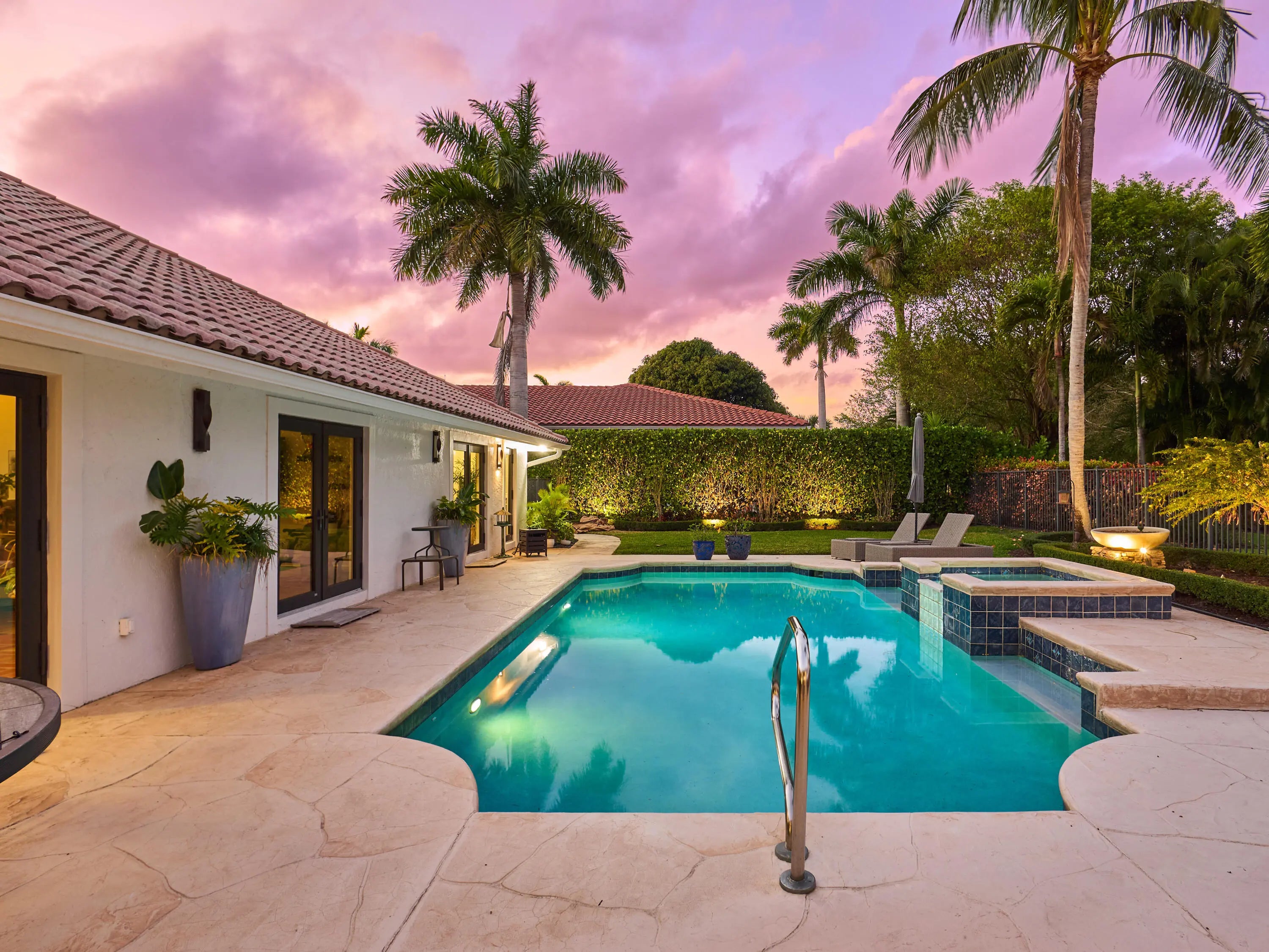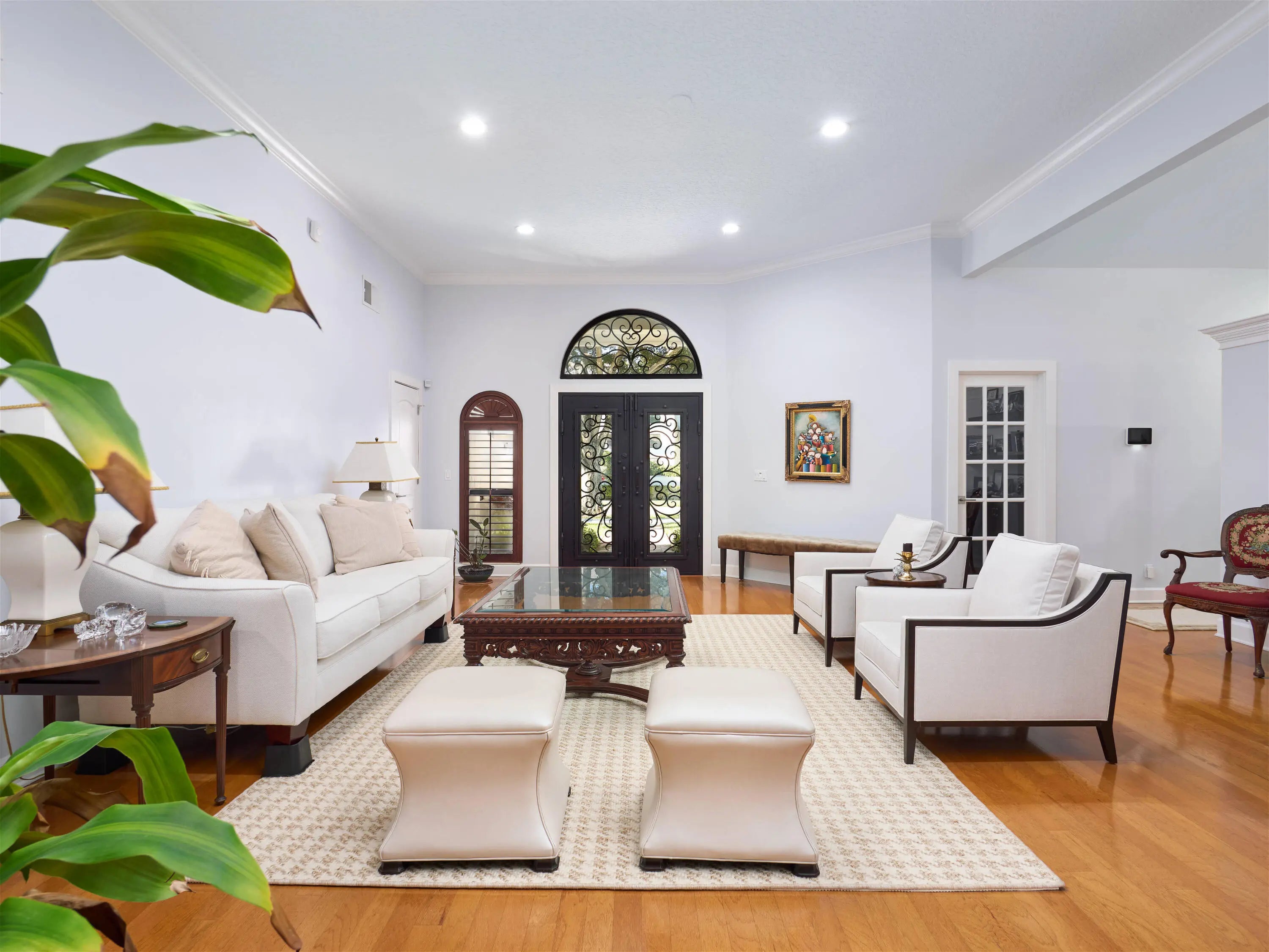 Welcome to this exquisite five-bedroom, four-bathroom residence in Presidential Estates, the only gated single-family community east of I-95. This highly sought-after waterfront enclave offers privacy, security, and exceptional convenience. The home features a bright, open-concept layout and includes two primary suites, one of which is a fully built new primary wing completed just two years ago, featuring a dedicated dressing room and custom shoe closet. The chef-inspired, recently redesigned kitchen showcases custom cabinetry, quartzite countertops, a new gas cook surface, and premium stainless-steel appliances. It is complemented by an adjacent, updated laundry room with quartzite countertops and a newer washer and dryer. A premium whole-home water purification system is paired with an