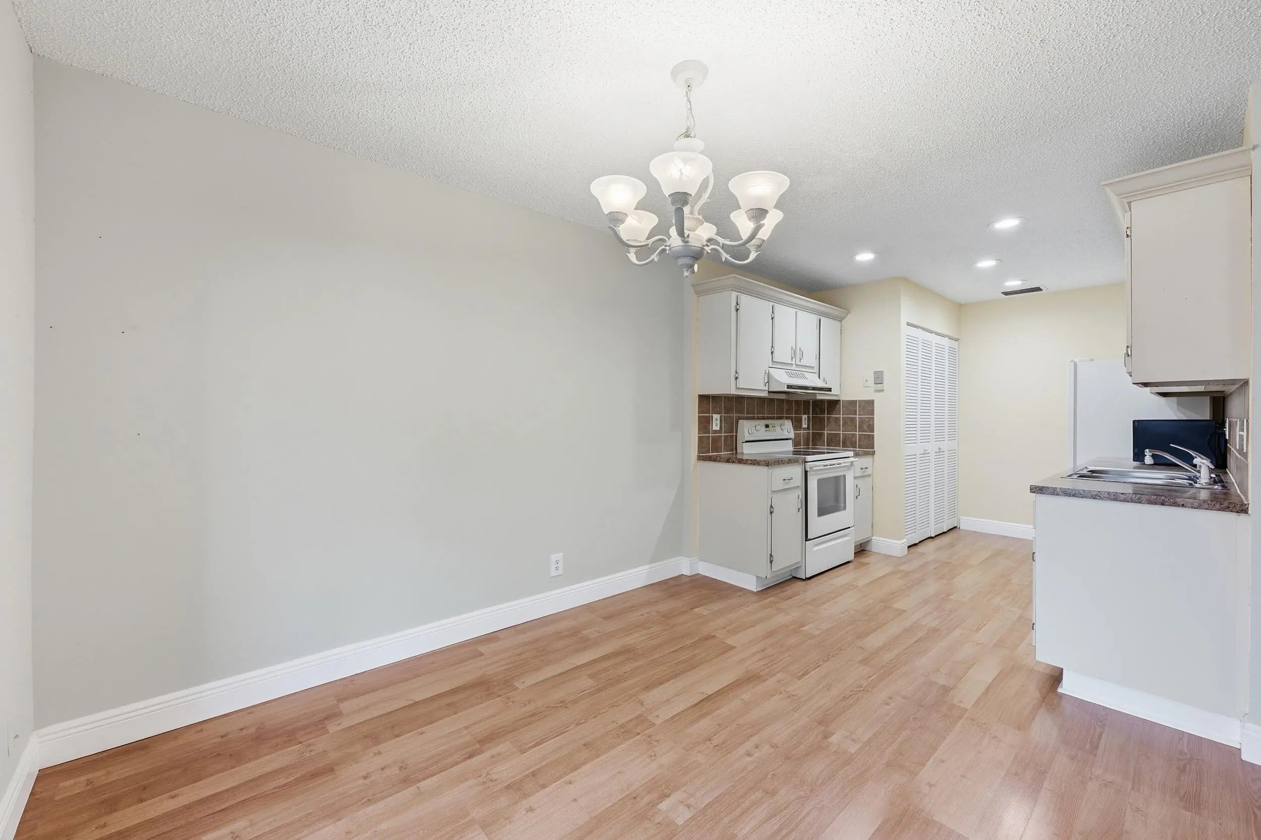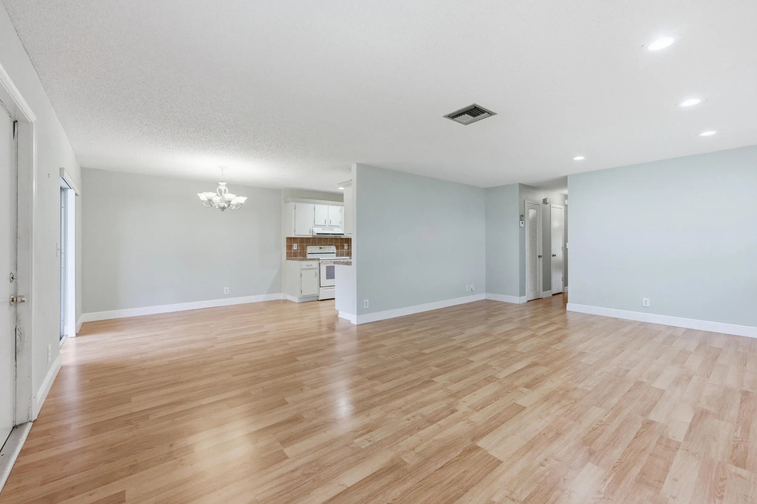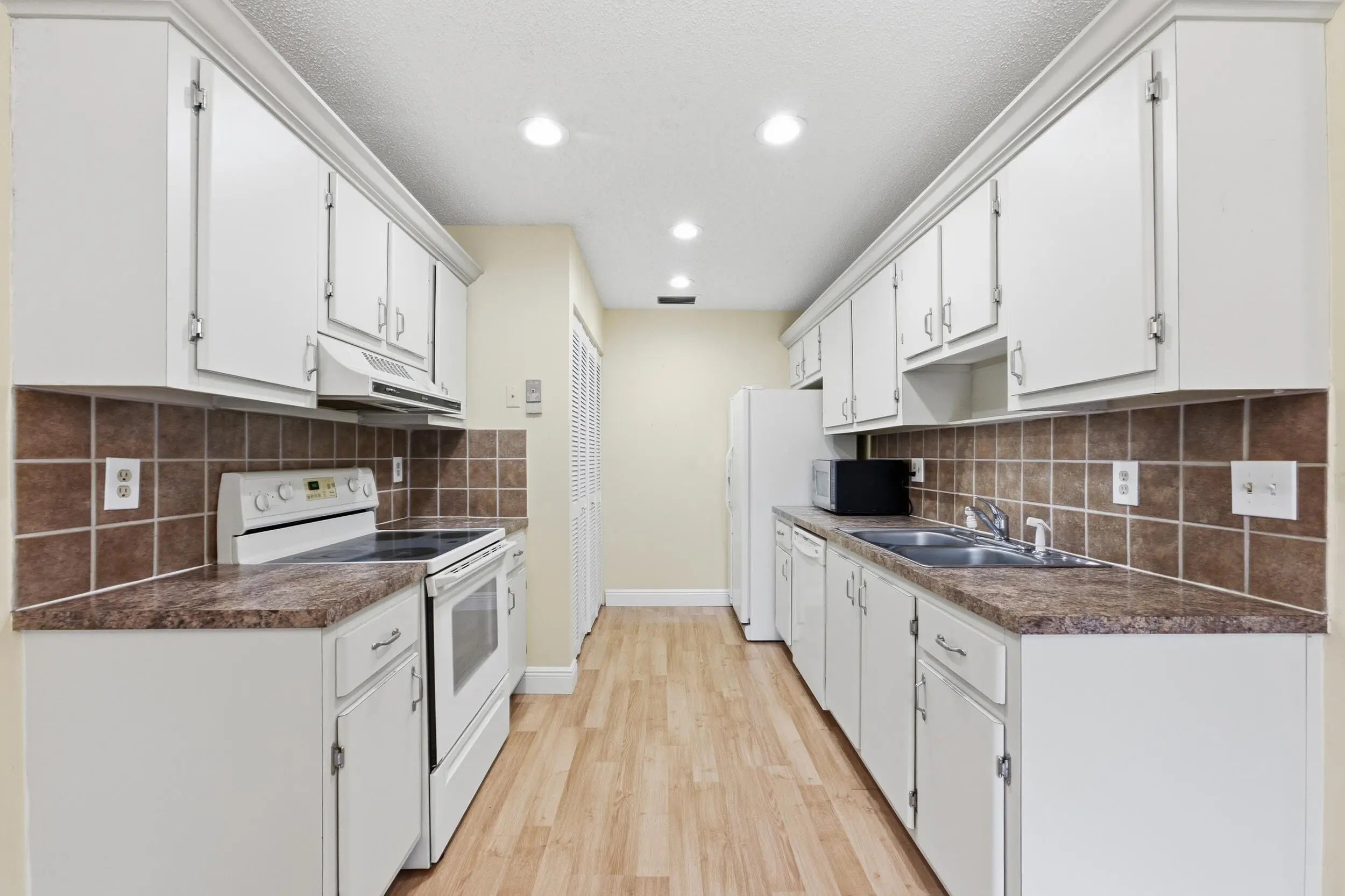 Welcome home to this charming two bedroom, two full bathroom waterfront villa featuring a screened-in patio with tranquil lake views. As you enter, you'll immediately notice the wood-look laminate flooring throughout the main living areas, complemented by updated recessed lighting and modern fixtures that create a bright and inviting atmosphere.The kitchen offers solid wood cabinetry, durable wood laminate countertops, a tiled backsplash, and an oversized dual sink with disposal. A convenient laundry closet is located within the kitchen, adding to the home's functional layout. The kitchen flows seamlessly into the living and dining areas, both generous in size and enhanced by updated trim, recessed lighting, and contemporary fixtures.The primary bedroom features wood-look vinyl